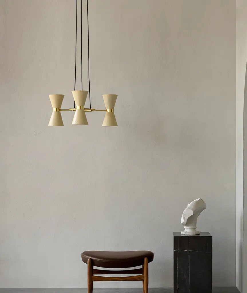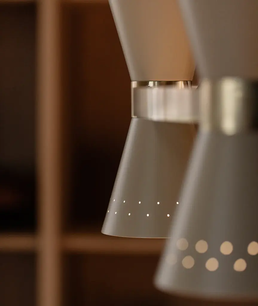 Imagined by the industrious Swedish furniture designer Alf Svensson in the 1950s, Chandelier 3 is one of three lighting designs in the Collector series. Shaped from a central band of solid brass, six conical metal shades direct the light upwards and downwards to illuminate with ambient light. Small perforations in each shade disperse the light outwards, creating intriguing shadows. The sophisticated mid-century design has timeless appeal thanks to its considered combination of graphic beauty and classic elegance. Not only functional, it is also a decorative lighting fixture in any space. One of three light fixtures created in the 1950s by Swedish designer Alf Svensson, the Chandelier 5 presents a statement-making mid-century aesthetic. Its band of solid brass holds ten geometric metal shades which direct light both upward and downward. Small perforations in the shades allow further light to shine through. Its timeless look, typical of the Scandinavian Modern period in which it was designed, lends itself to any setting, making it equally at home as an illuminating feature in a public or private space.