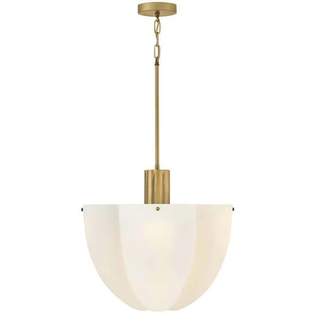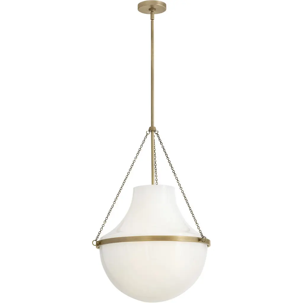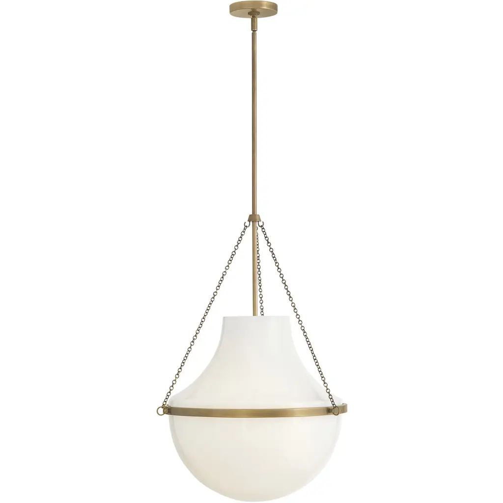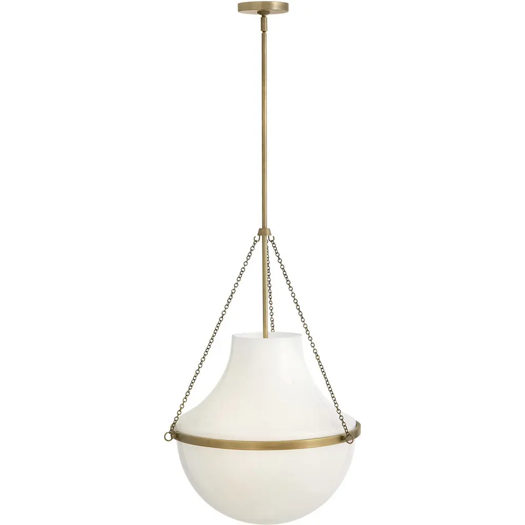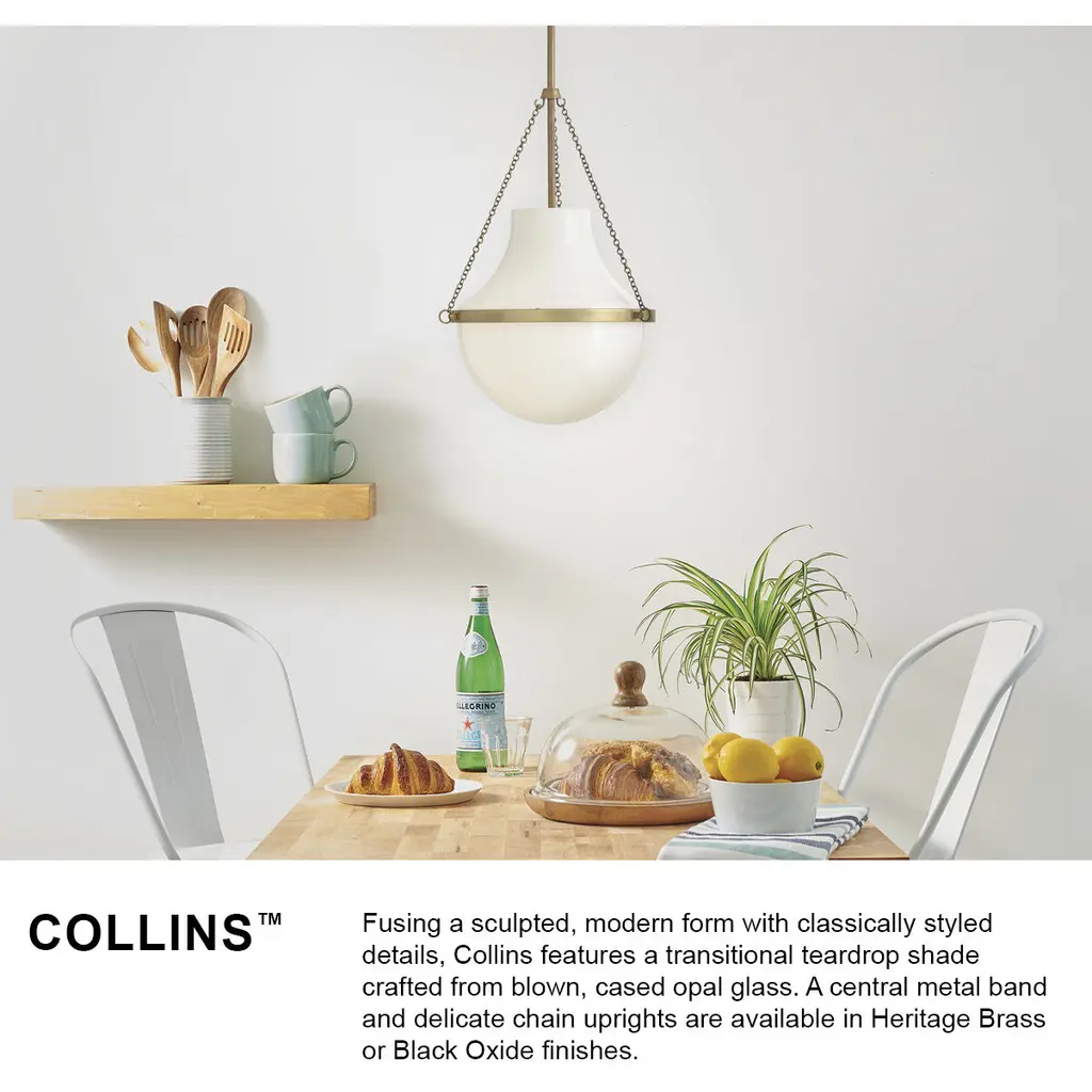 Fusing a sculpted, modern form with classically styled details, Collins features a transitional teardrop shade crafted from blown, cased opal glass. A central metal band and delicate chain uprights are available in Heritage Brass or Black Oxide finishes.
