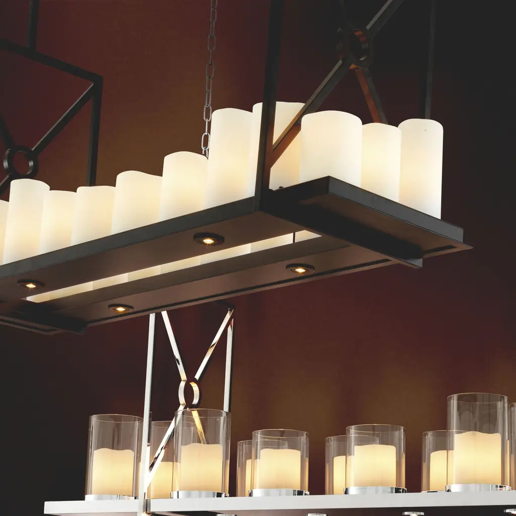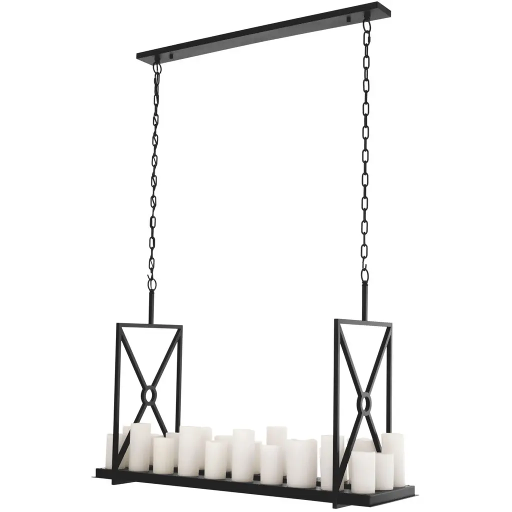 The robust black finished frame of the Commodore Chandelier comprises two square panels with an integrated x-shaped design and a rectangular tray with 22 faux pillar candles and 4 recessed LED downlights. The lights in this chandelier can be turned on and off by using the included remote control. Several different settings are possible. This chandelier is not dimmable and cannot be used with a dimmer. Create a warm and welcoming ambience with the Commodore Chandeliers. Combining the soft glow of candlelight with gothic appeal and industrial modernity, these distinctive chandeliers will make a radiant addition to your interior scheme.