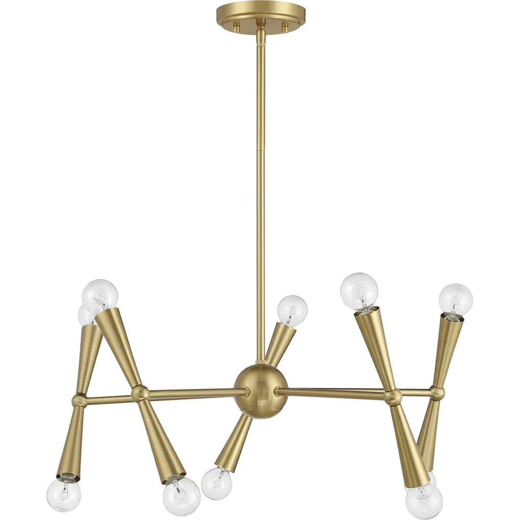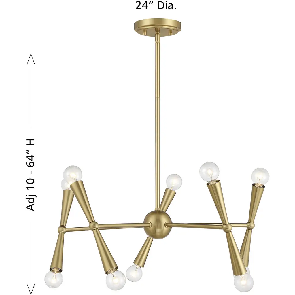 Make a scene with the unique silhouette of this 10-light chandelier Cone-shaped arms finished in Natural Brass burst forth from the center, jutting out at jaunty angles and bearing bare bulbs to let the light shine brightly. This chandelier is 24" in width and has an adjustable height ranging from 10" to 64". Comes with four 12" downrods and one 6" downrod. Uses 10 candelabra size bulbs of up to 60 watts per bulb. We recommend using globe-shaped bulbs for heightened appeal. Bulbs not included.