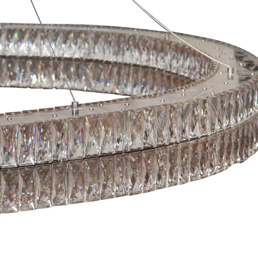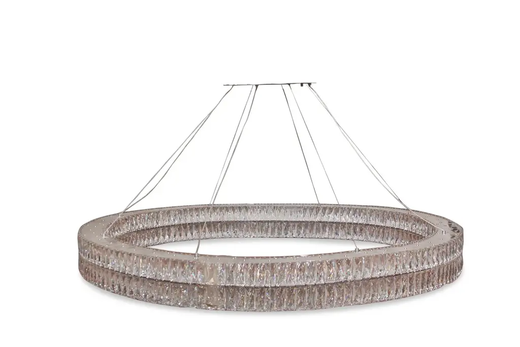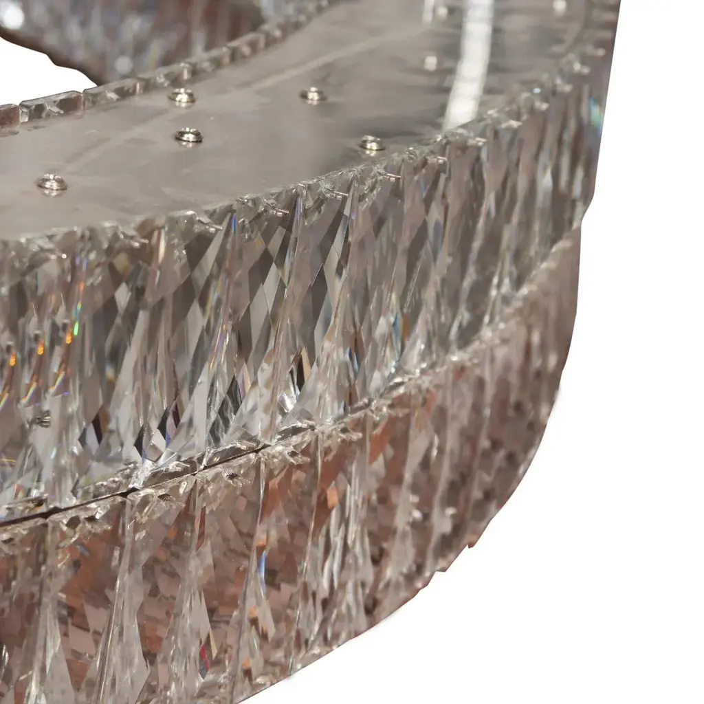The straight and curved lines of this elegant chandelier demonstrate the luxe design of 1960s European lighting, faceted crystals prisms that are hand-set in homogeneous concentric circles within a chrome frame and suspended from slender wires, shining in perfect harmony and creating a sparkling focal point overhead. Dimensions: 58” Dia x 6” W x 6”H - Overall Height: 36”H Unmarked Item