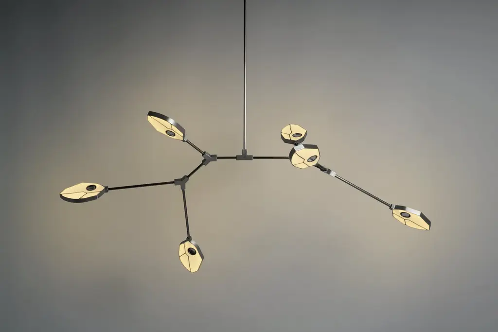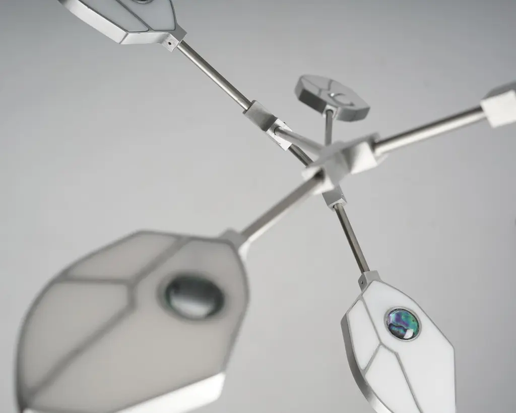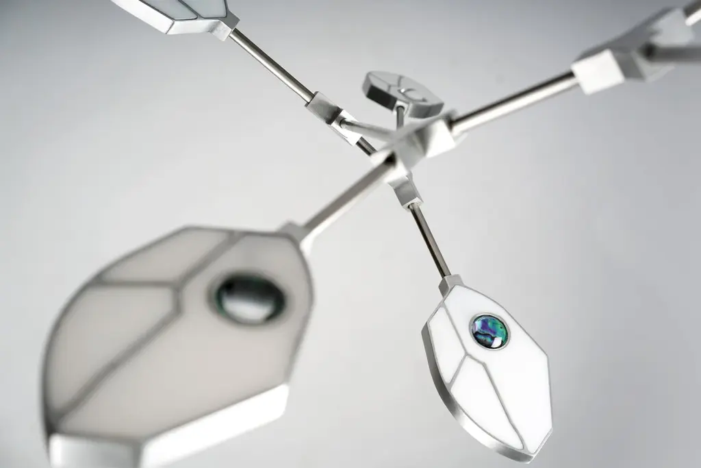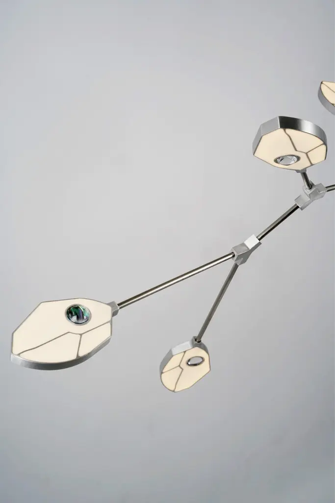 Taking inspiration from the necessity of light for life, the Joni range is a portrayal of photosynthesis, the process by which plants convert sunlight to food. Within each leaf-like LED light structure, a crystal hemisphere magnifies an iridescent Páua shell, native to New Zealand’s east coast and a nod to the designer Matt Holleman's heritage. The piece is available in brass, nickel or blackened-bronze finish as standard with alternative finishes available on request.The given height excludes stem length which is made to order. As this piece is handmade from our Swedish workshop it is fully customisable on request. We are always happy to provide drawings with design/sizing suggestions if you can provide basic spatial details of your space.