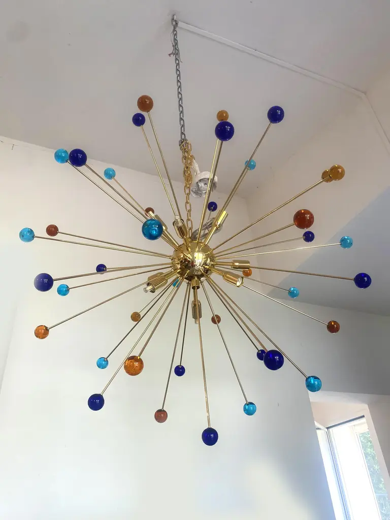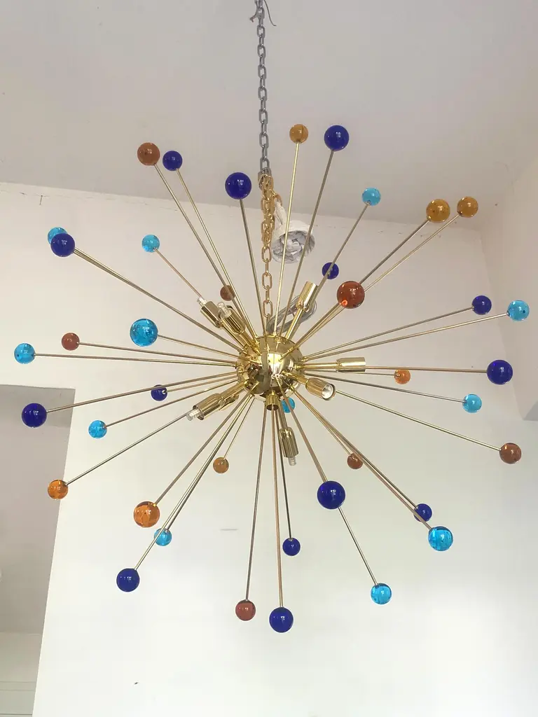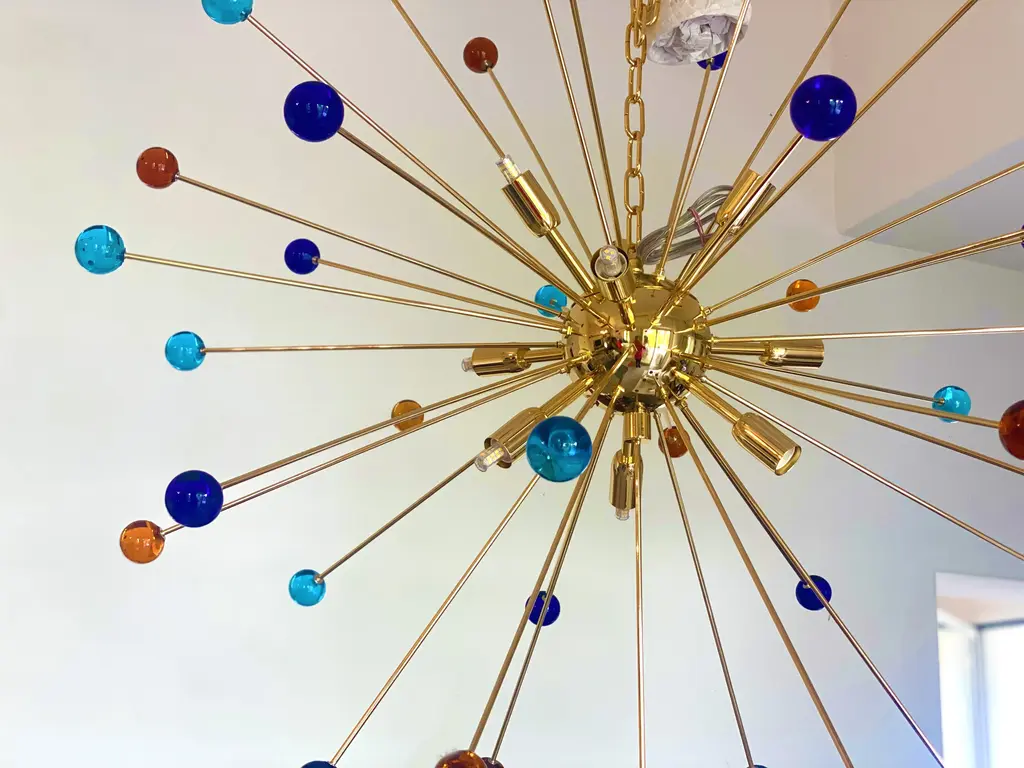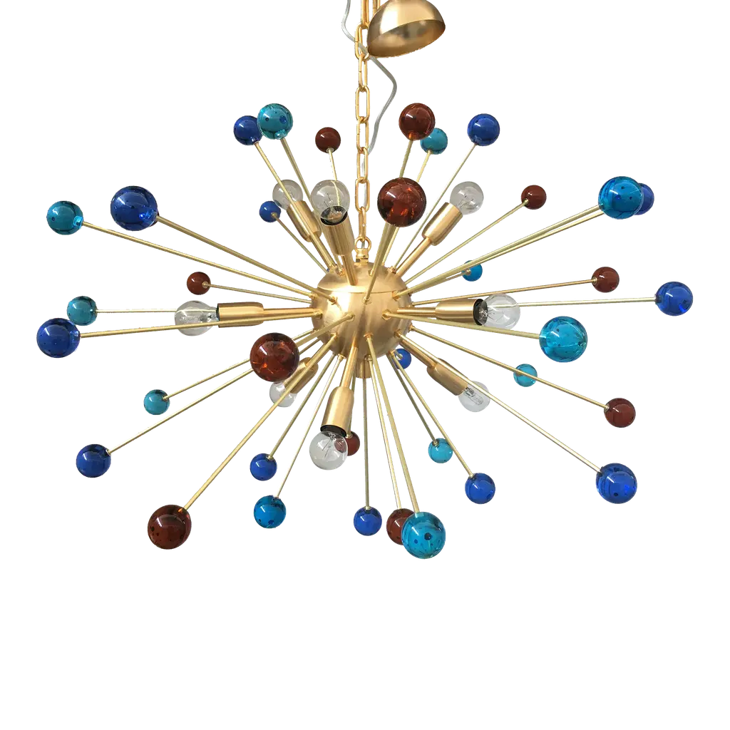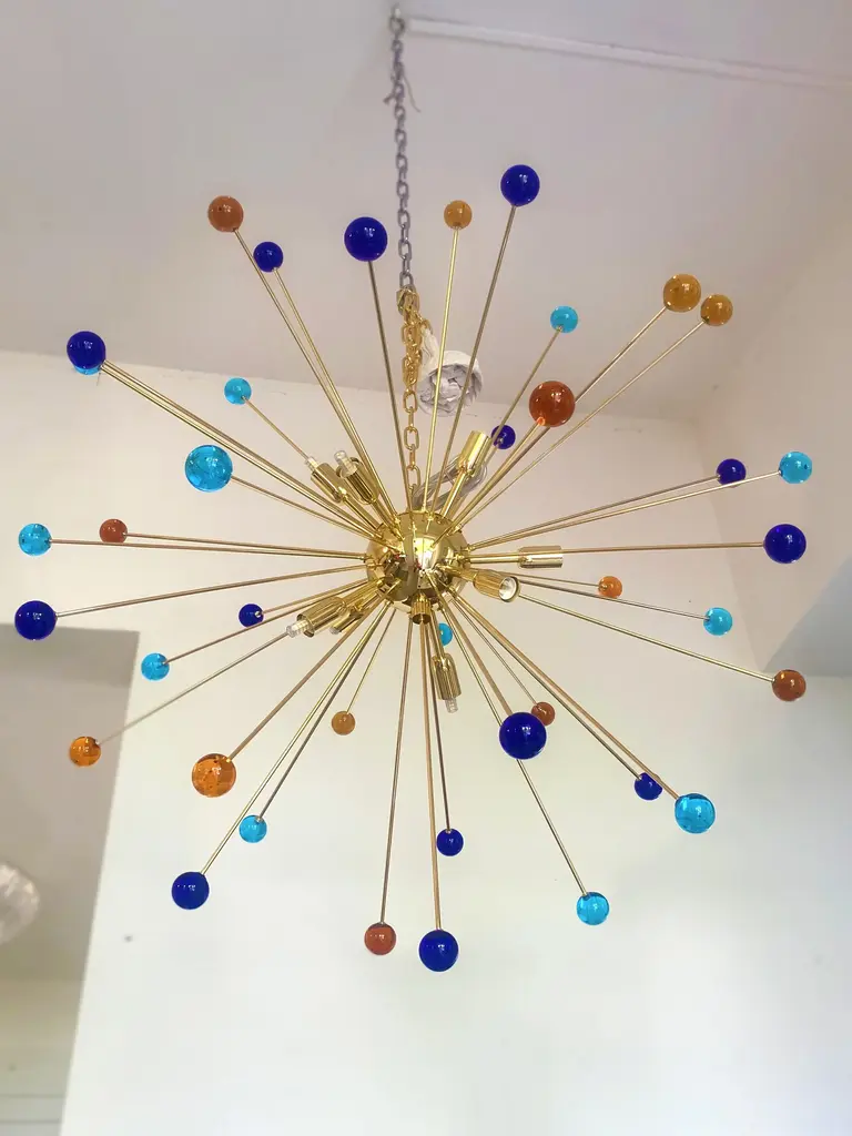 Contemporary “SPHERES” Murano glass STARSputnik chandelier. Impressive and vintage chandelier made in rare colours of spheres in vintage Murano glass. it is more bright and lively for luxury interiors. Little dark-blue, light-blue and amber “SPHERES” elements of Murano glass compose a star chandelier. Dimensions (cm/in): D 105 cm /D 39.4 ” Finiture: Gold 24K metal frame 9 bulbs All made in Italy, ship from Italy