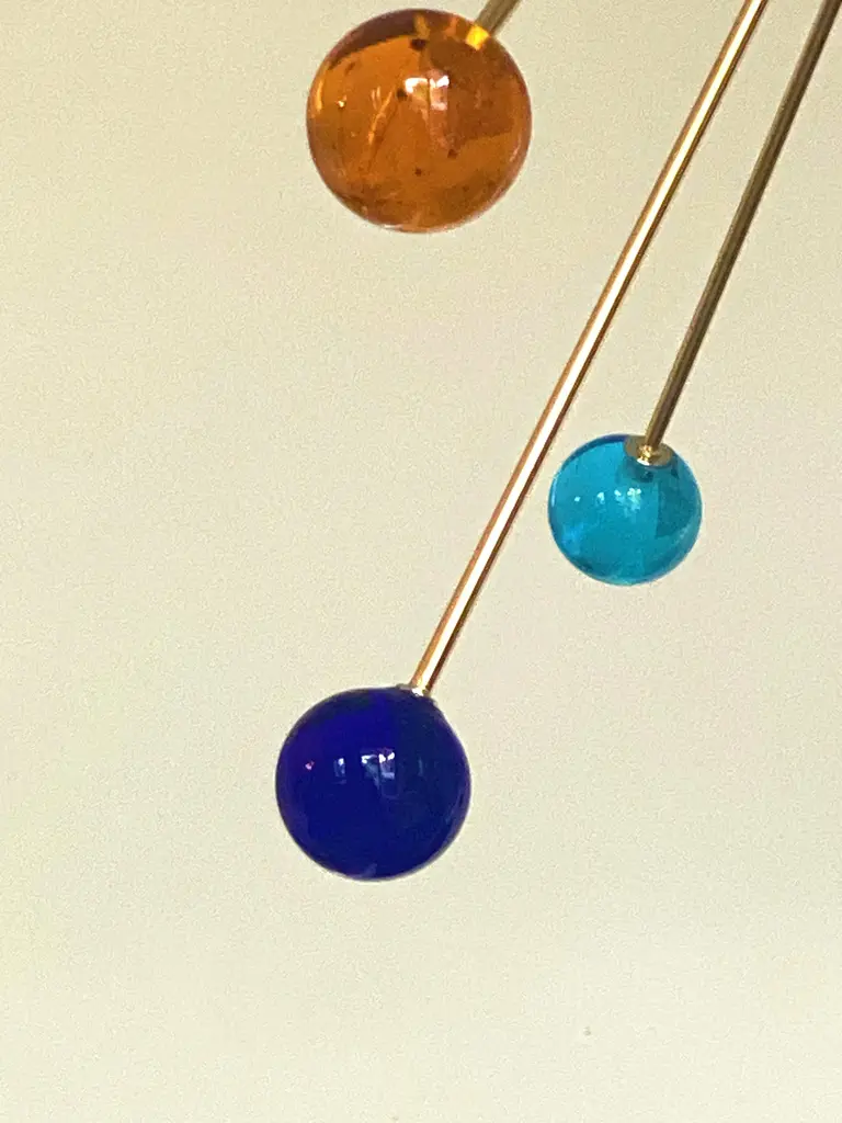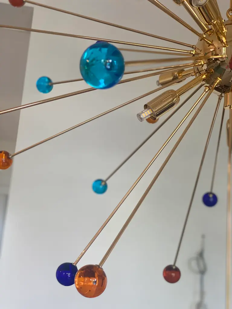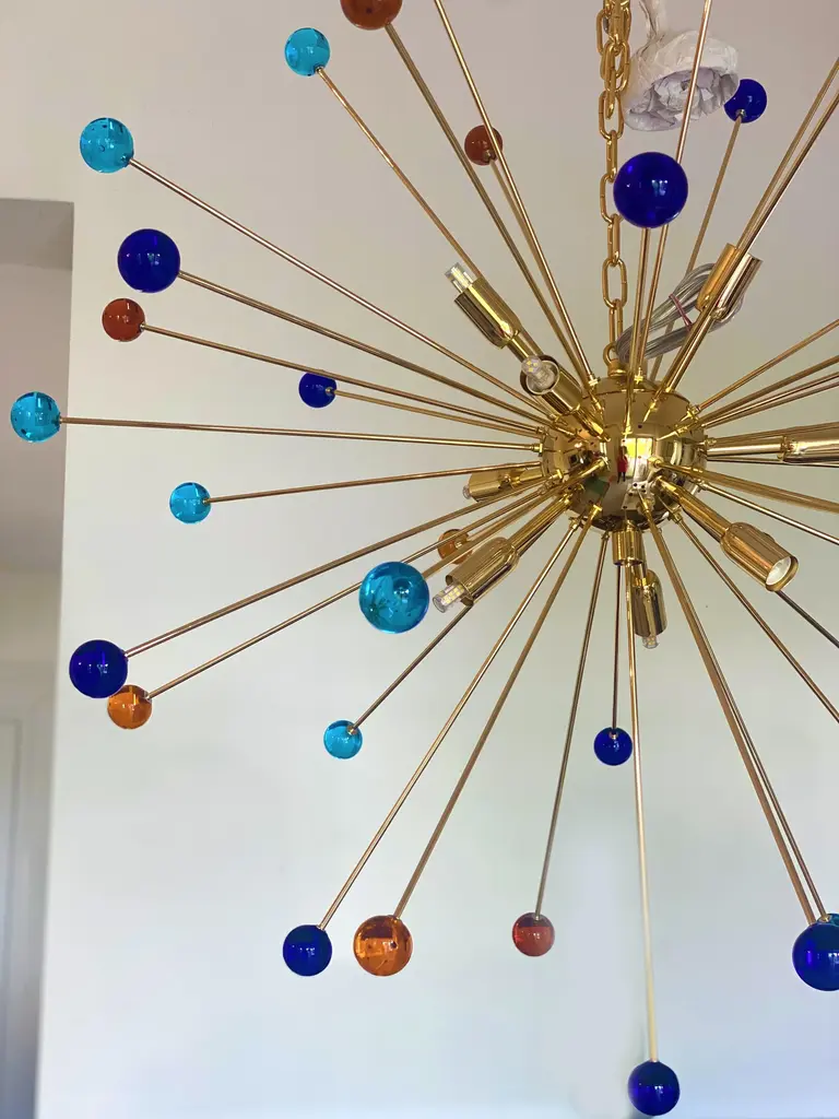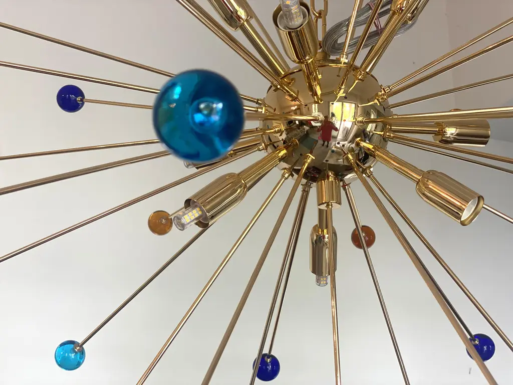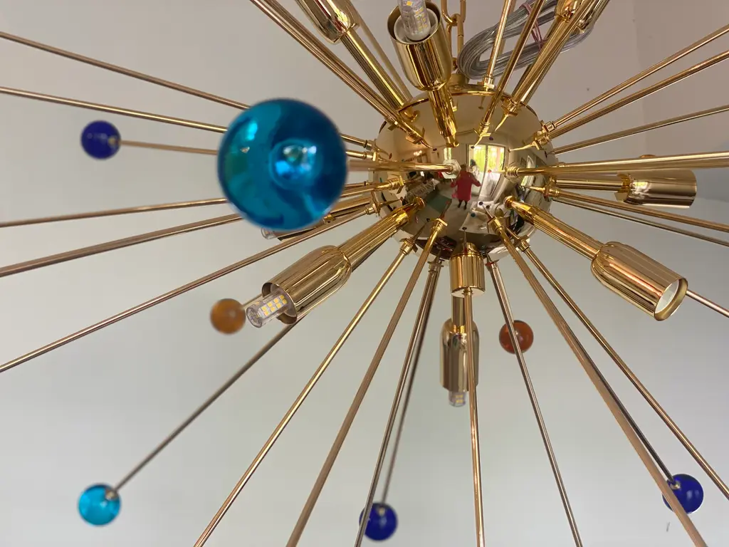 Contemporary “SPHERES” Murano glass STARSputnik chandelier. Impressive and vintage chandelier made in rare colours of spheres in vintage Murano glass. it is more bright and lively for luxury interiors. Little dark-blue, light-blue and amber “SPHERES” elements of Murano glass compose a star chandelier. Dimensions (cm/in): D 105 cm /D 39.4 ” Finiture: Gold 24K metal frame 9 bulbs All made in Italy, ship from Italy