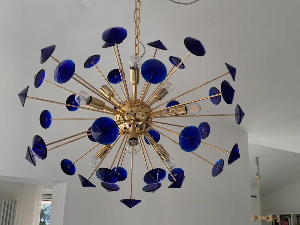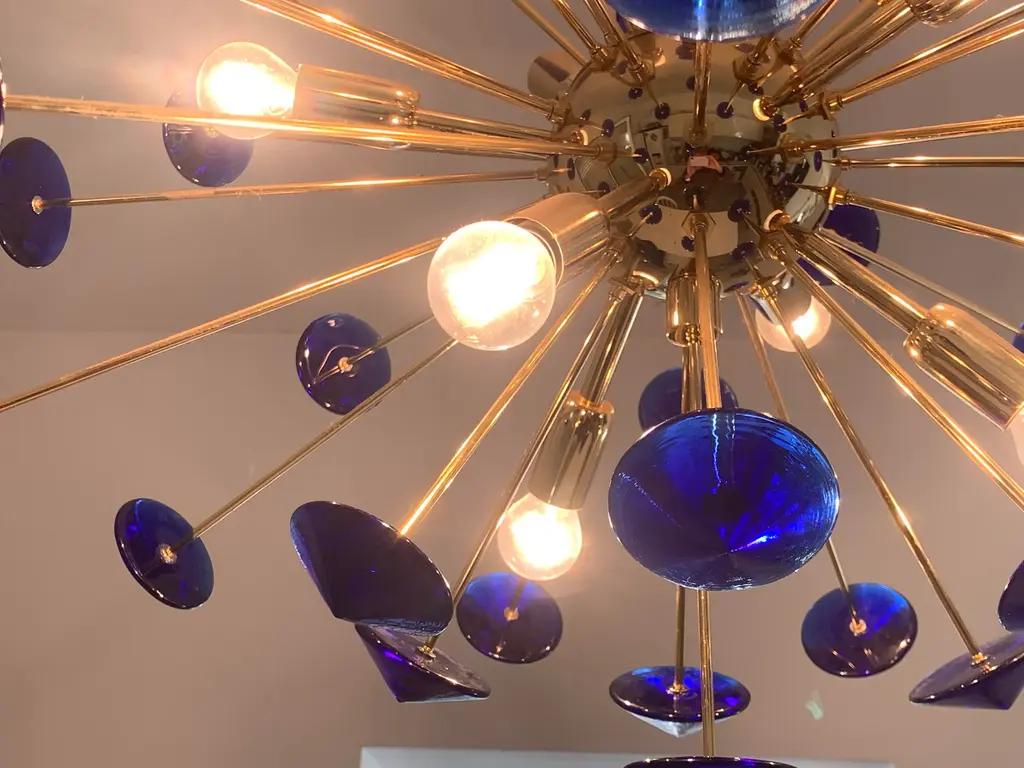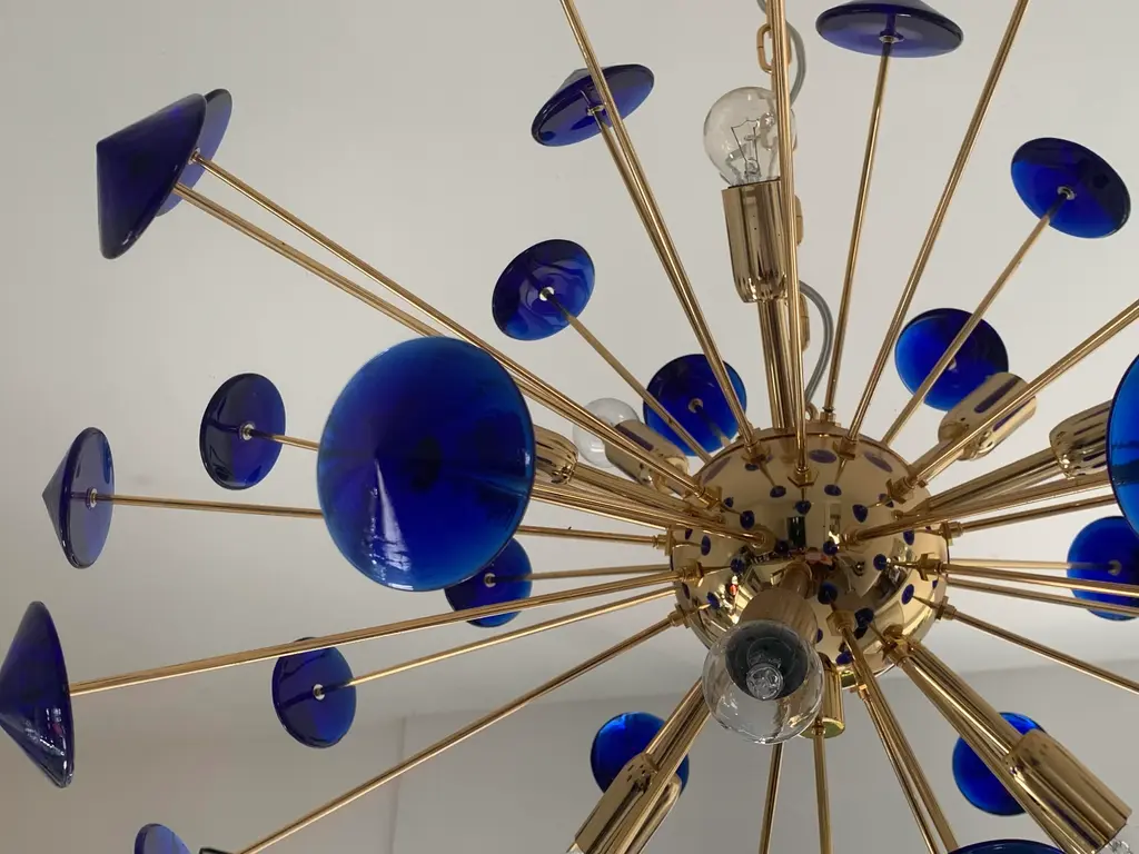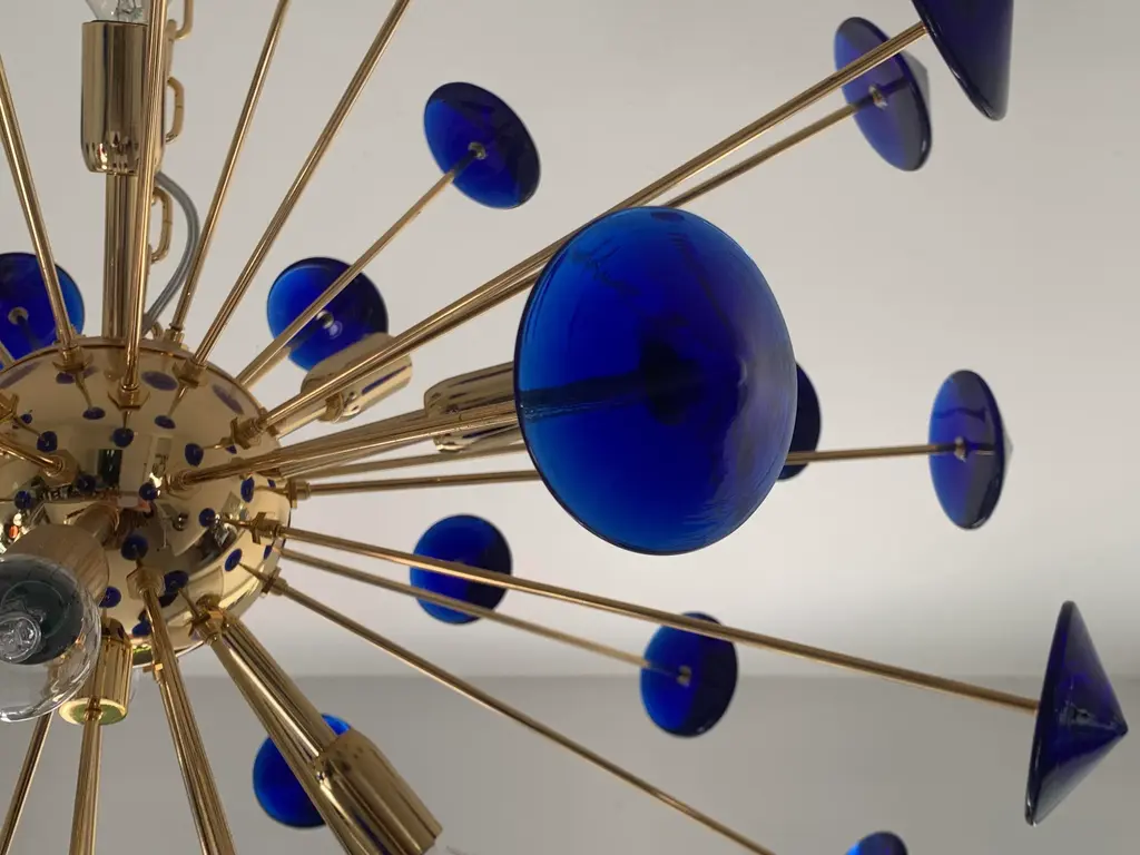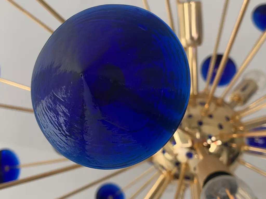 Impressive Murano Glass Sputnik Chandelier With Gold metal frame and blue color All drops are blue vintage glass from Murano . Diameter 80 cm = 31.5" Height only chandelier 60 cm = 23.6" 9 bulbs (bulbs not included) metal frame in gold 24K Spare parts murano glass included Ship from Italy and the sputnik murano glass is wire for USA