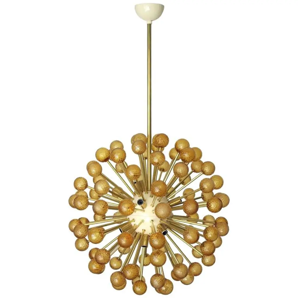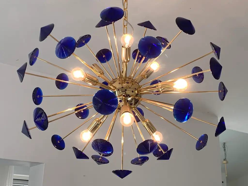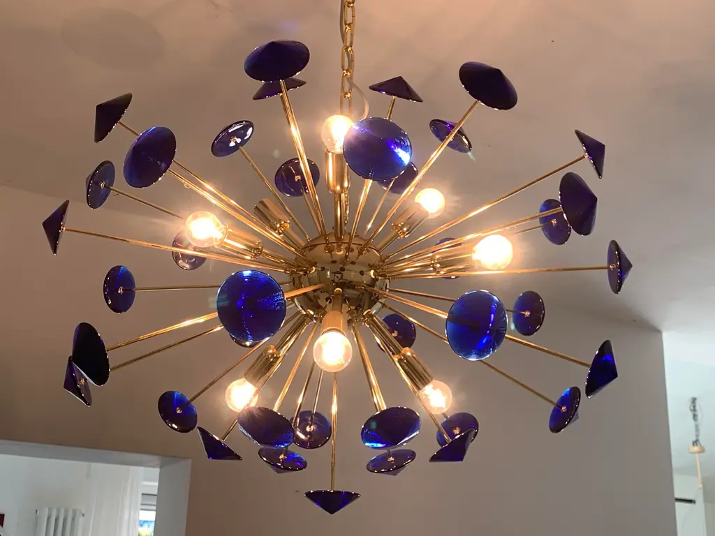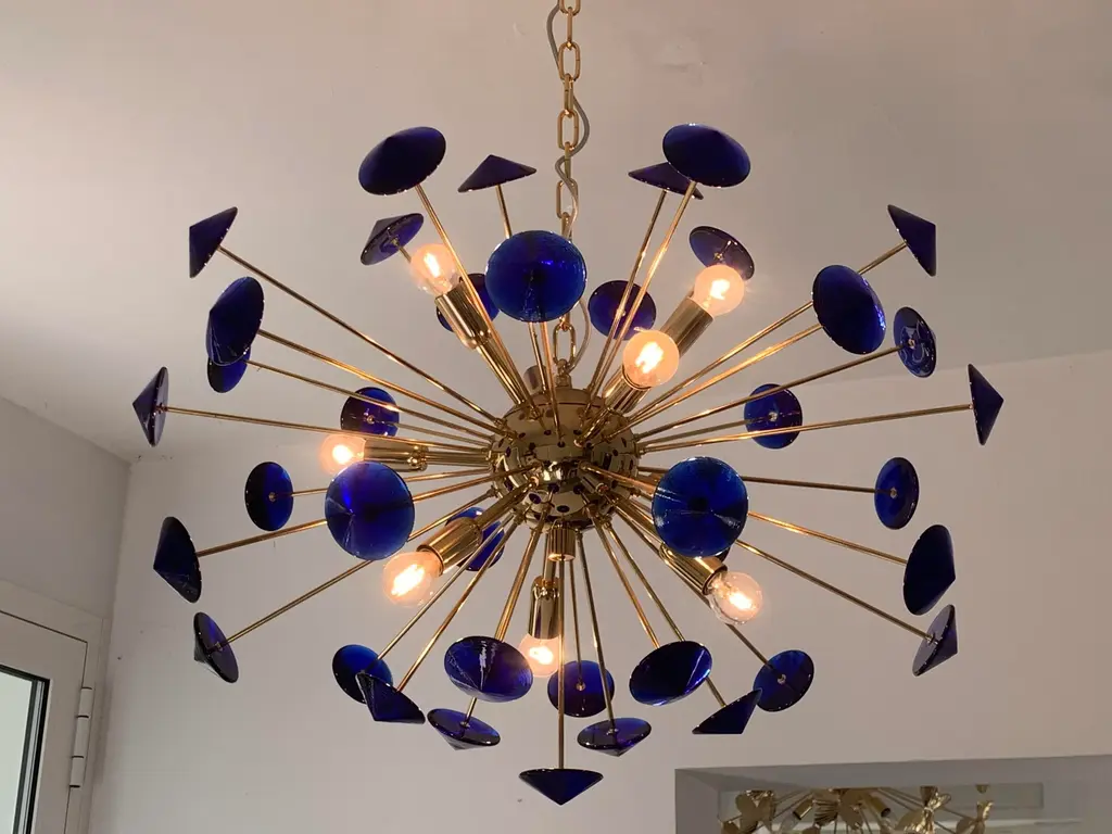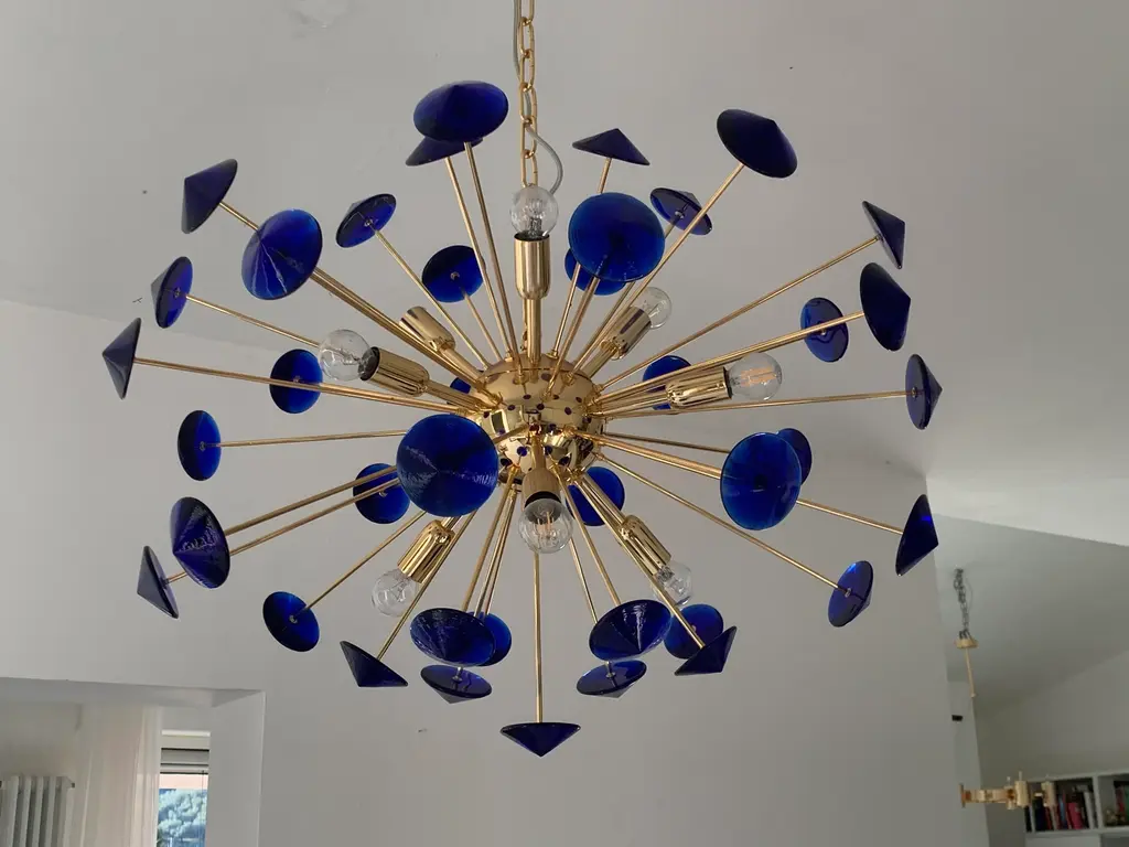 Impressive Murano Glass Sputnik Chandelier With Gold metal frame and blue color All drops are blue vintage glass from Murano . Diameter 80 cm = 31.5" Height only chandelier 60 cm = 23.6" 9 bulbs (bulbs not included) metal frame in gold 24K Spare parts murano glass included Ship from Italy and the sputnik murano glass is wire for USA