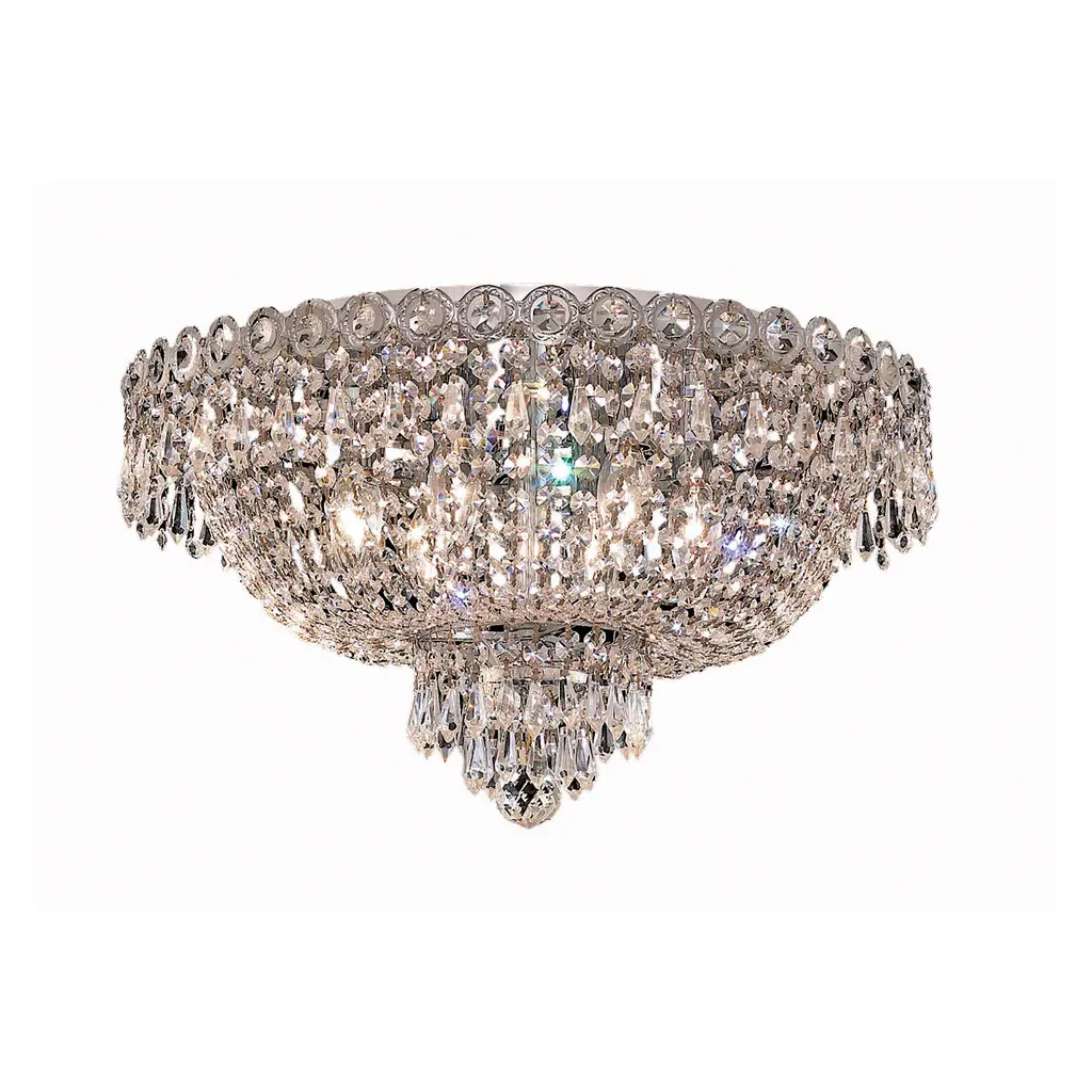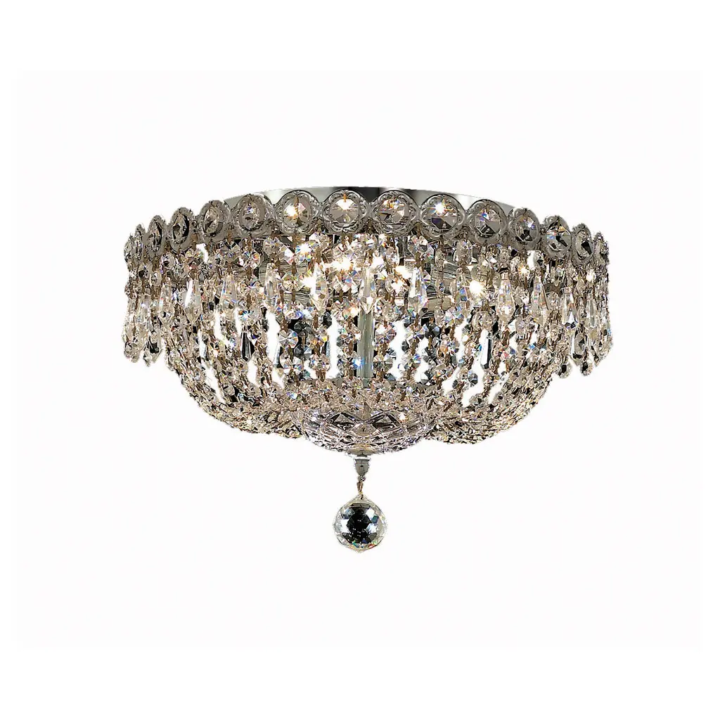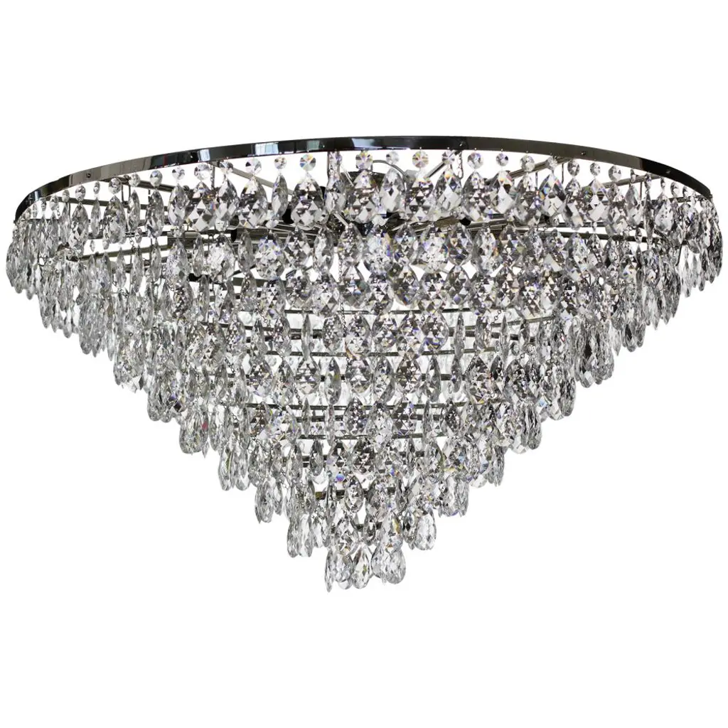 A large nickel plated crystal plafond of 47" width with hand pinned baroque almond crystals. There are 12 internal electric light bulbs which shine light outwards through the crystals to create a special light effect. Surface treatment nickel. Bulbs: 12 pcs x E-14 lamp holder 40W. Diameter; 47.2" Height; 30.7" Weight; 127lbs