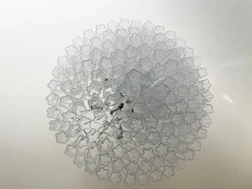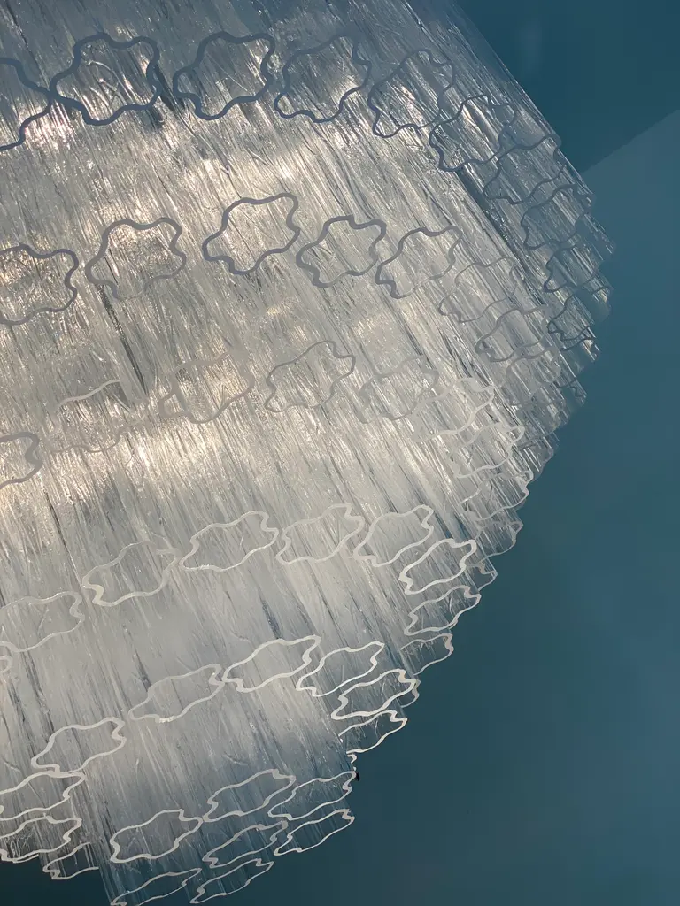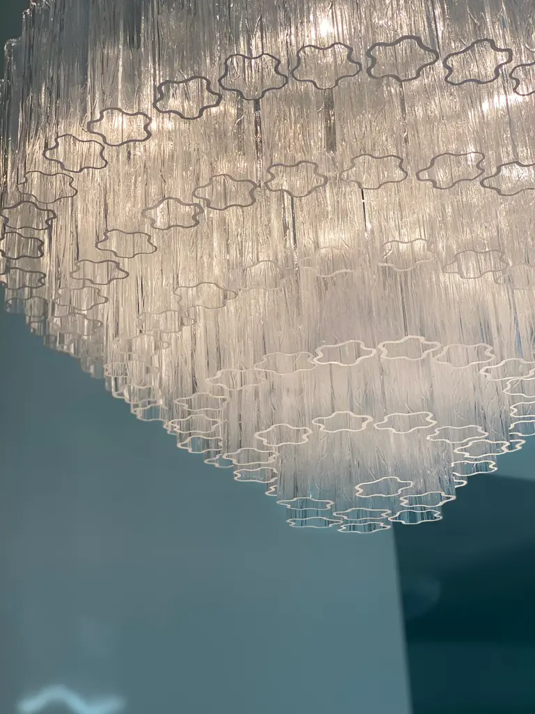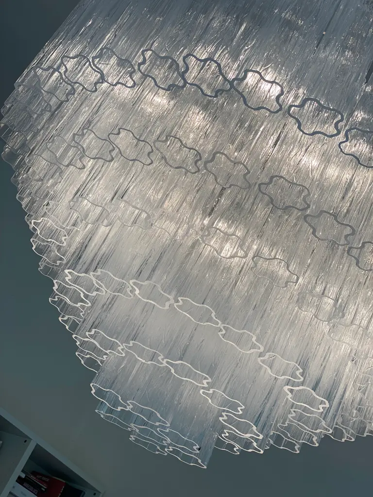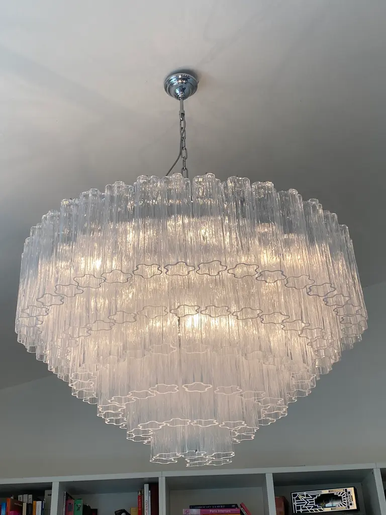 huge “TRONCHI” MURANO GLASS CHANDELIER Huge clear Murano Glass “tronchi”Chandelier. 5levels of transparent glass in Venini Style. Very elegant and impressive contemporary chandelier. “Tronchi”are blown inside a wooden mold, into which the hot glass slides. Metal frame in chromed plating bath. Spare parts are included. Bulbs not included, they are compatible with Led sustainability. Entirely made in Italy, made in Murano glass fruit of of high Italian know-how. Dimensions (cm/in): D 100 cm H 60cm/ D 39.3″ in H 23.6″ chain 19.7″ more canopy ship from Italy
