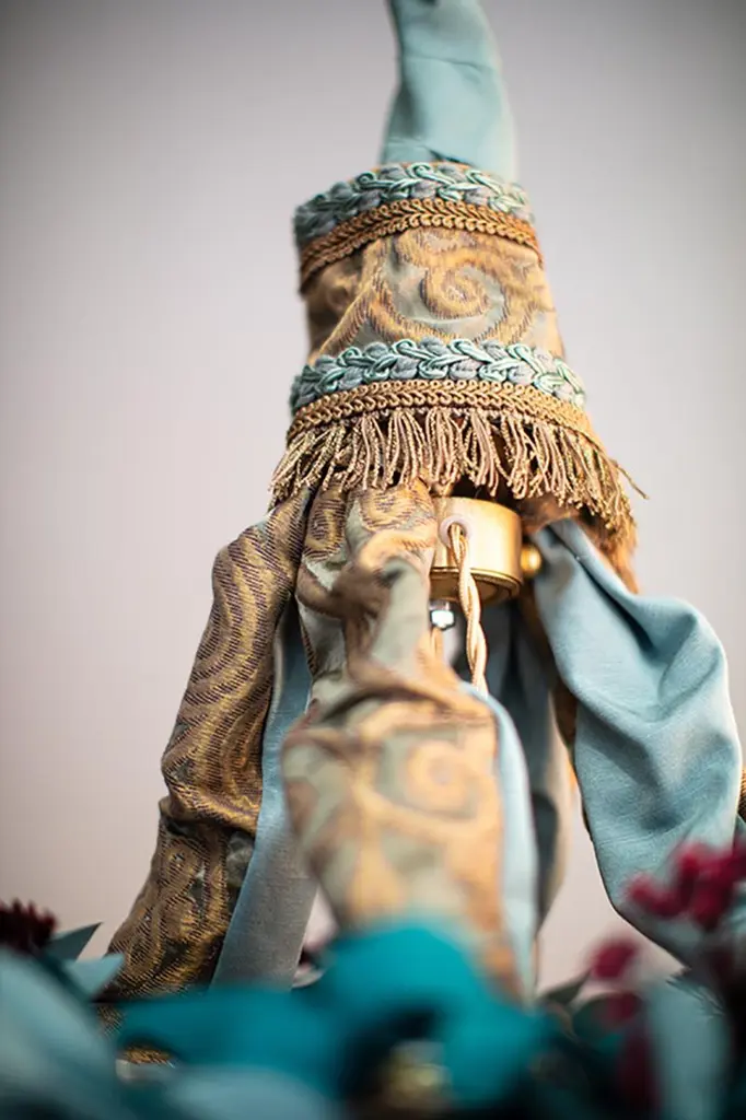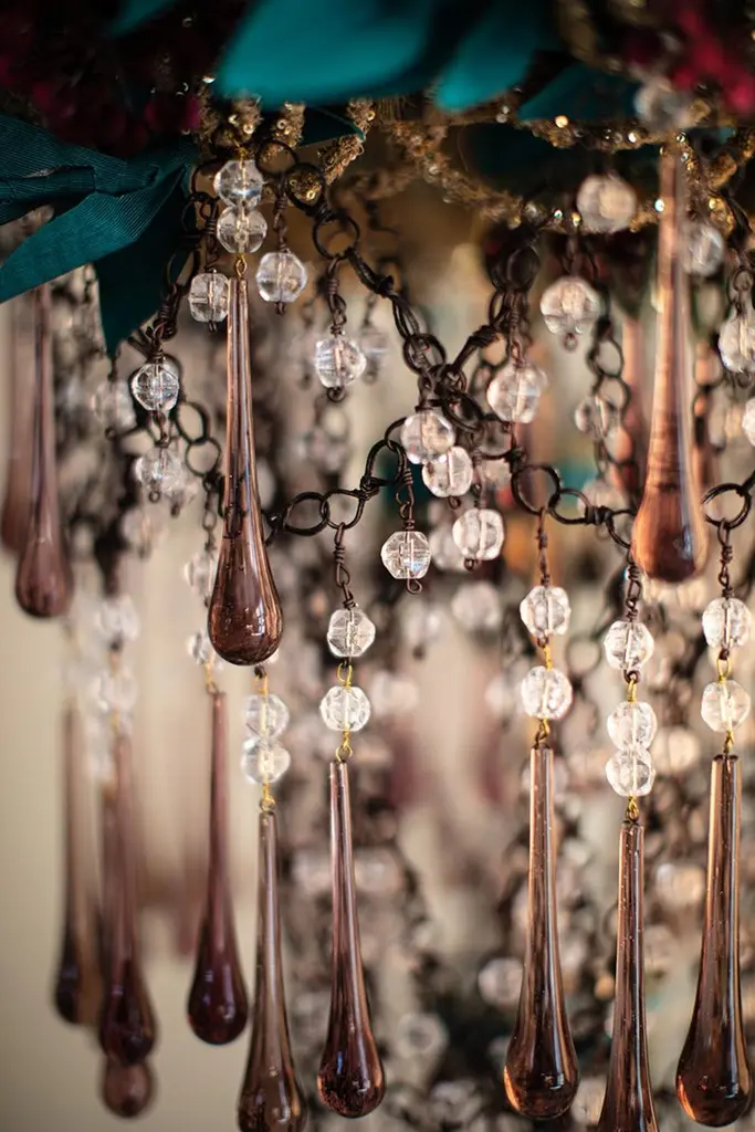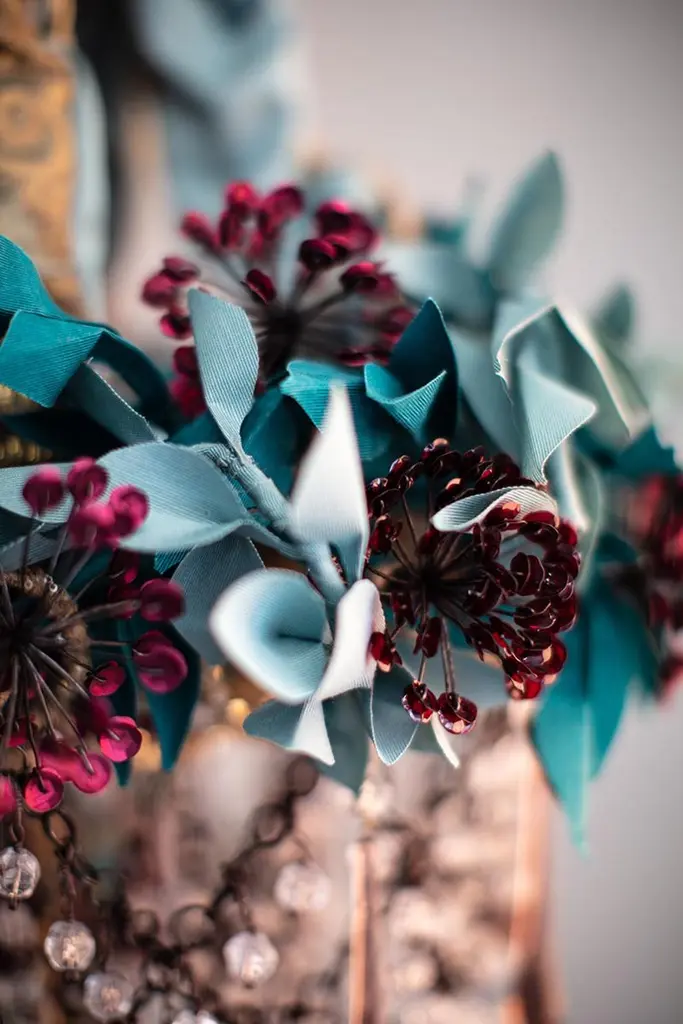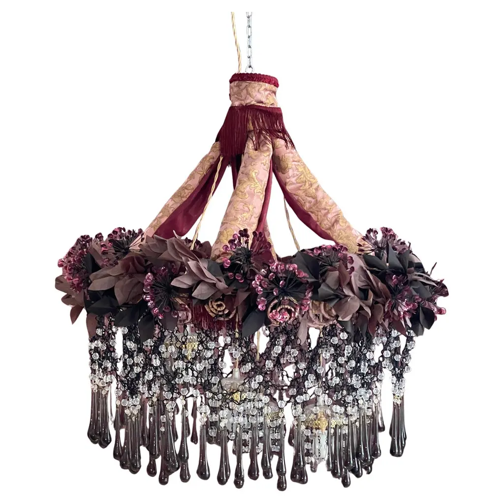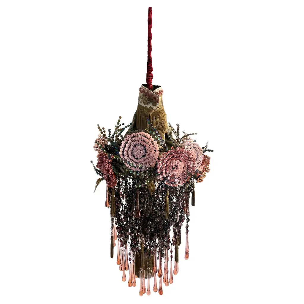 Iron Flowers MignonIron Flowers Mignon chandelier. Iron structure covered in fabric, flowers decorations handmade with iron wire and sequins, fabric leaves made with hand waxed moiré fabric. The chandelier is completed by a cascade of crystal drops, Swarovski and glass beads decorations, all made and applied by hand.