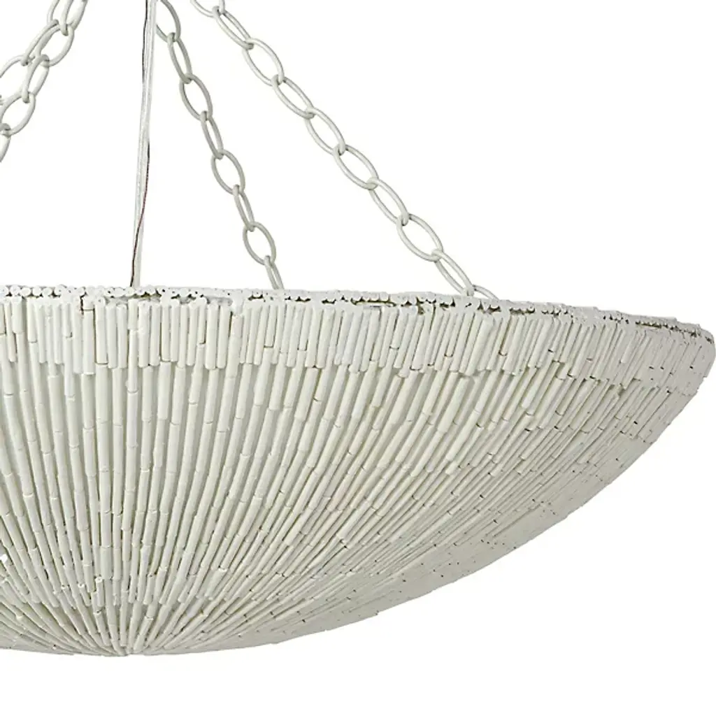 The Cora Chandelier from Palecek blends materials to create a standout visual presentation that radiates both style and character. Made from metal and intricate rattan, Cora showcases its durability and natural beauty, while its single-tier design maintains simplicity while making a bold statement in your living space. The fiberglass shade material casts a warm and inviting glow, enhancing your ambiance. Cora stays suspended in midair through attachment to link chains secured by a ceiling canopy.