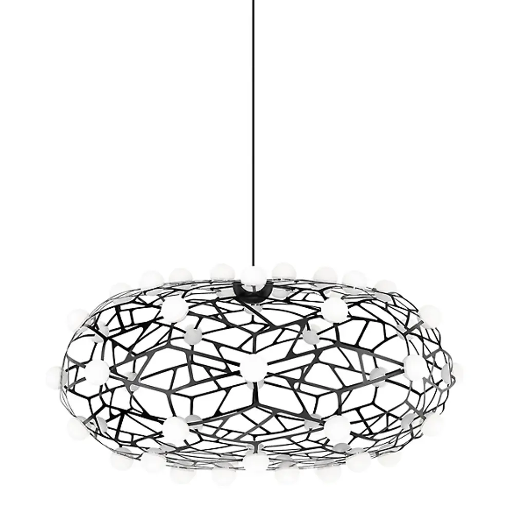 The Coral LED Chandelier by Matteo Lighting is an elegant, intricate addition to spaces. Suspended by a single cord, the airy, oval-shaped silhouette of this design is crafted from a beautifully finished frame with a web-like construction that has a geometric feel. Scattered throughout the form of this sophisticated chandelier, glass accents add a dazzling touch, allowing this bright piece to make a statement in the rooms it illuminates.