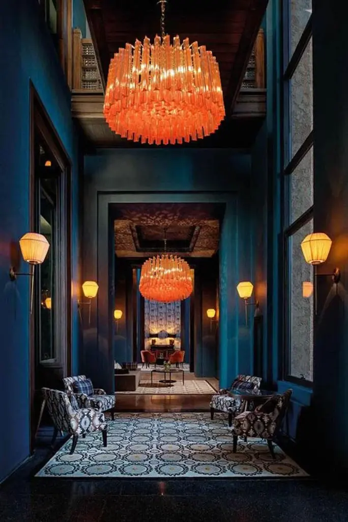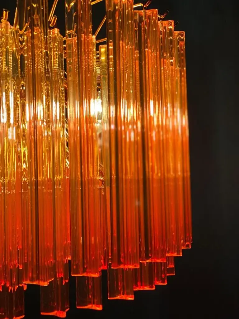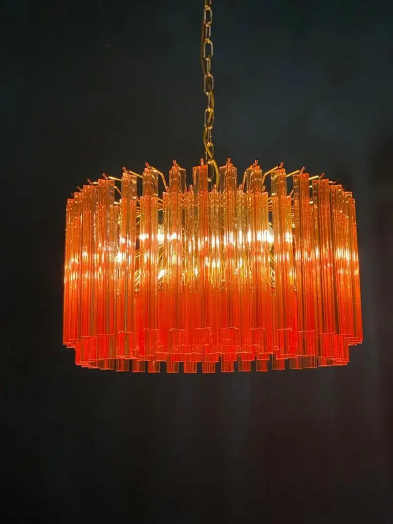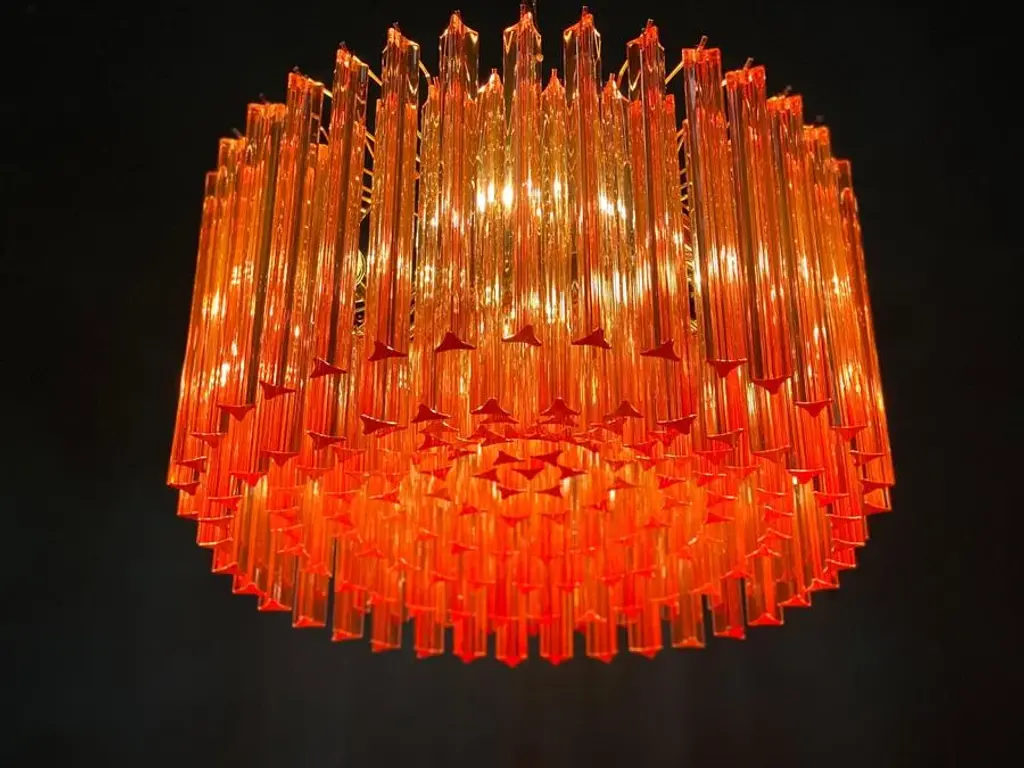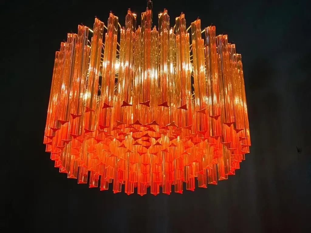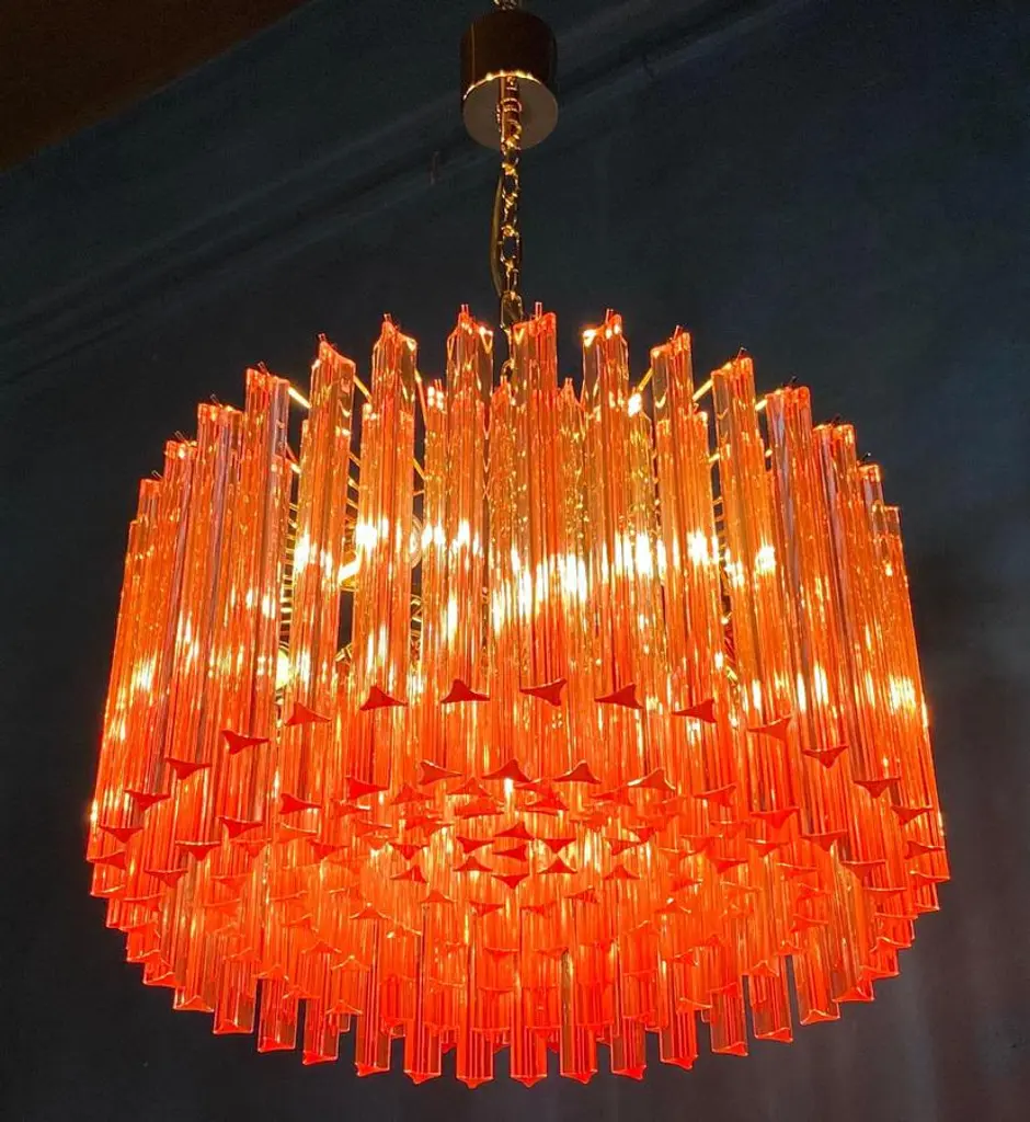 Fabulous murano glass chandelier with more than 200 coral color triedri on brass frame. Dimensions: 43.30 inches (110 cm) height with chain; 13 inches (33 cm) height without chain; 23.5 inches (60 cm) diameter. Light bulbs: 6 light bulbs: E27 dimension (not included in the sale), suitable for the American electrical system. Condition: Perfect condition and fully working. Up to 250V (Europe/UK Standard).The wiring of this item may be original and might need replacement, if not specified otherwise.