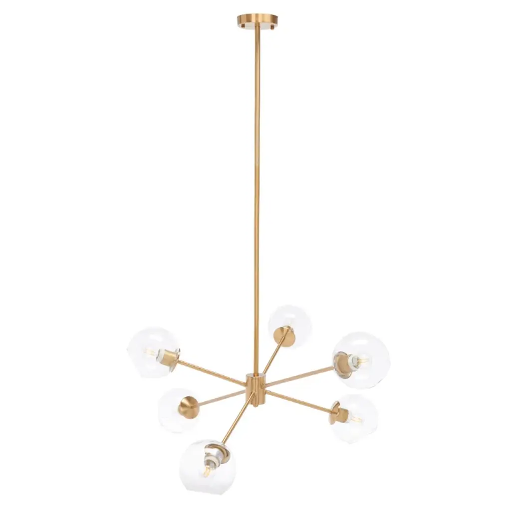 An eye-catching modern take on Sputnik-style lighting, this substantial chandelier balances gold-finished steel framing with six sparkling glass globe shades. It includes long-lasting LED bulbs with a vintage-inspired, filament-like glow. Install it with a dimmer switch for adjustable ambiance.