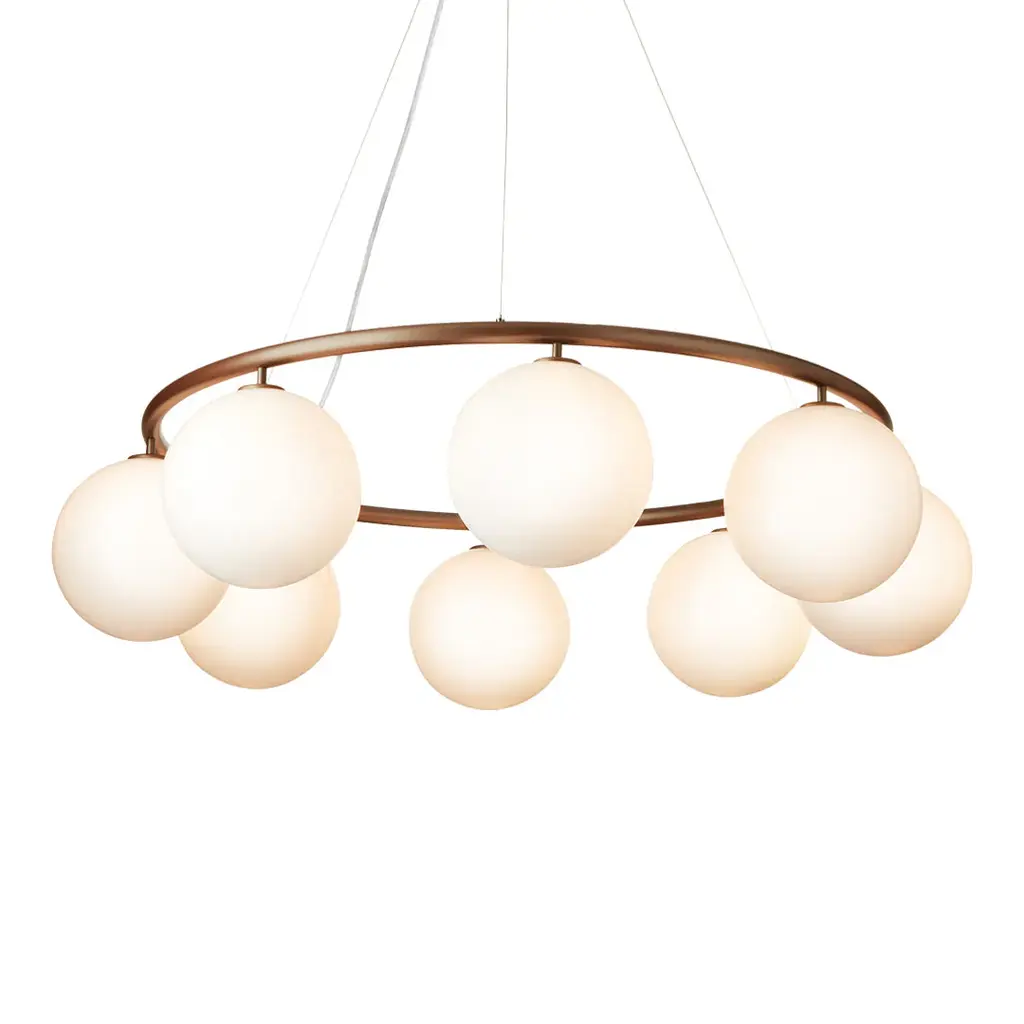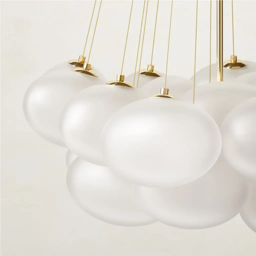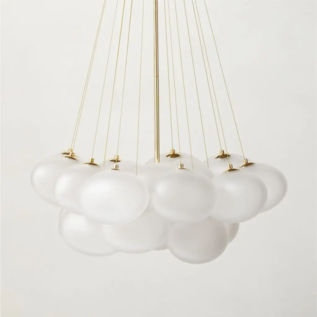 Descending in luminous droplets, Balutto Associati's cluster of frosted glass spheres emits a soft, comforting glow. Anchored by a center pole, each of the 16 globes is suspended from unlacquered polished brass downrods that converge in an unlacquered polished brass base at the ceiling. Over time, the unlacquered brass will develop a uniquely beautiful patina. This chandelier is an unusual, enticing showstopper anywhere, but it becomes an enduring conversation piece in the dining room. CB2 exclusive.
