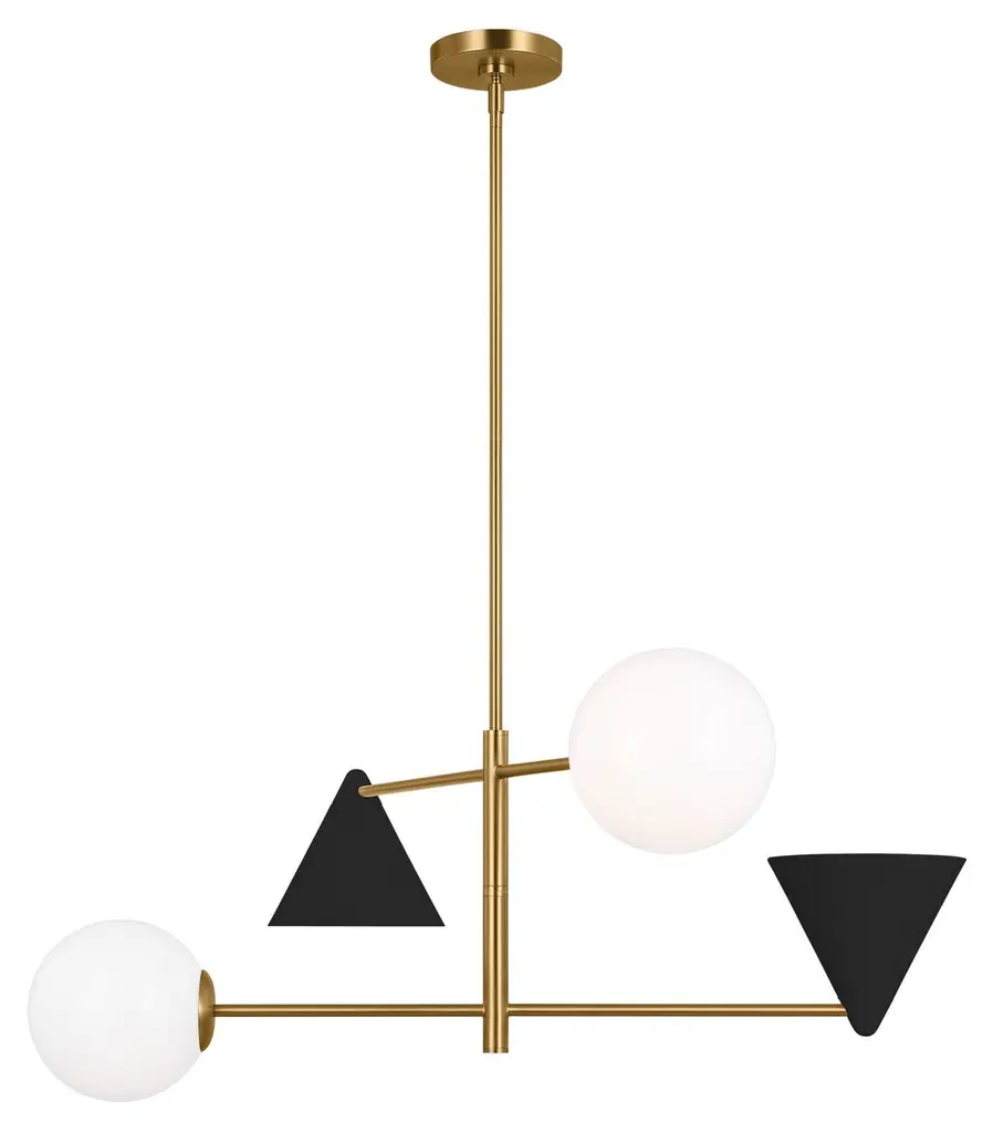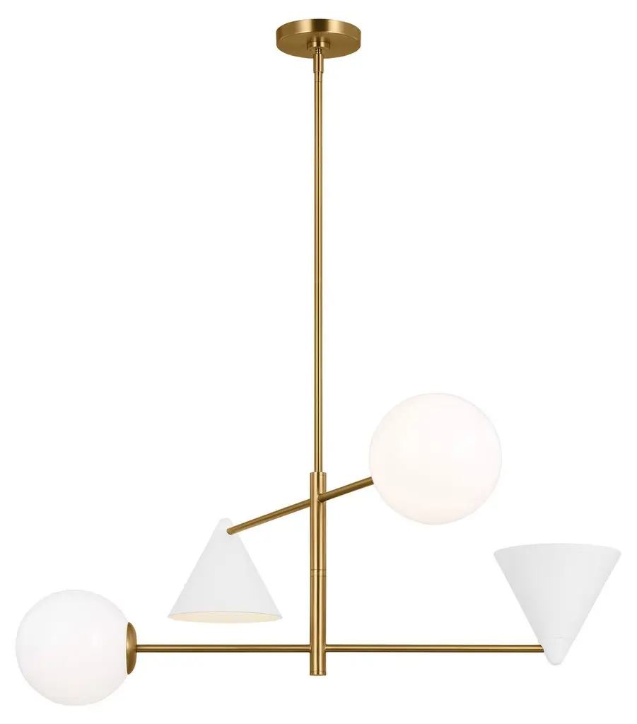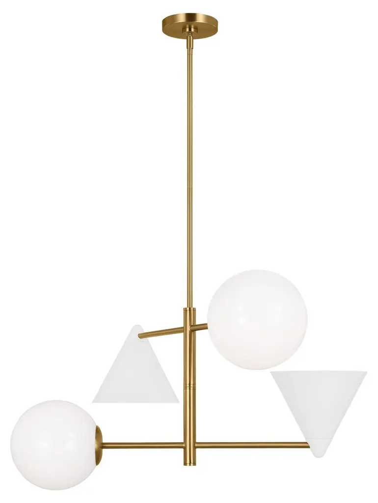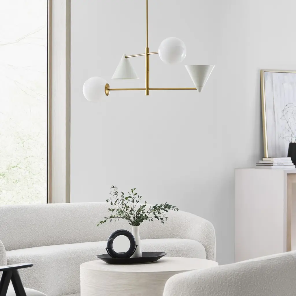 Who knew geometry could be so chic? This four-arm chandelier features two triangular metal shades and two glass globes connected to slender rods given a burnished brass finish. Because the chandelier is damp rated, you can hang it in your bathroom as well as just about anywhere else in your home.