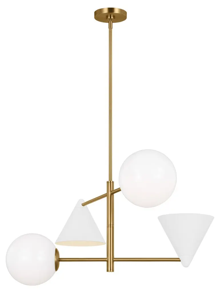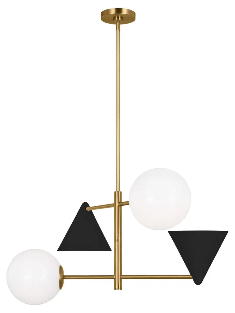 Who knew geometry could be so chic? This four-arm chandelier features two triangular metal shades and two glass globes connected to slender rods given a burnished brass finish. Because the chandelier is damp rated, you can hang it in your bathroom as well as just about anywhere else in your home.