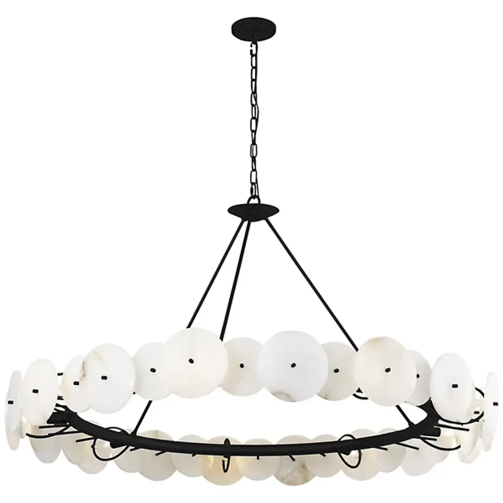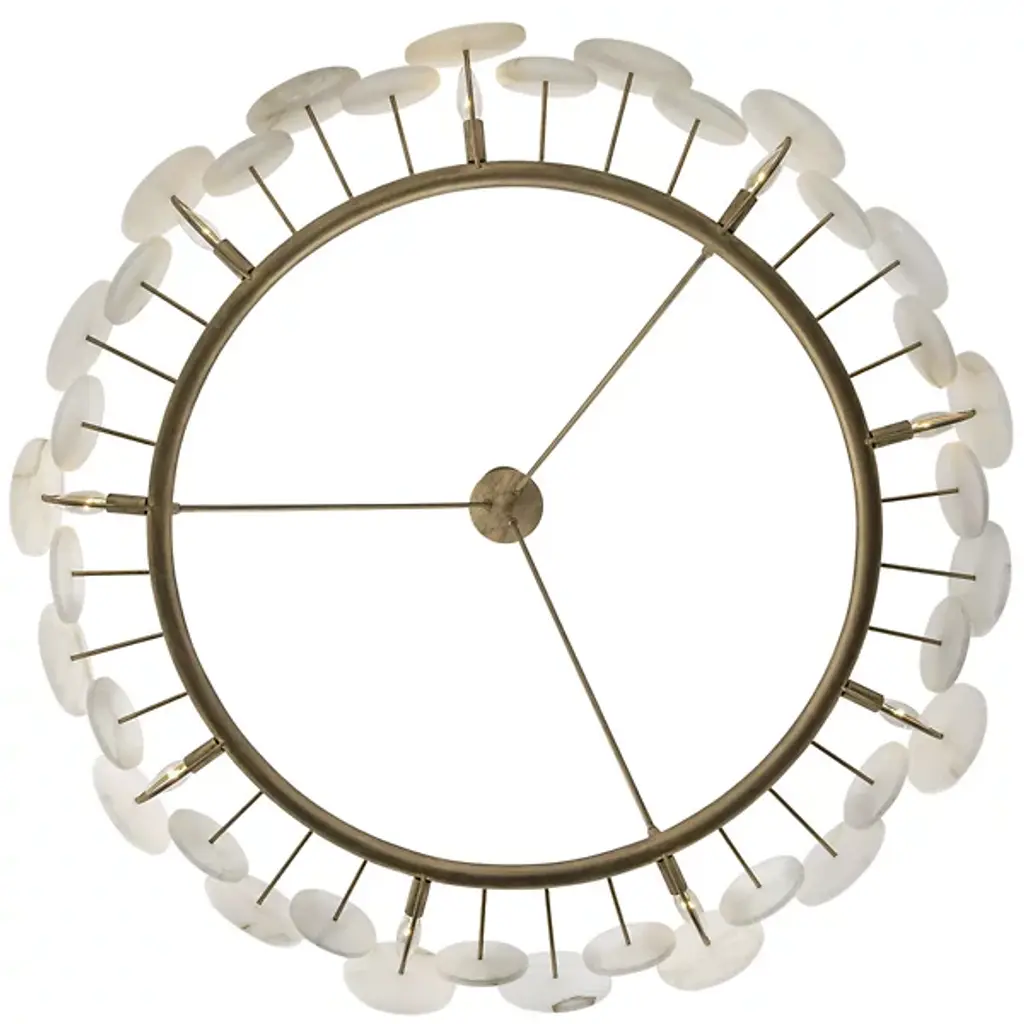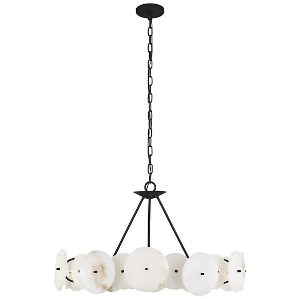 The modern and milky way to brighten your space. The Varaluz Cosmos Chandelier from the Smithsonian collection uses multiple overlapping discs of genuine alabaster to create a solid ring around the bulbs within, both disguising them and diffuse their light into warm ambience. The bulbs are themselves evenly arranged around a ring-shaped frame, which is made entirely of recycled steel. Use this chandelier to provide a unique, industrial lux focal point over a dining table or in a living area.