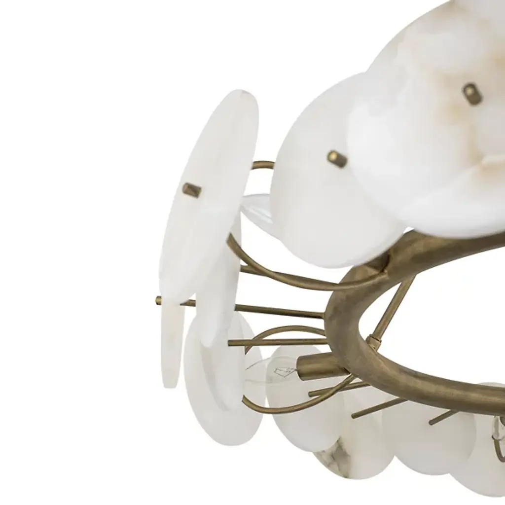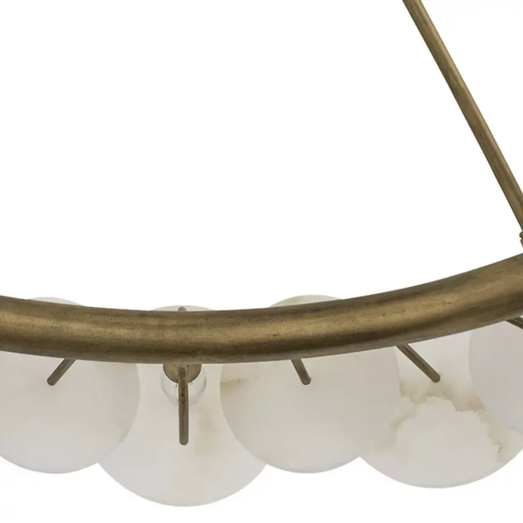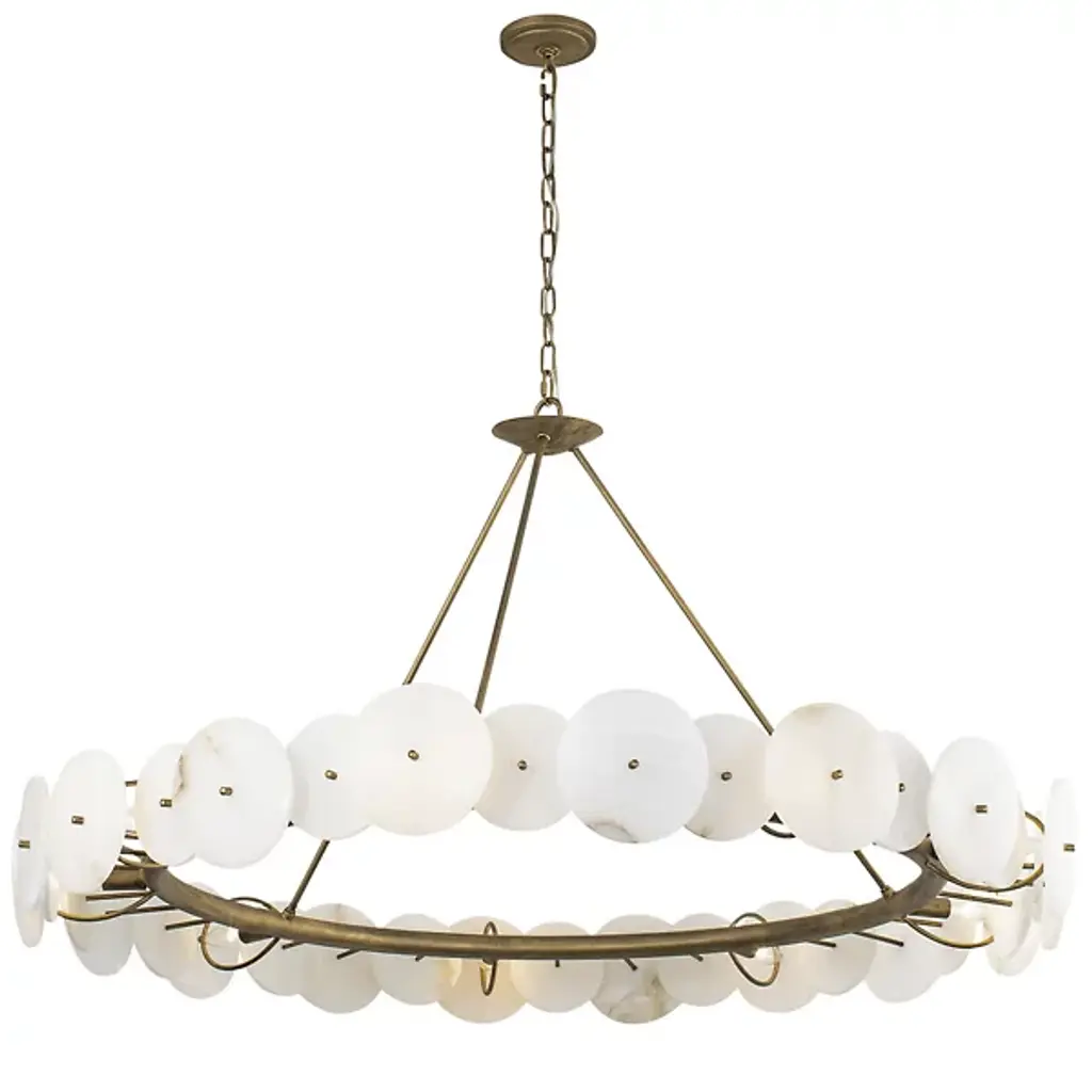 The modern and milky way to brighten your space. The Varaluz Cosmos Chandelier from the Smithsonian collection uses multiple overlapping discs of genuine alabaster to create a solid ring around the bulbs within, both disguising them and diffuse their light into warm ambience. The bulbs are themselves evenly arranged around a ring-shaped frame, which is made entirely of recycled steel. Use this chandelier to provide a unique, industrial lux focal point over a dining table or in a living area.