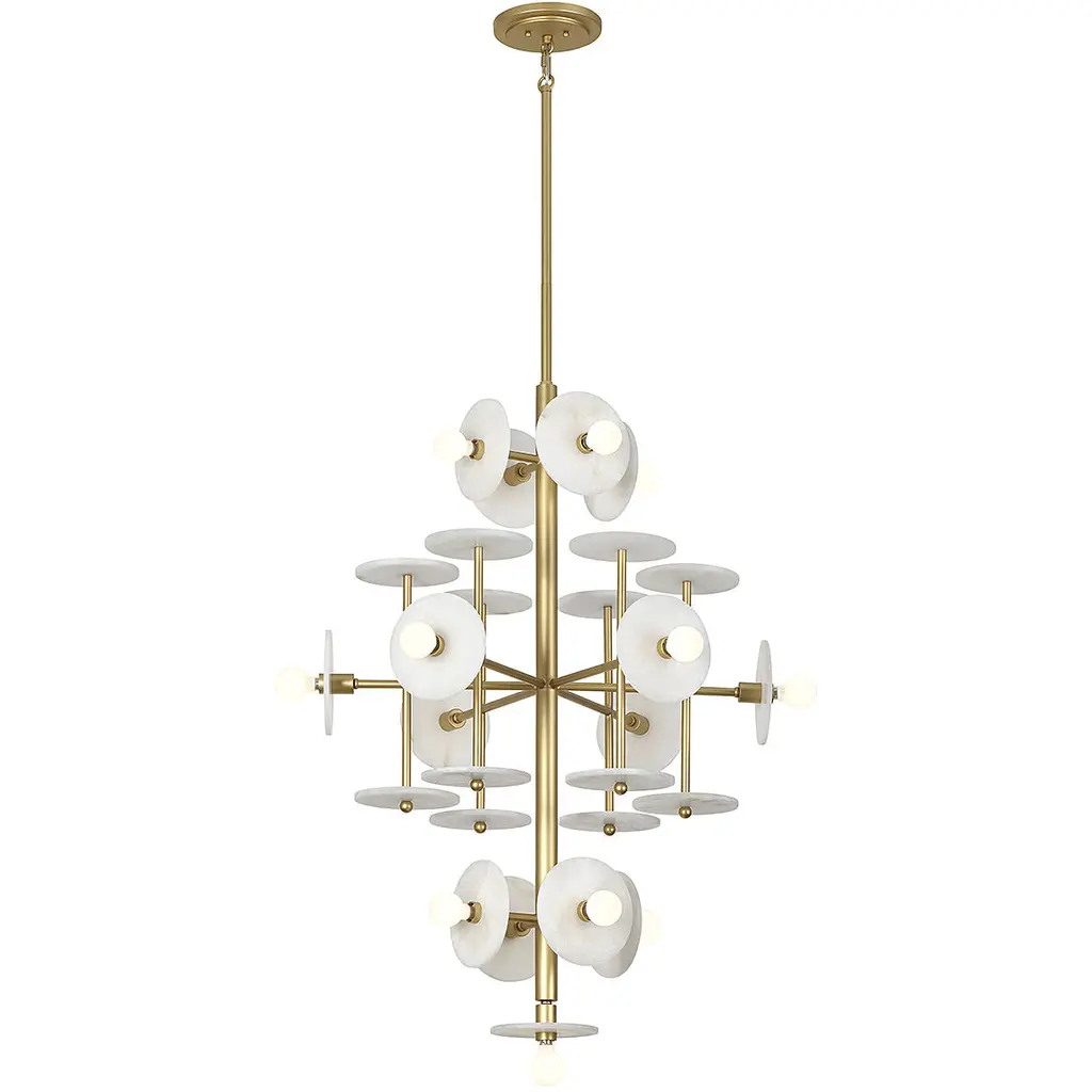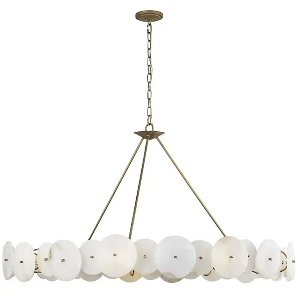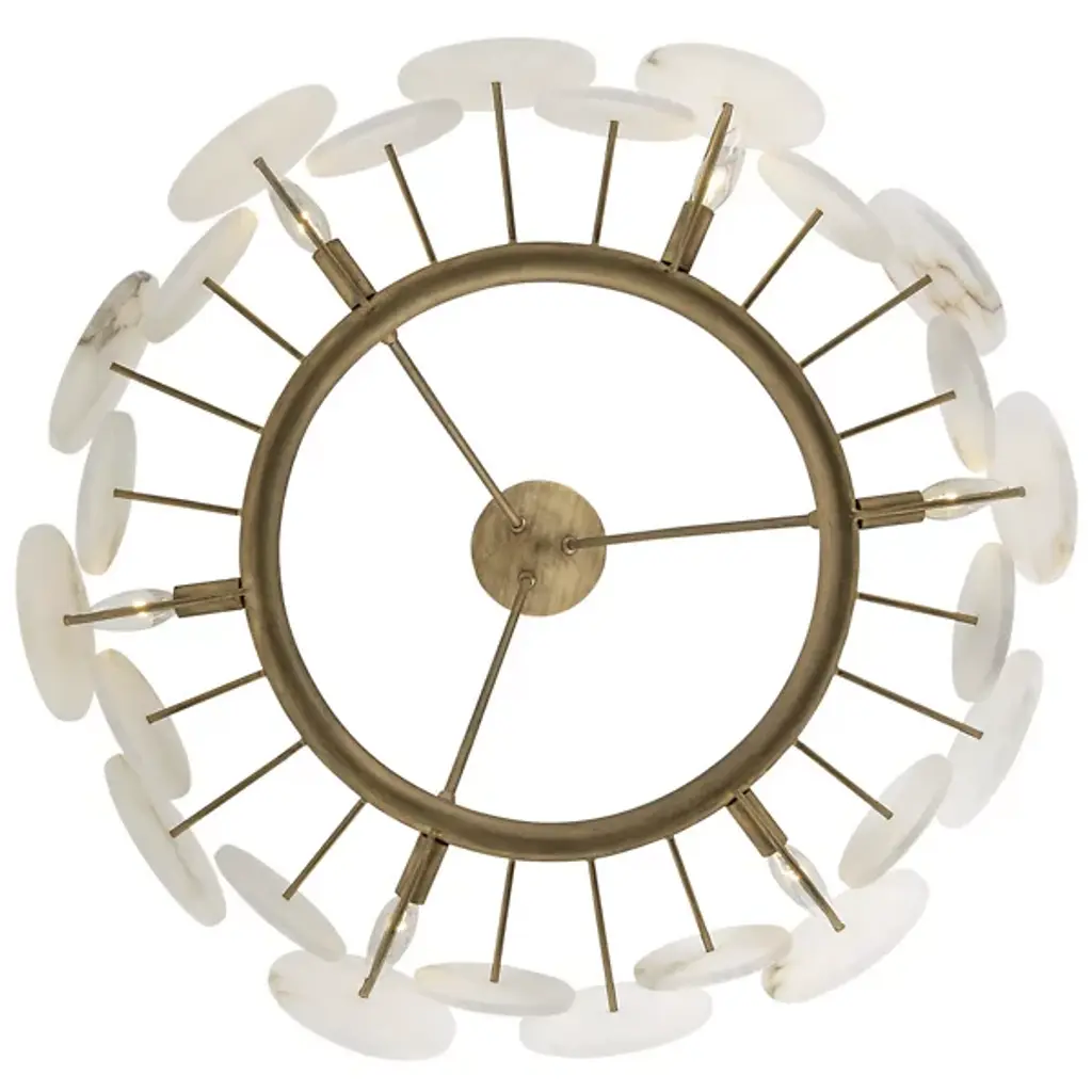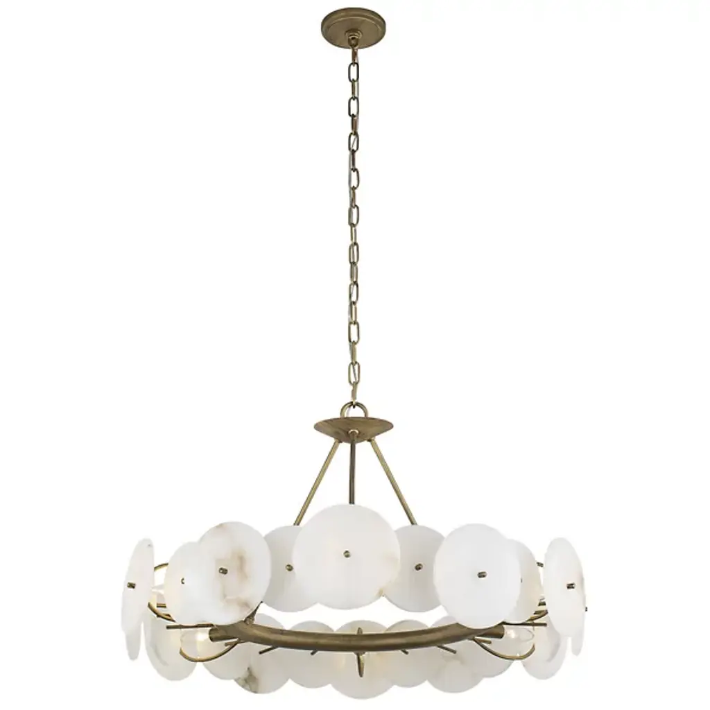 The modern and milky way to brighten your space. The Varaluz Cosmos Chandelier from the Smithsonian collection uses multiple overlapping discs of genuine alabaster to create a solid ring around the bulbs within, both disguising them and diffuse their light into warm ambience. The bulbs are themselves evenly arranged around a ring-shaped frame, which is made entirely of recycled steel. Use this chandelier to provide a unique, industrial lux focal point over a dining table or in a living area.