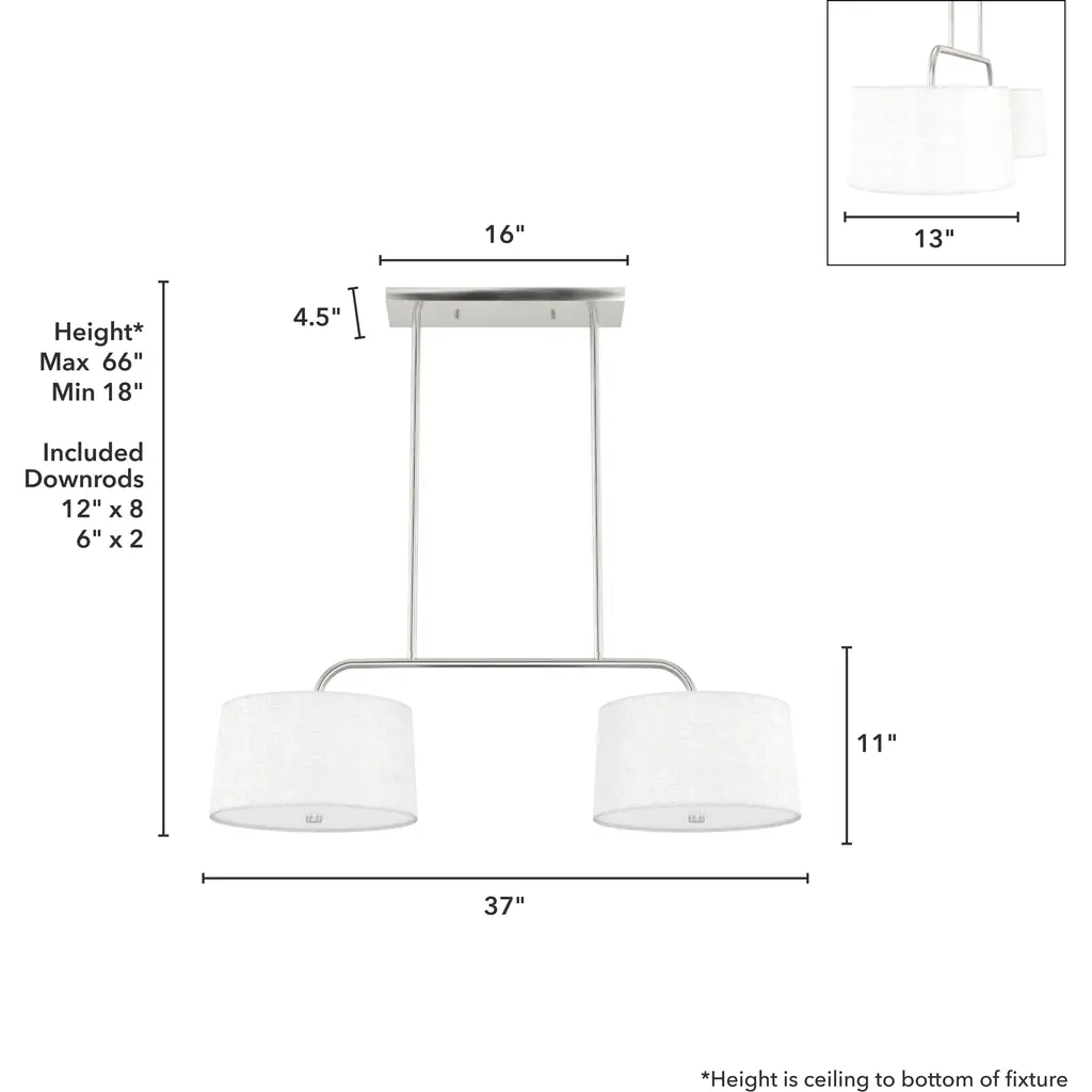 Bring the light closer to the action in your kitchen, bonus room or home office with the Cottage Hill 4 light 2 Shade Linear Chandelier. The fixture’s blend of clean lines and subtle curves transitions easily into any setting, while the Cottage Hill’s crisp, textured shades evenly distribute light throughout the room.