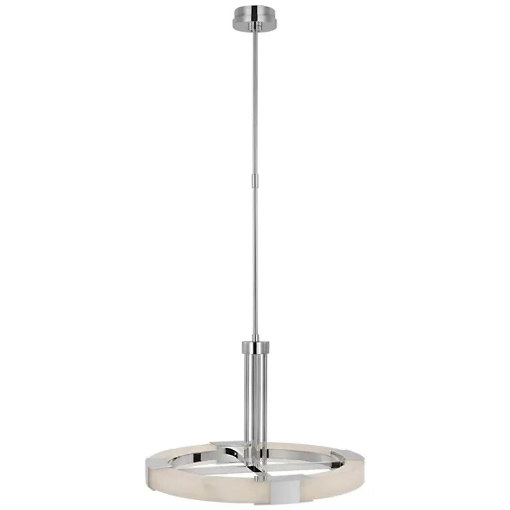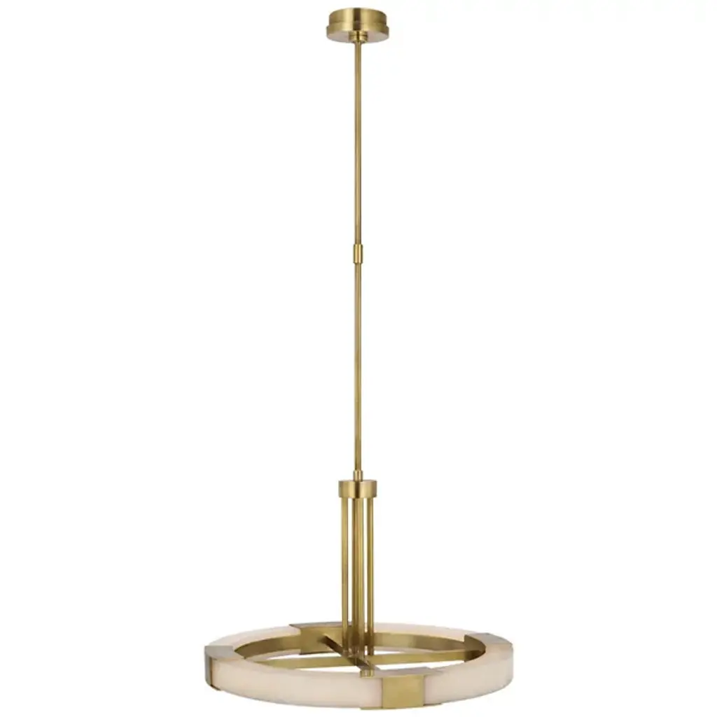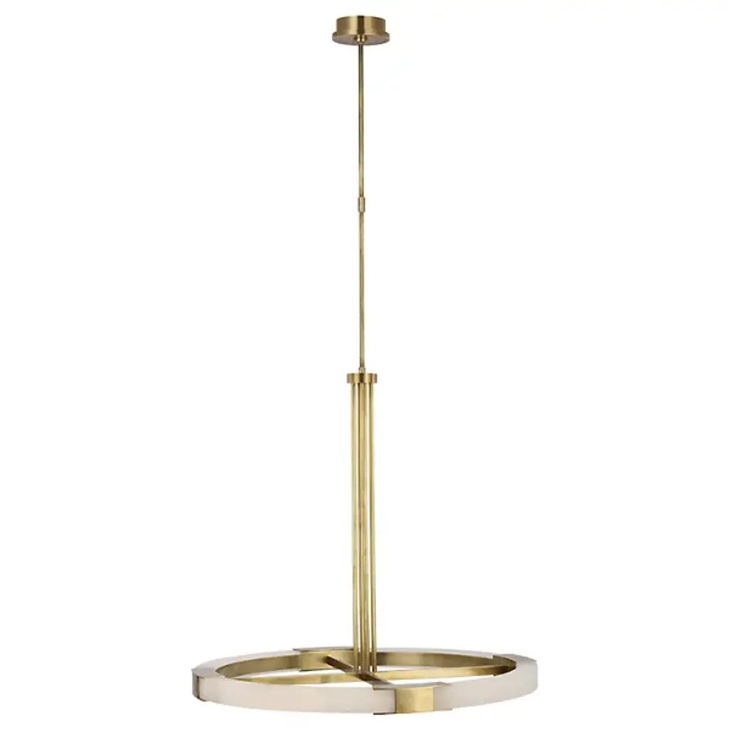 Enhance high ceilings with the enchanting retro-modern appeal. The Covet Large Ring Chandelier from Visual Comfort Signature, formerly known as Visual Comfort, sweeps down from a stepped-disc canopy along a slender stem to a round hub midway down, extending more slim brass rods to brace a matching crossbar frame with LED lamping. The frame features horizontal brackets that hold curving sections of natural alabaster between them, creating a stylized wheel structure that moderates the bright, power-efficient lamping into an even ambiance below.