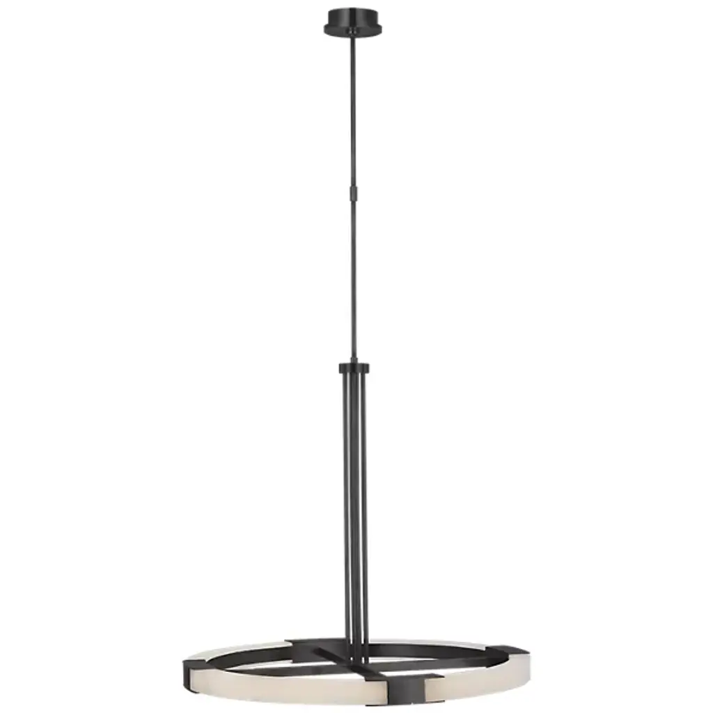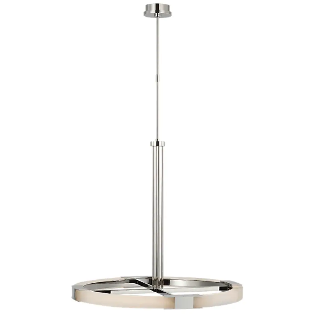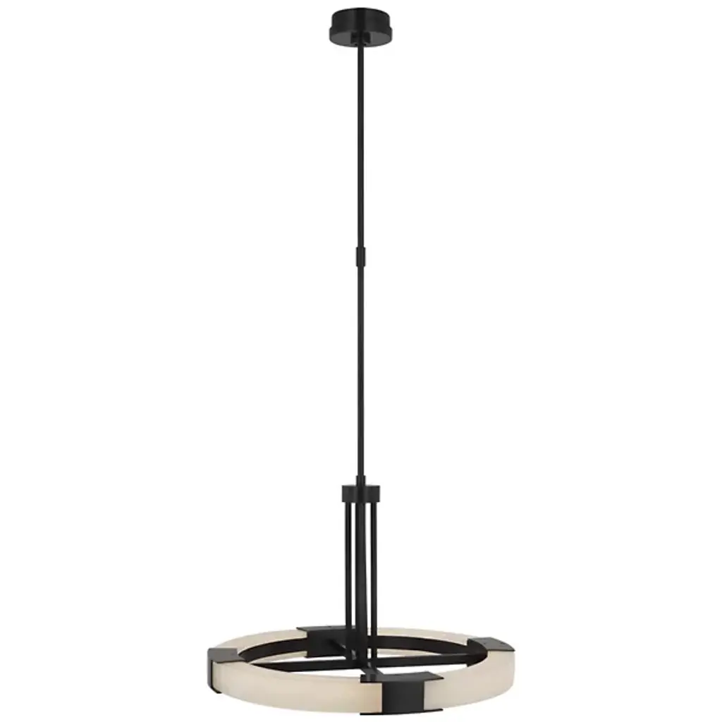 Enhance high ceilings with the enchanting retro-modern appeal. The Covet Large Ring Chandelier from Visual Comfort Signature, formerly known as Visual Comfort, sweeps down from a stepped-disc canopy along a slender stem to a round hub midway down, extending more slim brass rods to brace a matching crossbar frame with LED lamping. The frame features horizontal brackets that hold curving sections of natural alabaster between them, creating a stylized wheel structure that moderates the bright, power-efficient lamping into an even ambiance below.
