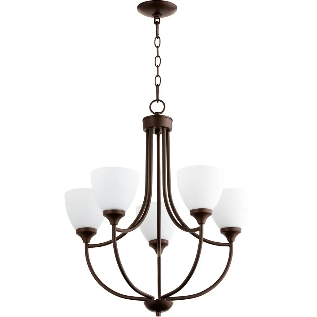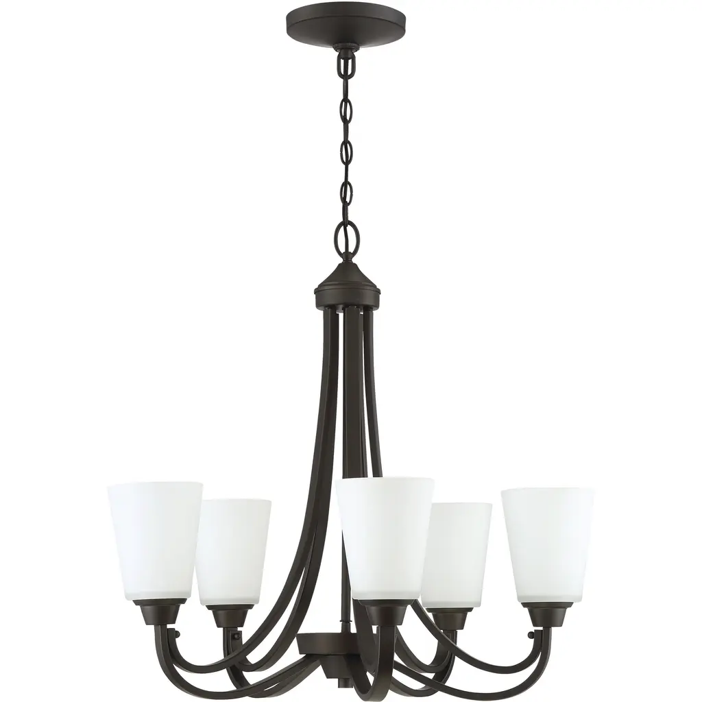 Grace 5 Light Chandelier in Espresso The Grace collection - the perfect name for this graceful family. It's clean lines, flowing frame and white frost glass create a rich look and a wonderful value. Features: Product Type: Indoor Ceiling Lighting - Chandelier Material: Steel Style: Transitional Finish: Espresso Outdoor: No Bulb Included: No Shade/Glass Material: Glass Glass/Shade Finish: White Frost Safety Rating: cETLus Warranty: 1 Year