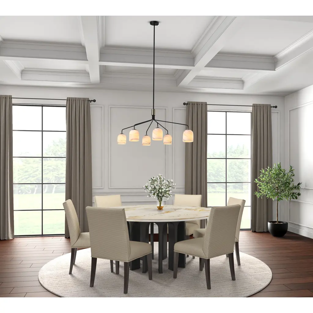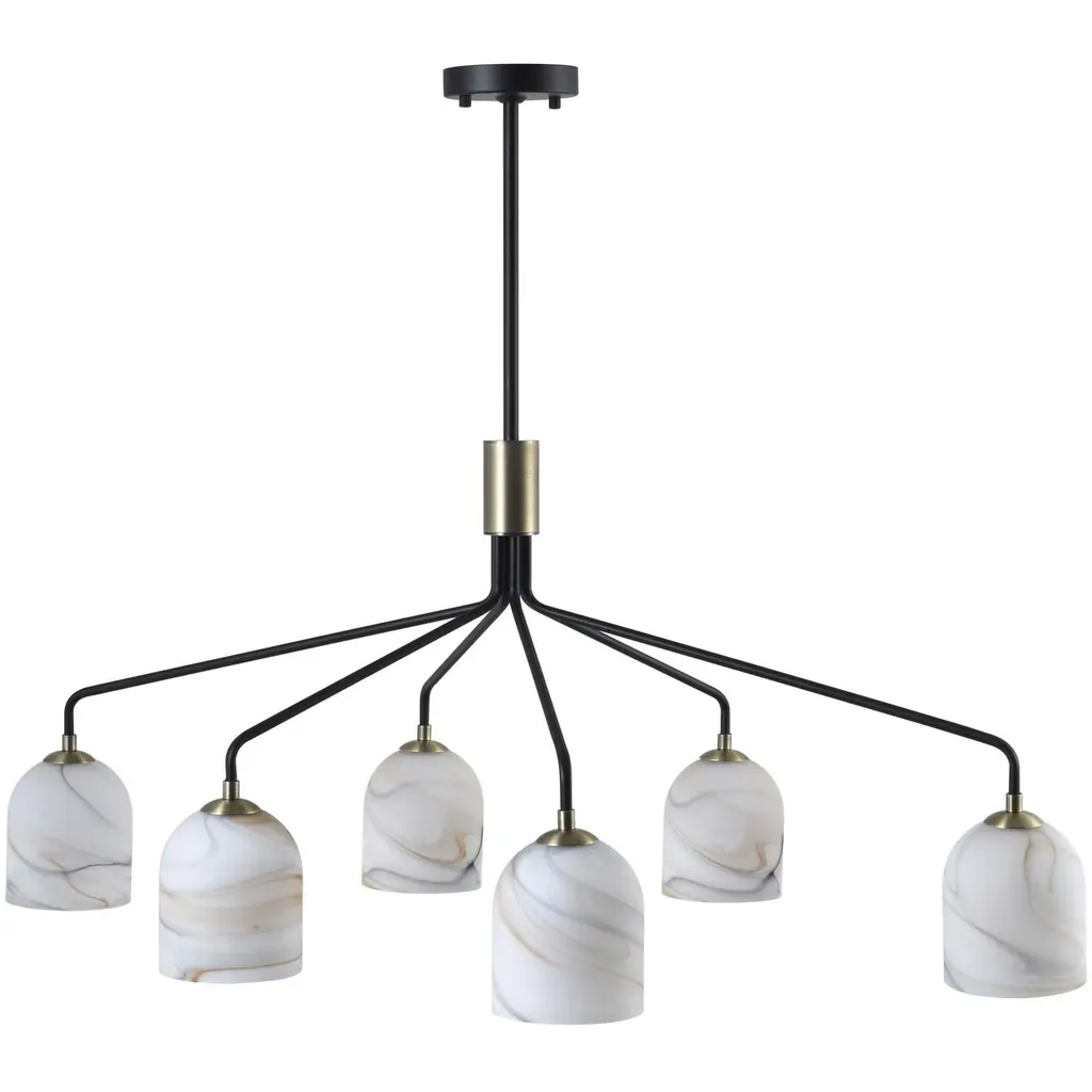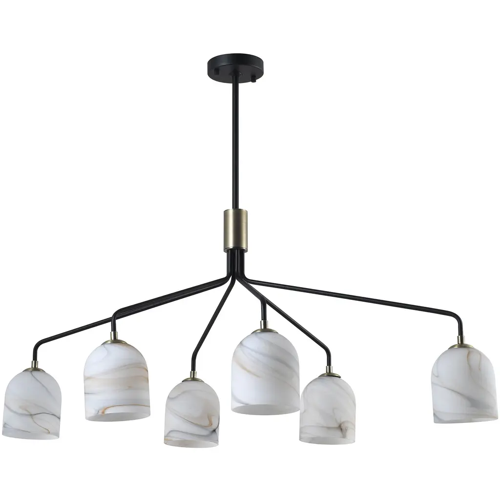 The Crema collection 6 light oval chandelier by Steven Sabados of S&C radiates understated sophistication with its alabaster-style swirl glass, casting a warm, inviting glow. Its sleek black frame is beautifully complemented by brushed brass accents, creating a perfect harmony of modern sophistication and classic charm. Rods included for easy height adjustment to suit different height requirements.