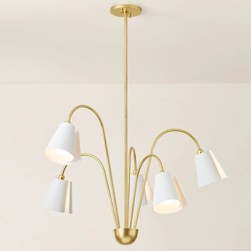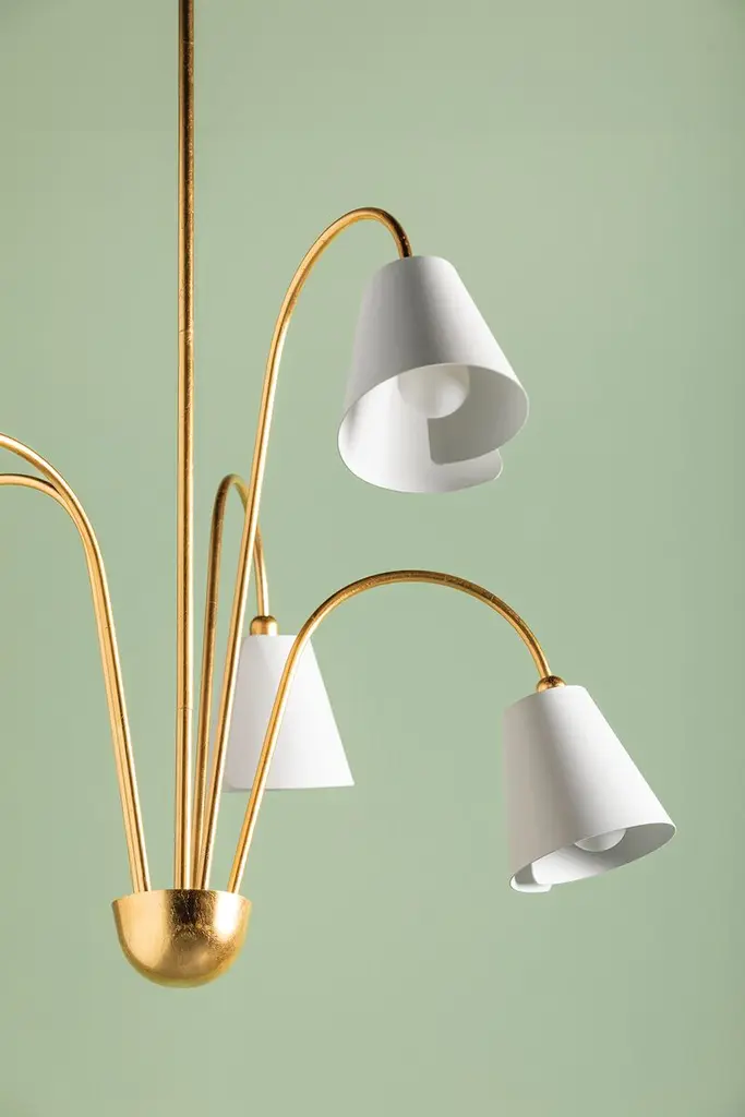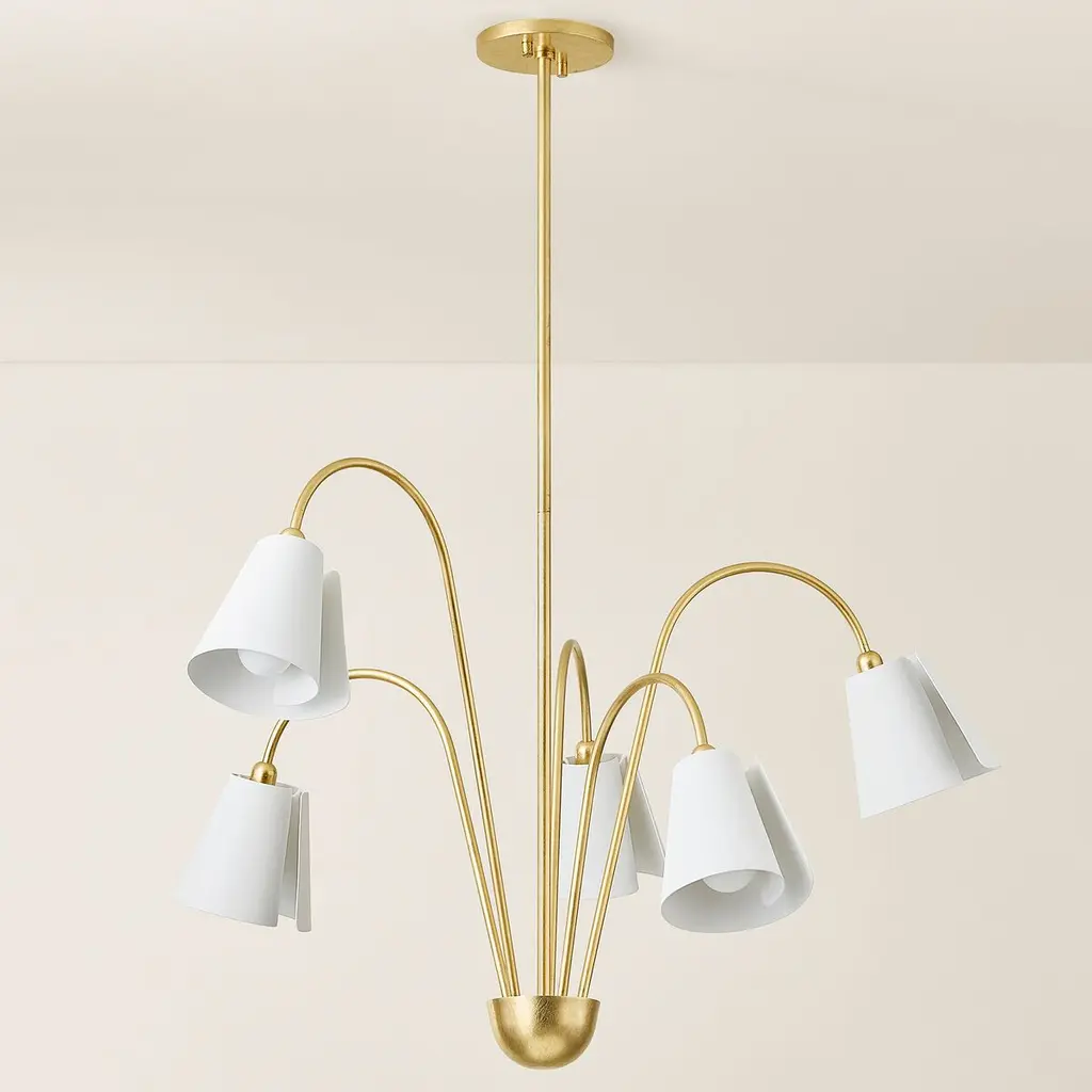 A spray of flower forms elegantly springs from the striking design. Reminiscent of a simplified calla lily bud, each bloom is defined by a coiled metal shade, supported by 'Gold Leaf' stems. Arranged at varying heights, the arched flowers create a sense of dynamism within the fixture. Available as a chandelier or sconce, this piece is a joyful celebration of curved edges and vintage silhouettes.