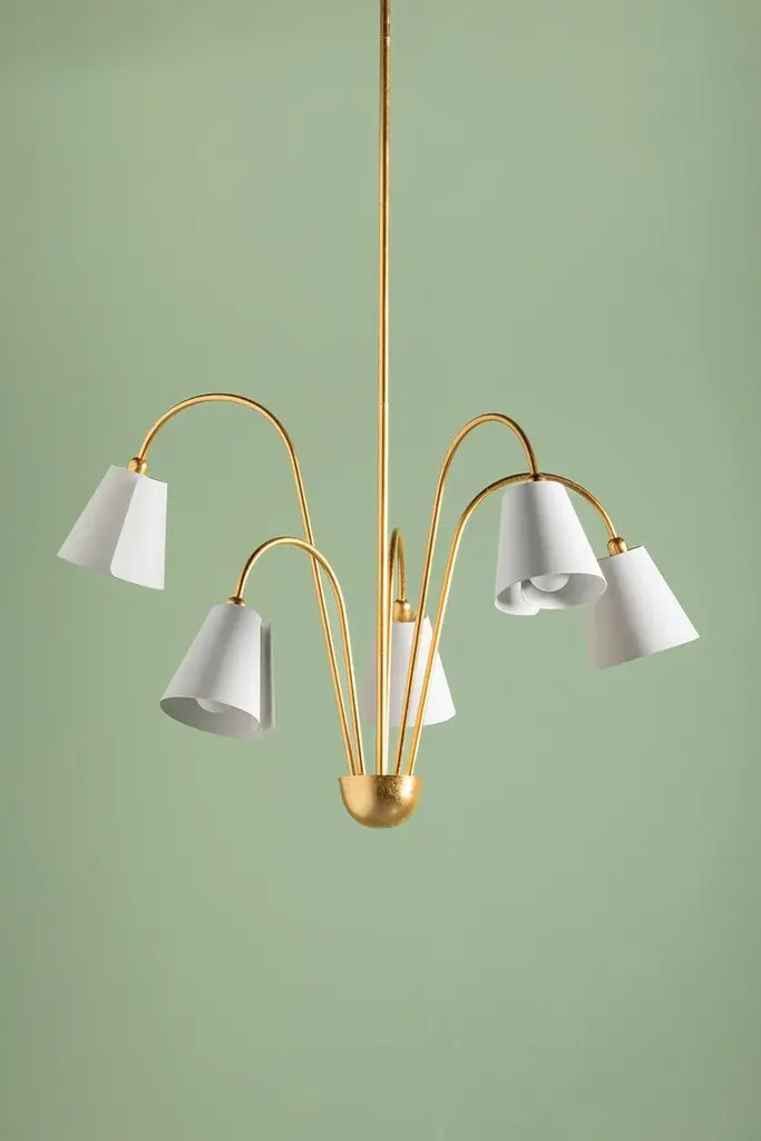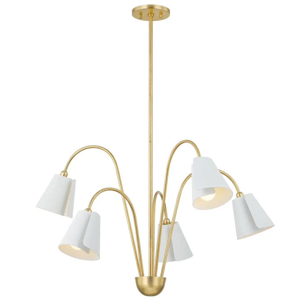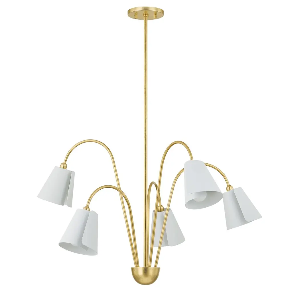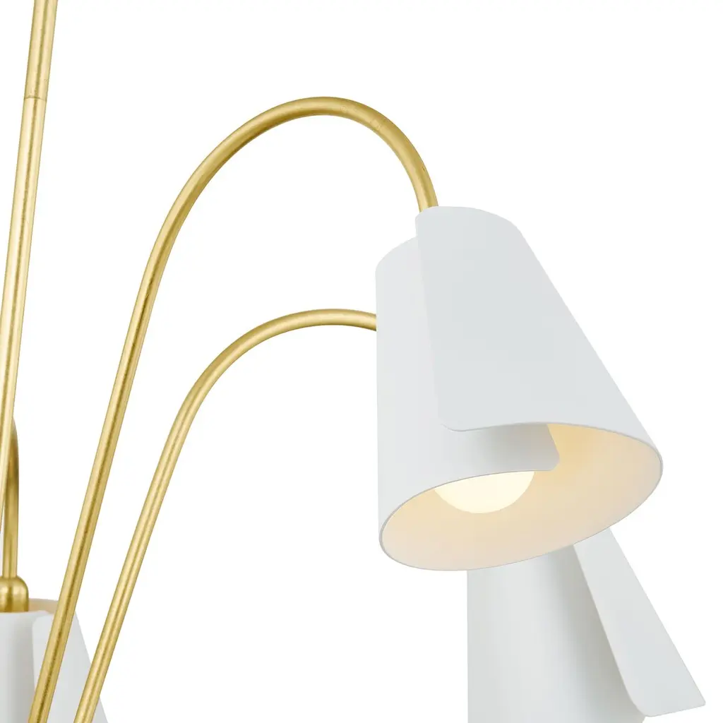 A spray of flower forms elegantly springs from the striking design. Reminiscent of a simplified calla lily bud, each bloom is defined by a coiled metal shade, supported by 'Gold Leaf' stems. Arranged at varying heights, the arched flowers create a sense of dynamism within the fixture. Available as a chandelier or sconce, this piece is a joyful celebration of curved edges and vintage silhouettes.