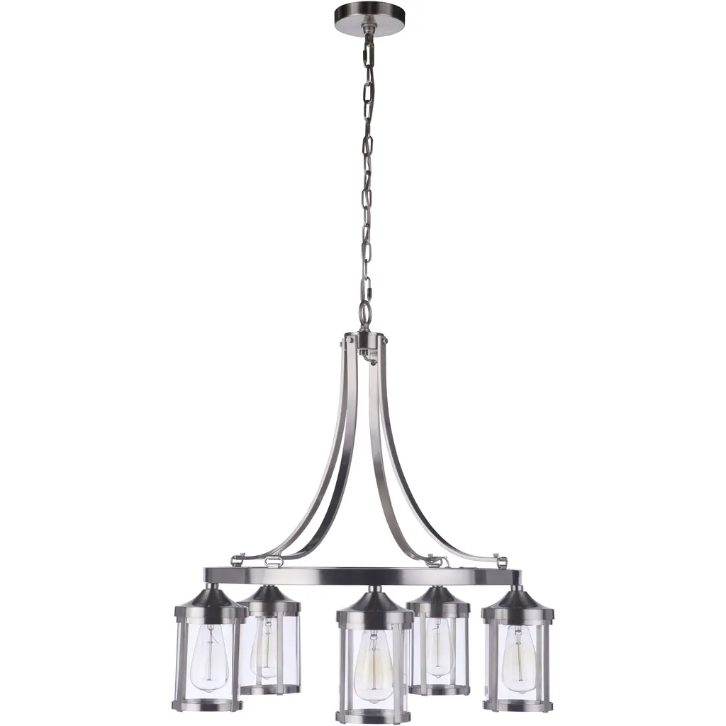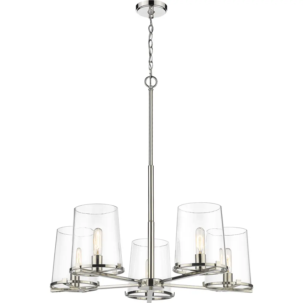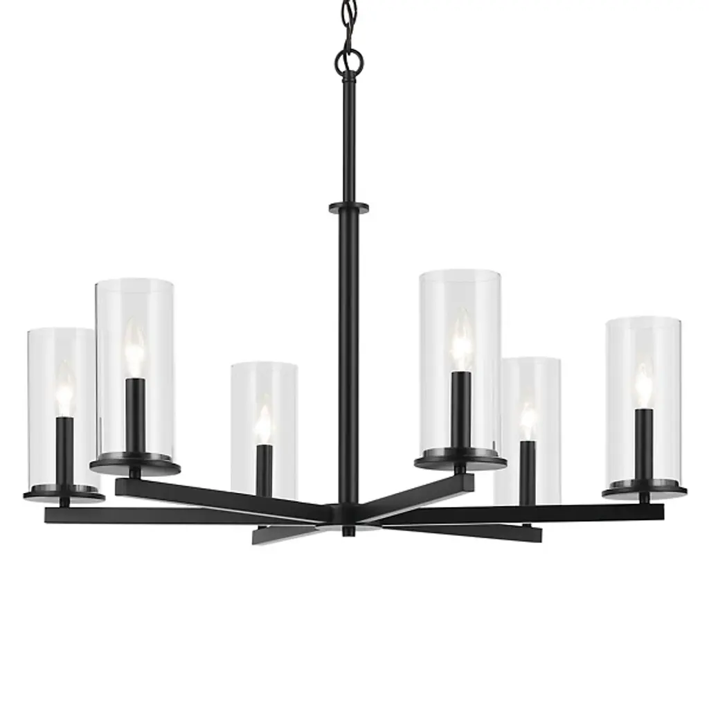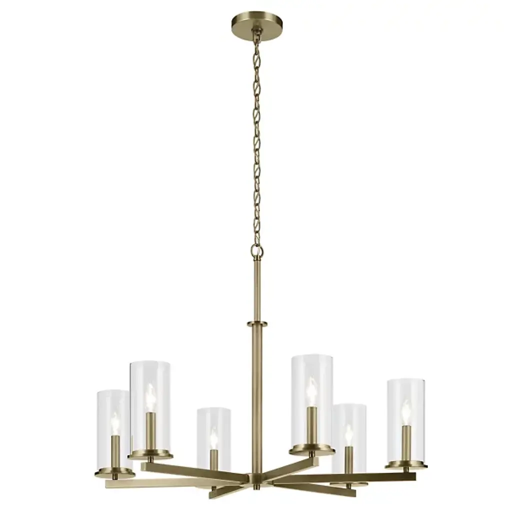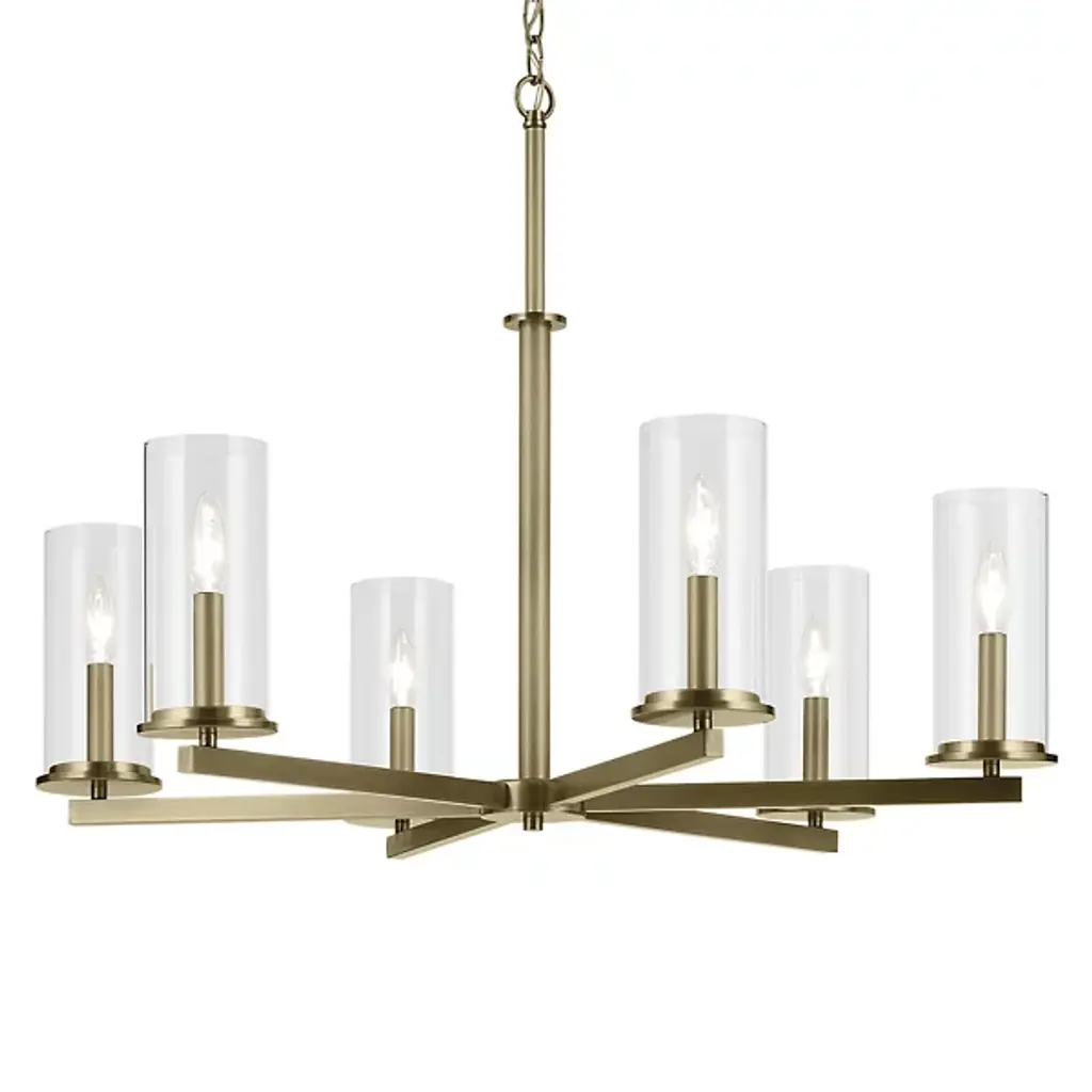 Minimal form shaped out of steel. Marked by clean lines and vintage styling, the Crosby Chandelier by Kichler exudes contemporary sophistication that works in traditional and modern spaces. Its single tier arrangement includes cylindrical clear glass shades placed at the ends of five extending arms. Each shade has a candle-like socket cover that offers a classic look when paired with flame shaped bulbs (sold separately). This linear arrangement is supported by a central stem attached by link chain to the canopy.