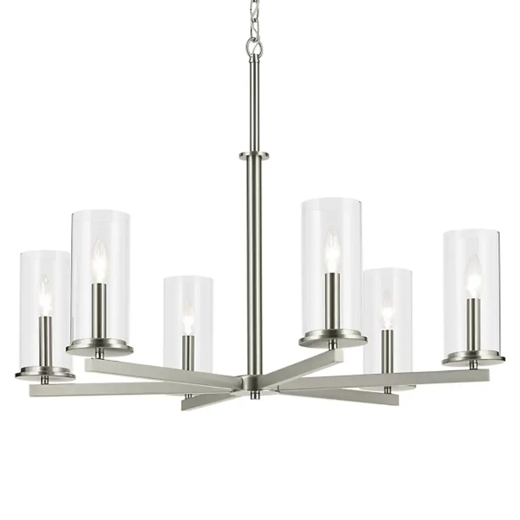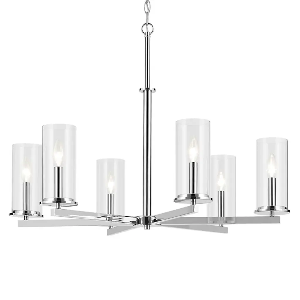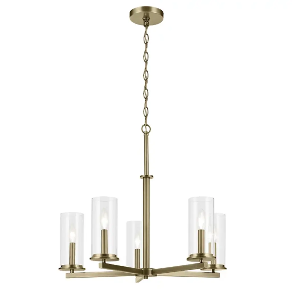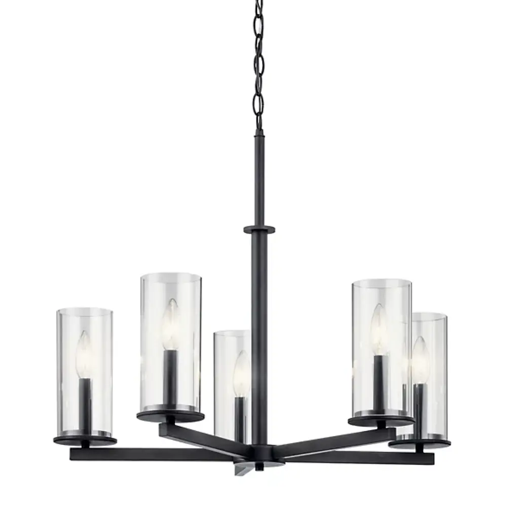 Minimal form shaped out of steel. Marked by clean lines and vintage styling, the Crosby Chandelier by Kichler exudes contemporary sophistication that works in traditional and modern spaces. Its single tier arrangement includes cylindrical clear glass shades placed at the ends of five extending arms. Each shade has a candle-like socket cover that offers a classic look when paired with flame shaped bulbs (sold separately). This linear arrangement is supported by a central stem attached by link chain to the canopy.