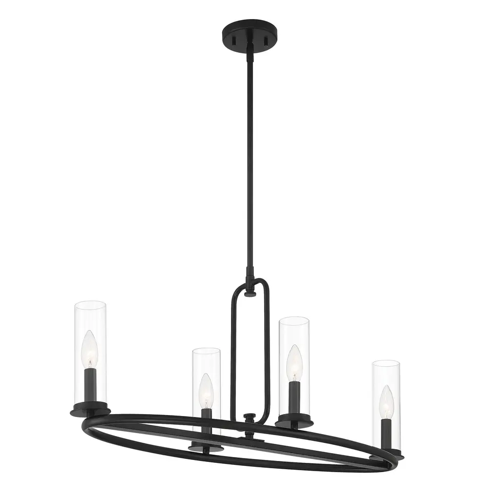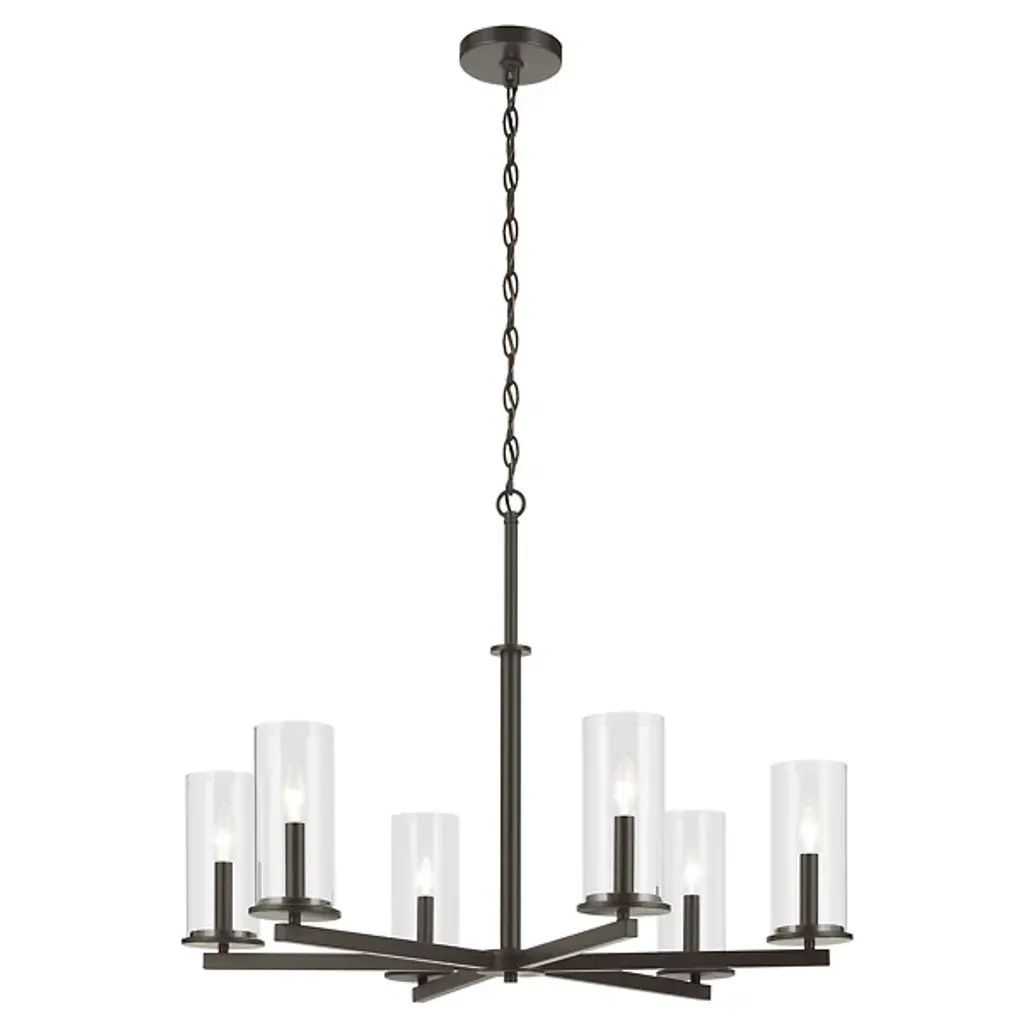 Minimal form shaped out of steel. Marked by clean lines and vintage styling, the Crosby Chandelier by Kichler exudes contemporary sophistication that works in traditional and modern spaces. Its single tier arrangement includes cylindrical clear glass shades placed at the ends of five extending arms. Each shade has a candle-like socket cover that offers a classic look when paired with flame shaped bulbs (sold separately). This linear arrangement is supported by a central stem attached by link chain to the canopy.