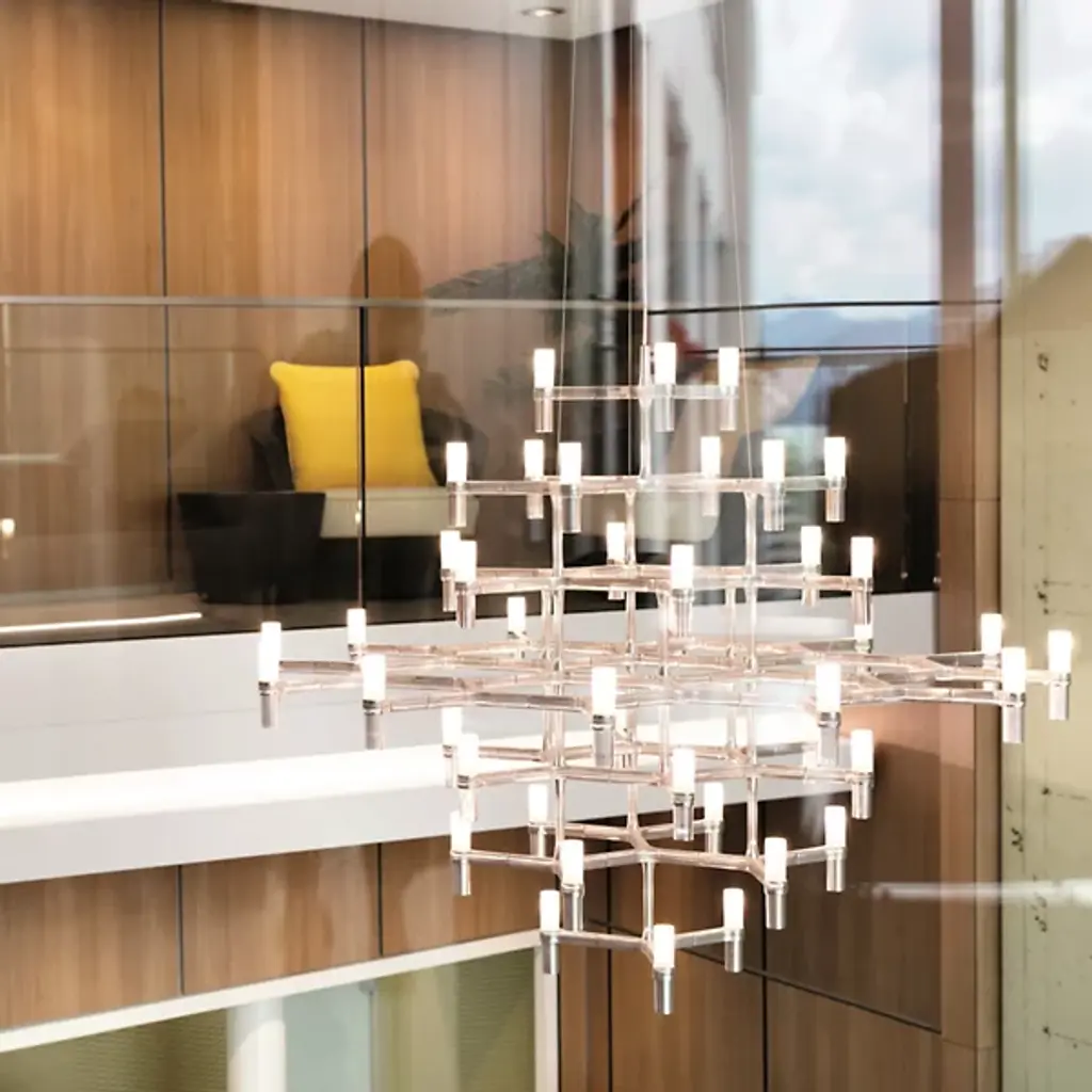 “How a design looks should not be far from what it does,” designer Jürgen Laub of Jehs+Laub says of his philosophy in creating a functional piece. That philosophy carries to the Crown Magnum Chandelier from Nemo, which is an iteration on the classic centerpiece chandelier inspired by the exquisite symmetry of a snowflake. Its die-cast aluminum structure is an array of stems attached to each other in a neat pattern. Cylindrical bases holding its LEDs are topped off by cylindrical glass diffusers which collectively produce a concert of vibrant ambient light. It brings rooms together with style and function.