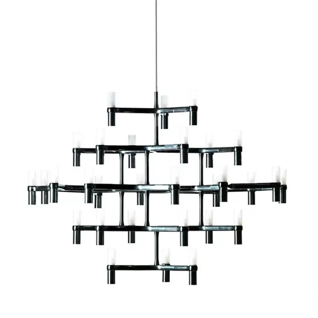 The Crown Major Chandelier by Nemo is a modern interpretation of a traditional chandelier. Available in a variety of finishes, the chandelier is topped by frosted glass diffusers. Indirect ambient illumination comes from the collection of 30 opal white glass shades. Crown's lighting design truly makes the piece an eye-catching creation. Each branch from the lamp's core begins with a tripod extension from the stem, placed sporadically around the center of the chandelier, creating a full presentation of ambient lighting. A captivating light indeed, Crown Major Suspension may be placed at the length of one's choice, in the dining room, bedroom, or living room.