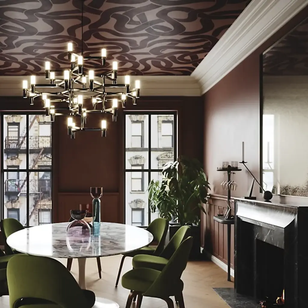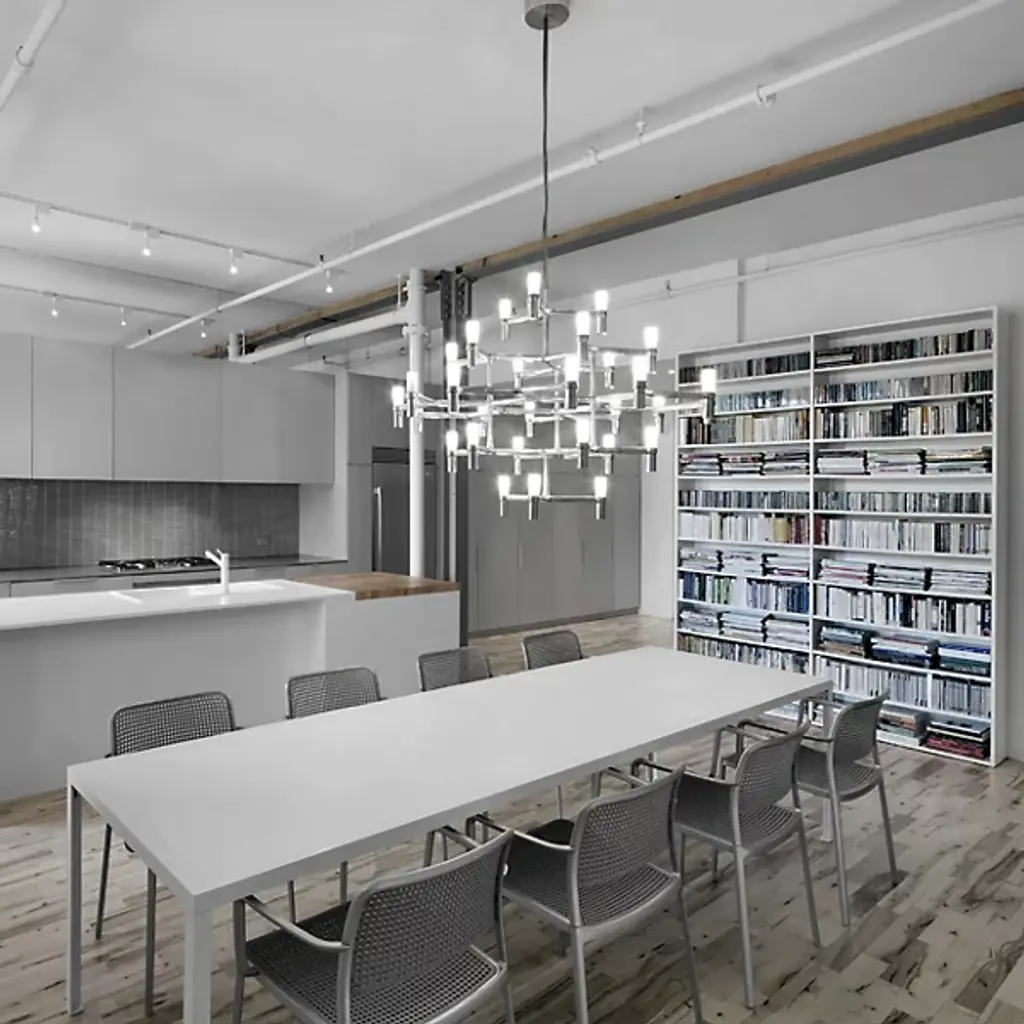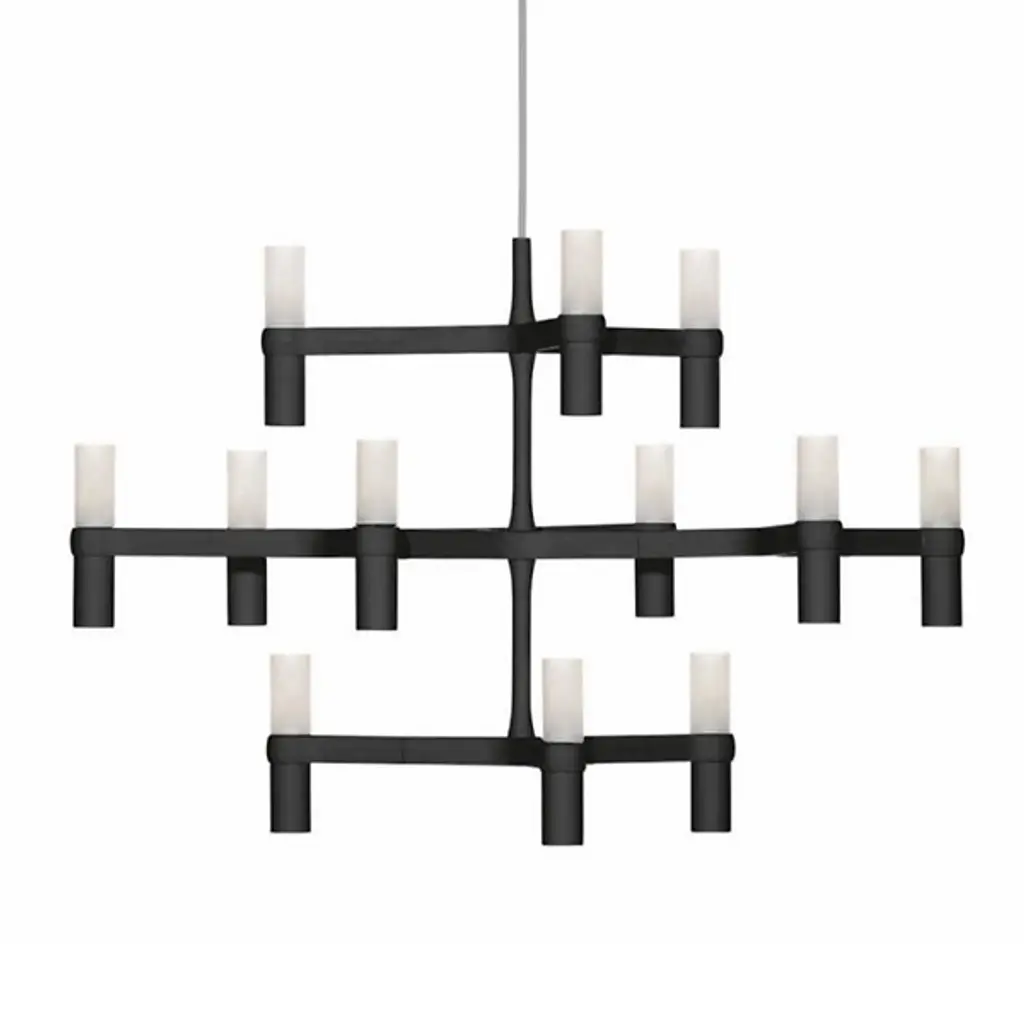 The Crown Major Chandelier by Nemo is a modern interpretation of a traditional chandelier. Available in a variety of finishes, the chandelier is topped by frosted glass diffusers. Indirect ambient illumination comes from the collection of 30 opal white glass shades. Crown's lighting design truly makes the piece an eye-catching creation. Each branch from the lamp's core begins with a tripod extension from the stem, placed sporadically around the center of the chandelier, creating a full presentation of ambient lighting. A captivating light indeed, Crown Major Suspension may be placed at the length of one's choice, in the dining room, bedroom, or living room.