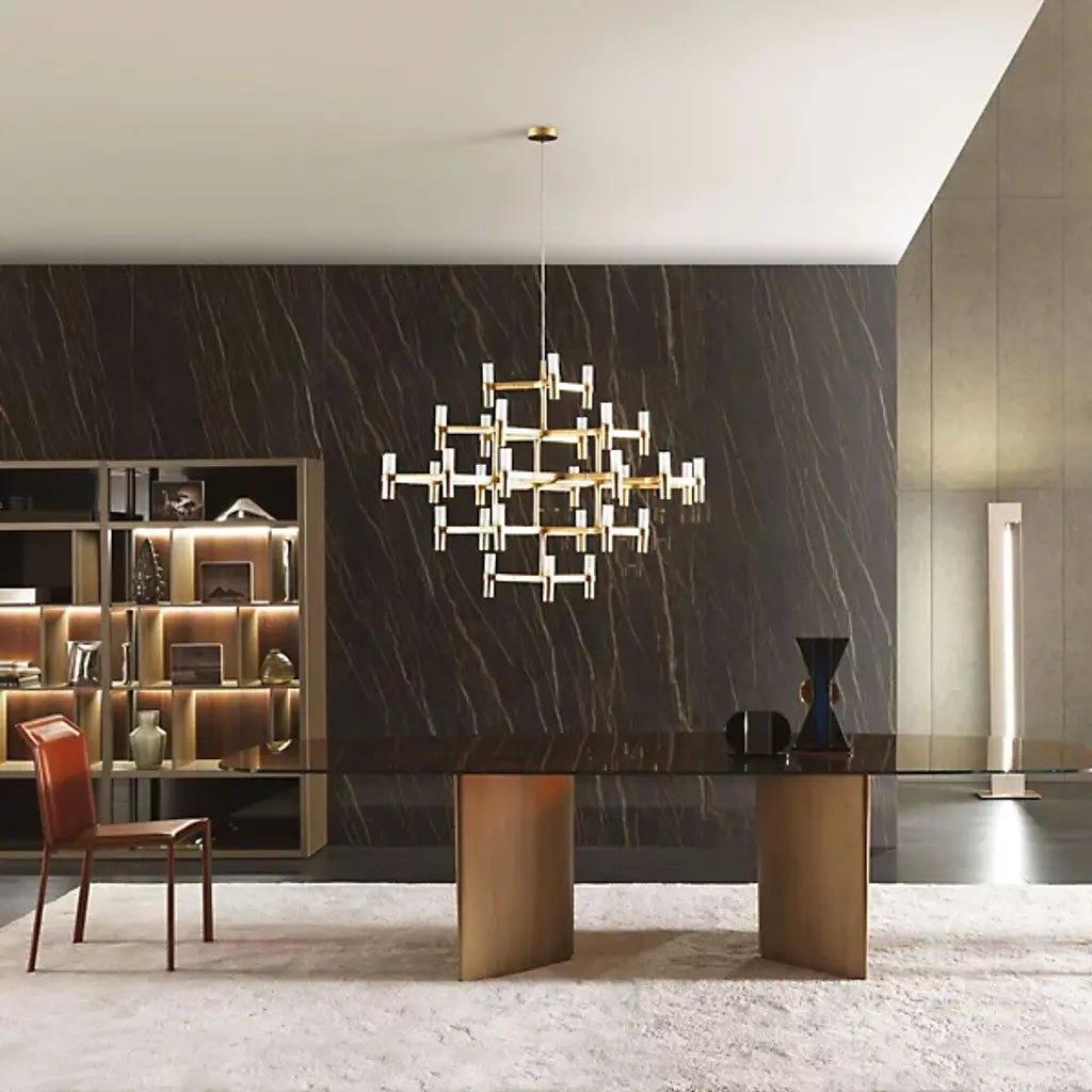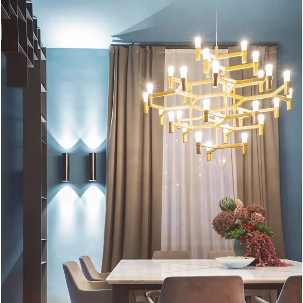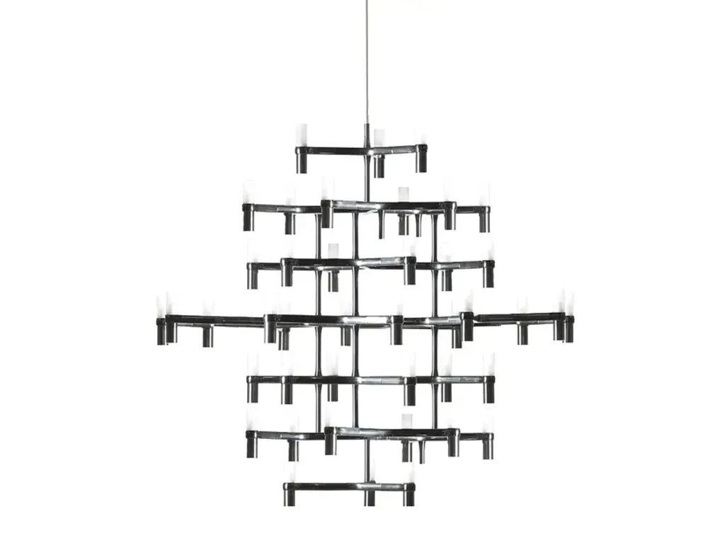 The Crown Major Chandelier by Nemo is a modern interpretation of a traditional chandelier. Available in a variety of finishes, the chandelier is topped by frosted glass diffusers. Indirect ambient illumination comes from the collection of 30 opal white glass shades. Crown's lighting design truly makes the piece an eye-catching creation. Each branch from the lamp's core begins with a tripod extension from the stem, placed sporadically around the center of the chandelier, creating a full presentation of ambient lighting. A captivating light indeed, Crown Major Suspension may be placed at the length of one's choice, in the dining room, bedroom, or living room.