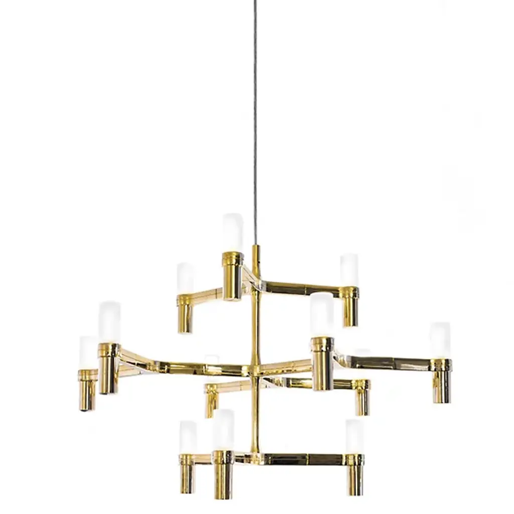 The Nemo Crown Minor Chandelier has major impact in contemporary interiors. A modern design inspired by classic candle chandeliers, Crown Minor features perfectly straight arms with 12 cylindrical shade holders and Opal White glass shades. While available in multiple finishes, the Gold finish is sold exclusively at Lumens.
