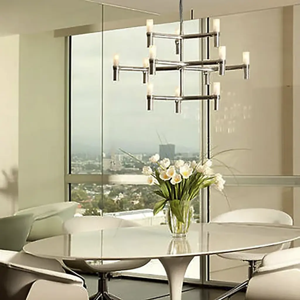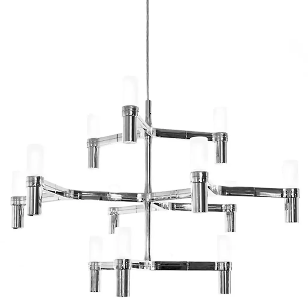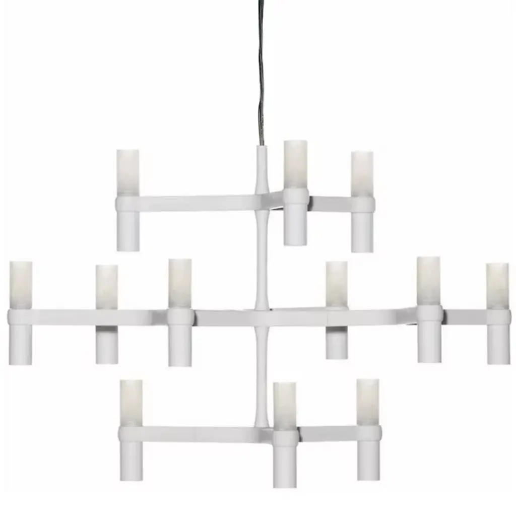 The Nemo Crown Minor Chandelier has major impact in contemporary interiors. A modern design inspired by classic candle chandeliers, Crown Minor features perfectly straight arms with 12 cylindrical shade holders and Opal White glass shades. While available in multiple finishes, the Gold finish is sold exclusively at Lumens.
