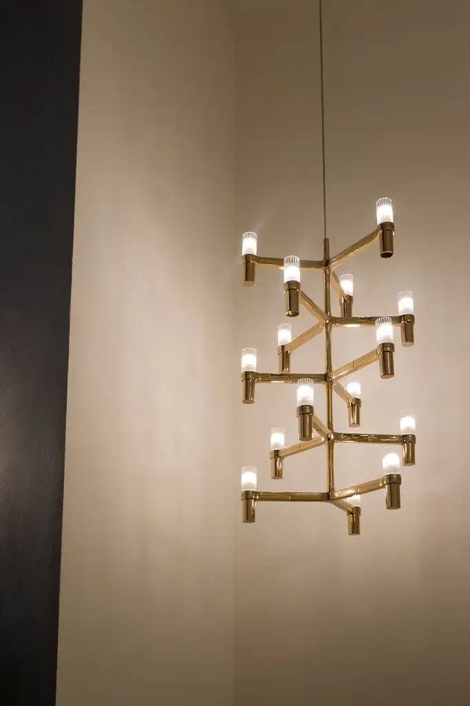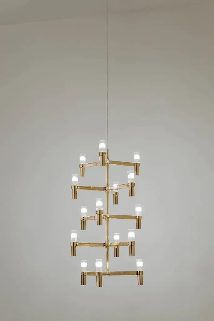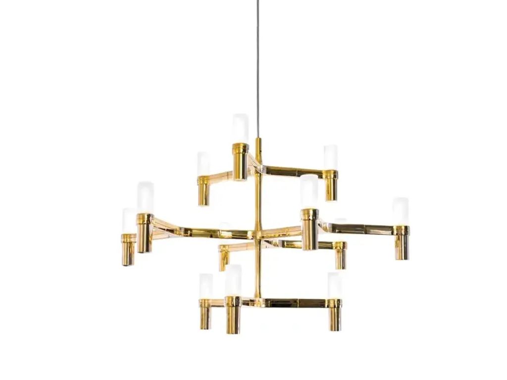 CROWN MULTI is an aluminium chandelier. Structure is available in different versions hand polished aluminium, glossy gold plated or black plated, painted in matt white, matt black, or matt gold. Widespread light.Available a NEMO LED G9 kitLED/HALOSource halopin G9 QT-14Total power 15x25WEmission diffusedSwitching dimmable, according to bulbTension110/230VFamily composed by pendant chandeliers whose shape is inspired by the outline of the snow crystal. Modular lamps realized with a die-casted aluminium structure and sandblasted glass diffusers. Double switch for the Summa and Magnum versions. The pendant versions are equipped with transparent cable.Available a NEMO LED G9 kit
