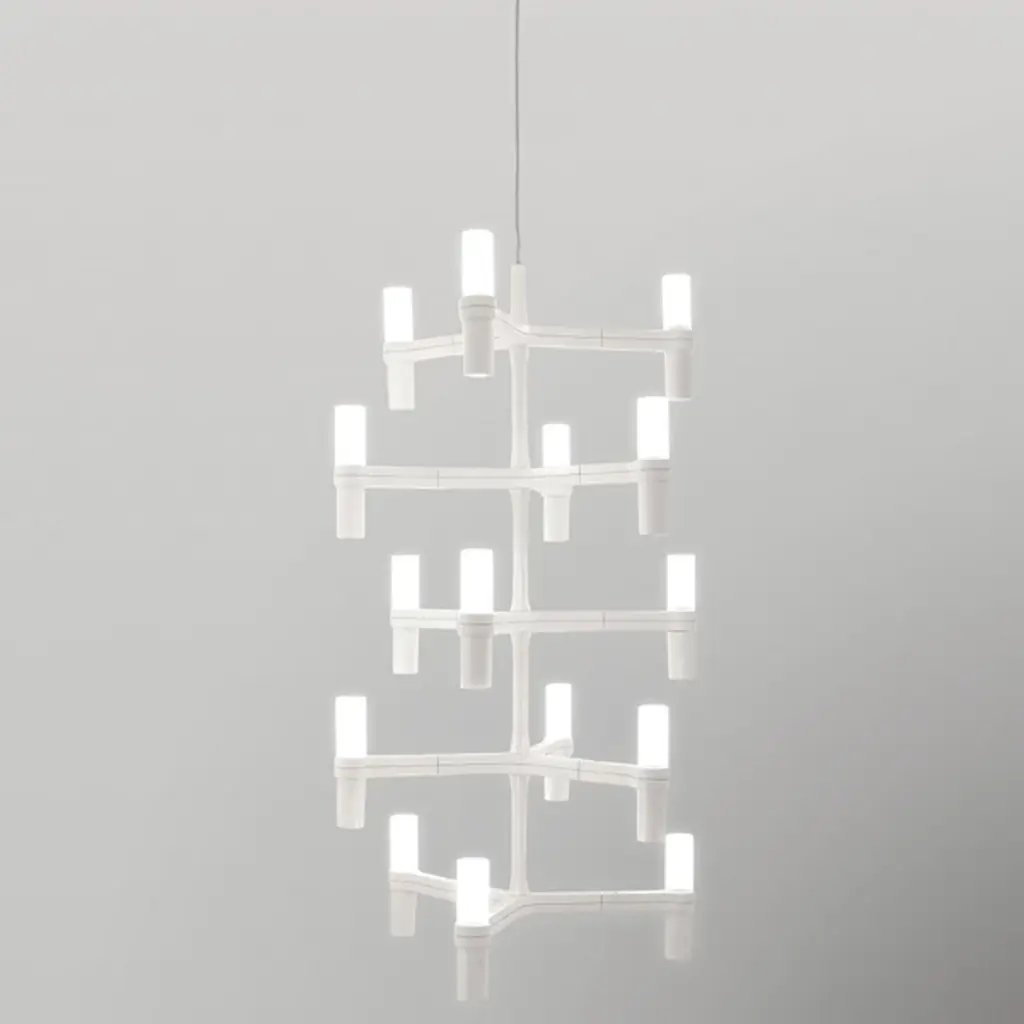 The multi-layered Nemo Crown Multi Chandelier is a modern, minimalist interpretation of the classic candle chandelier. Its polished, die-cast aluminum body was designed by Jehs and Laub to be strikingly geometric, with hard lines, illuminated edges, and symmetrically spaced levels. Each edge consists of a sandblasted, opal-white glass diffuser (for a total of 15) that produces a widespread, yet warm lighting effect. Includes field-cuttable transparent cables for discreet suspension.