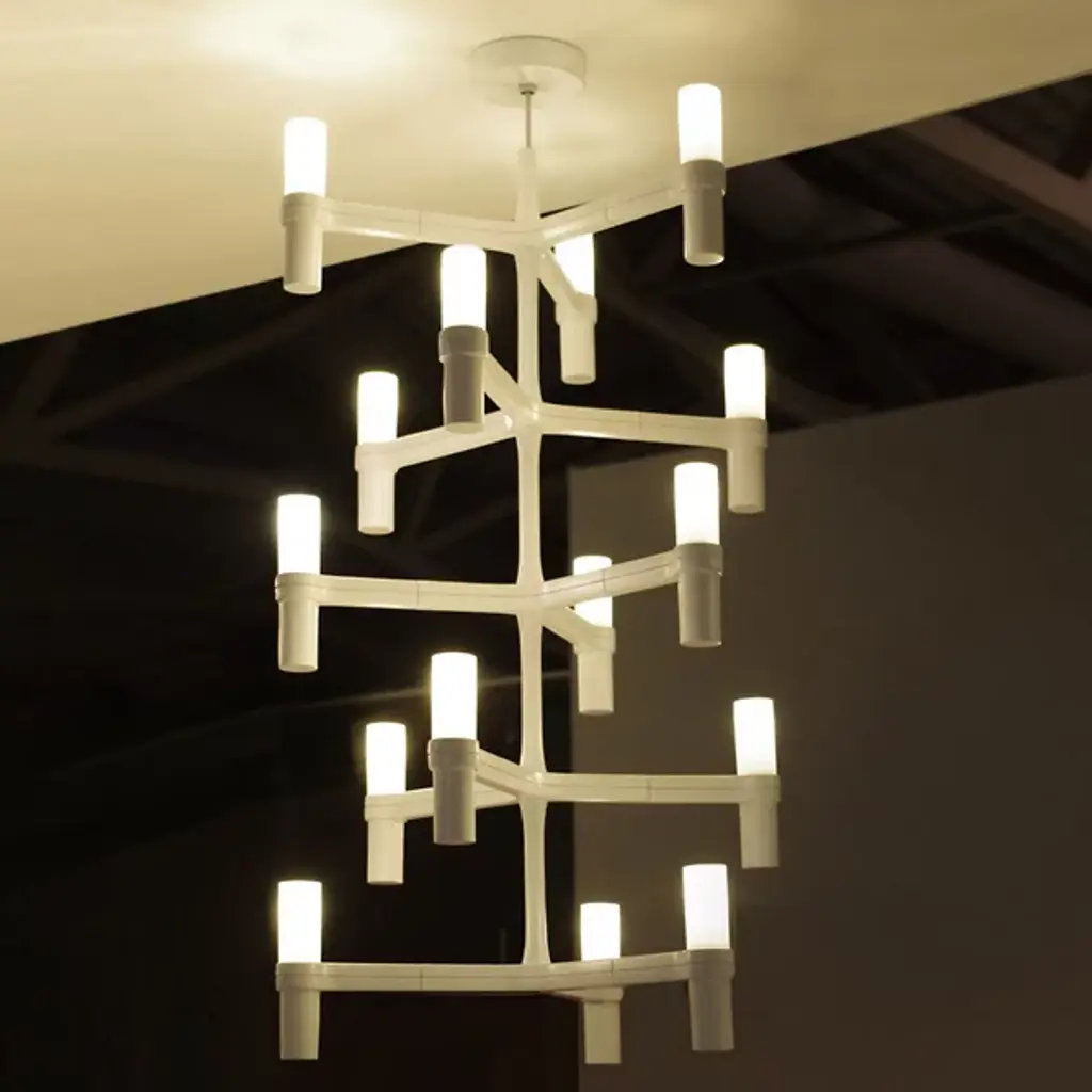 The multi-layered Nemo Crown Multi Chandelier is a modern, minimalist interpretation of the classic candle chandelier. Its polished, die-cast aluminum body was designed by Jehs and Laub to be strikingly geometric, with hard lines, illuminated edges, and symmetrically spaced levels. Each edge consists of a sandblasted, opal-white glass diffuser (for a total of 15) that produces a widespread, yet warm lighting effect. Includes field-cuttable transparent cables for discreet suspension.