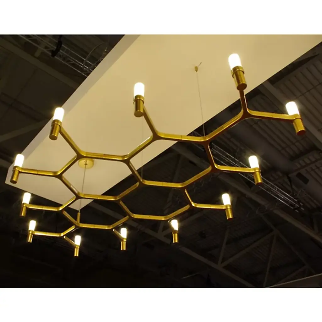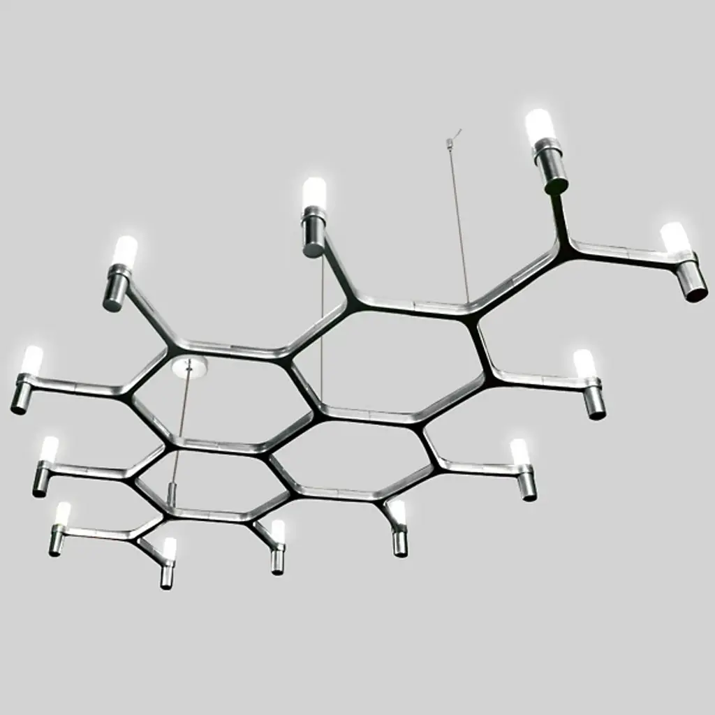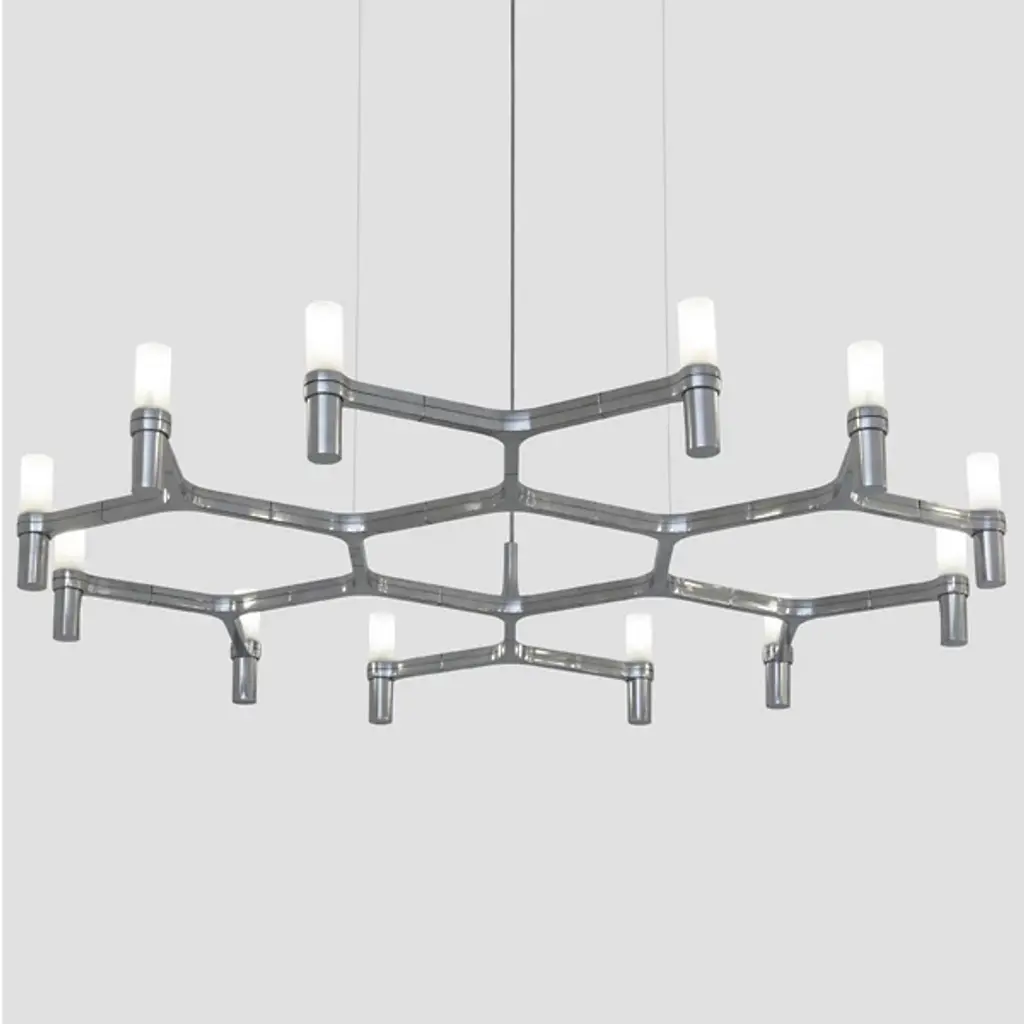 Evocative of a snowflake. The Crown Plana Mega Chandelier by Nemo showcases a symmetrical and sculptural design that has the potential to create a distinctive focal point in your living spaces, dining halls, or foyers. Taking inspiration from nature, designers Jehs and Laub have this honeycomb-shaped frame that also looks like the outline of a snow crystal. Its ends feature cylindrical-shaped structures that are topped with tubular diffusers and conceal a halogen bulb each. This frame is crafted from die-casted aluminum, while the shades are made of sandblasted glass.
