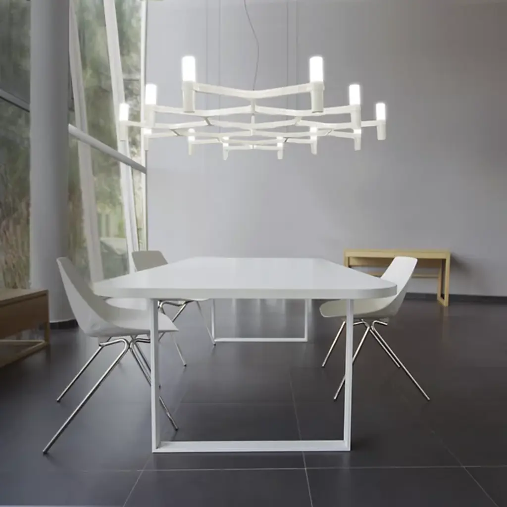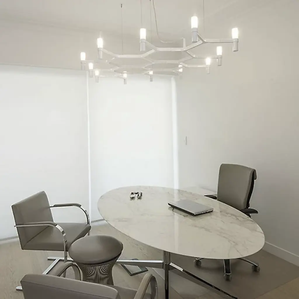 Evocative of a snowflake. The Crown Plana Mega Chandelier by Nemo showcases a symmetrical and sculptural design that has the potential to create a distinctive focal point in your living spaces, dining halls, or foyers. Taking inspiration from nature, designers Jehs and Laub have this honeycomb-shaped frame that also looks like the outline of a snow crystal. Its ends feature cylindrical-shaped structures that are topped with tubular diffusers and conceal a halogen bulb each. This frame is crafted from die-casted aluminum, while the shades are made of sandblasted glass.