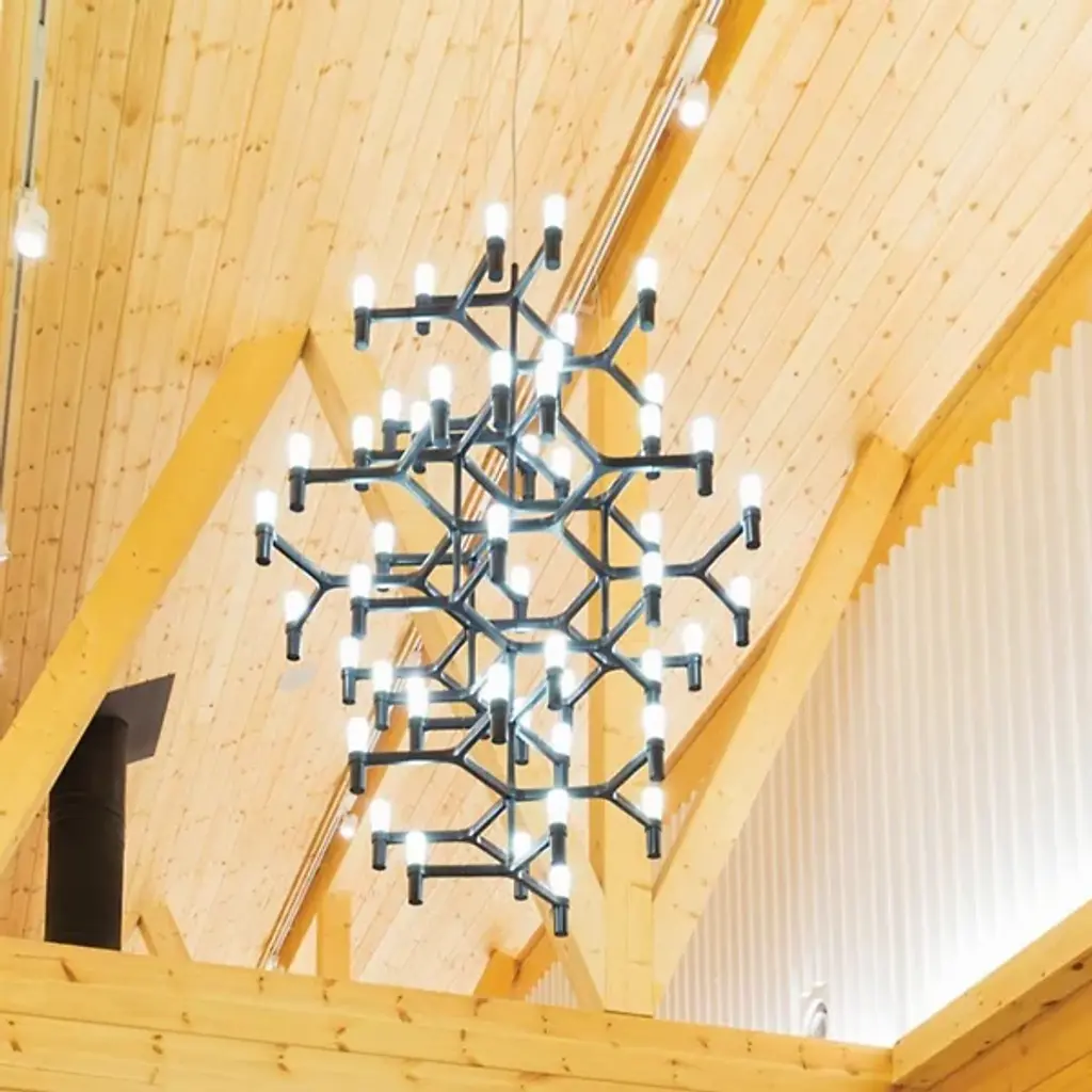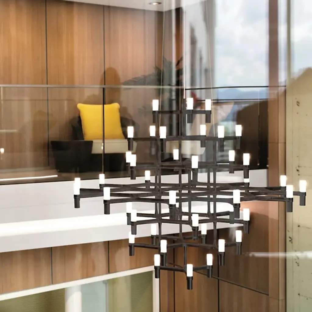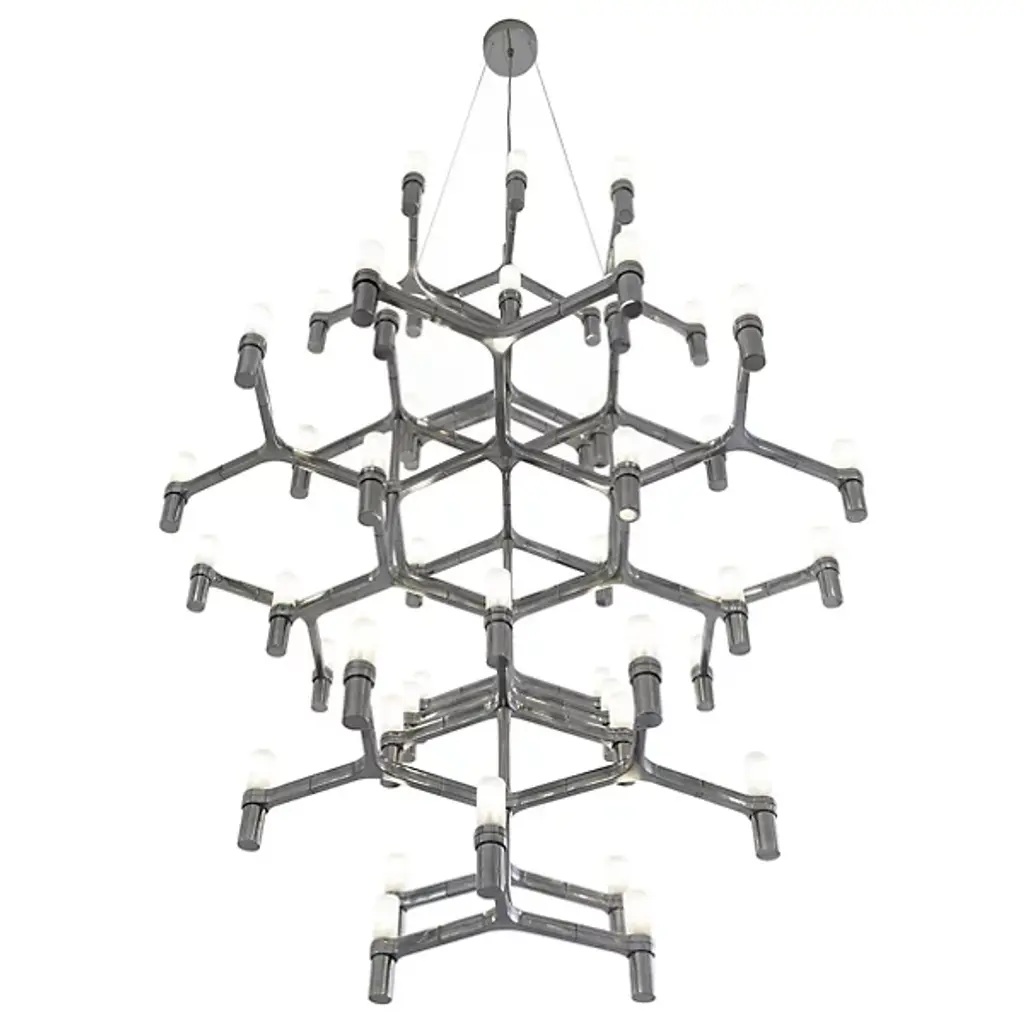 An eccentric, modern twist on classic chandelier design. The Nemo Crown Summa Chandelier features a stunning, die-cast aluminum body that consists of many tripodic lines and illusory hexagonal patterns that shift depending on your point of view. Dotting the end of each line is one of 48 sandblasted, opal-white glass diffusers that, in concert, elicit a widespread, yet warm lighting effect. Includes field-cuttable transparent cables for discreet suspension.