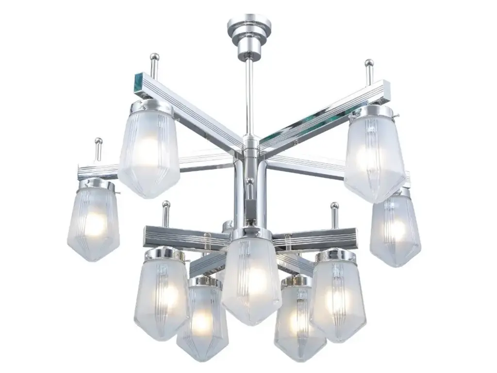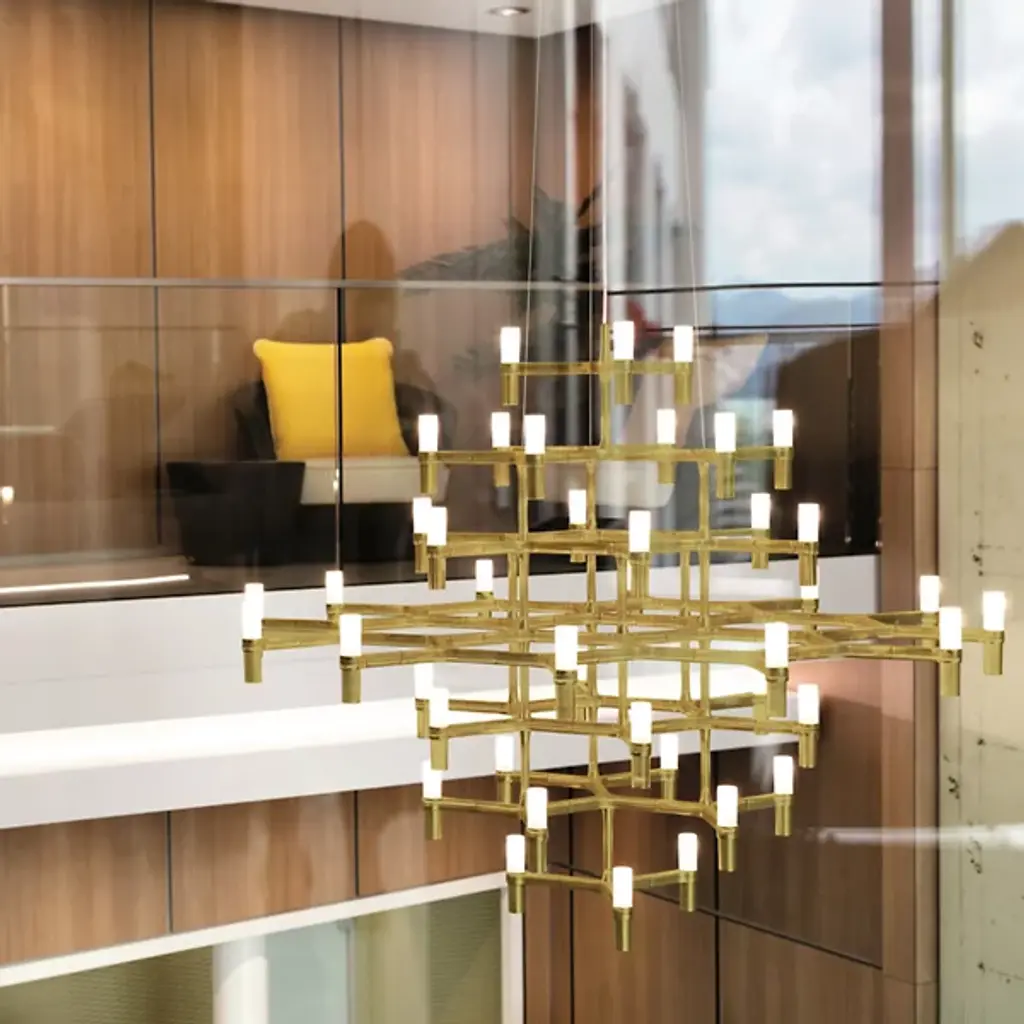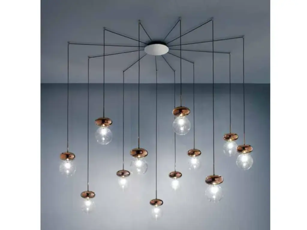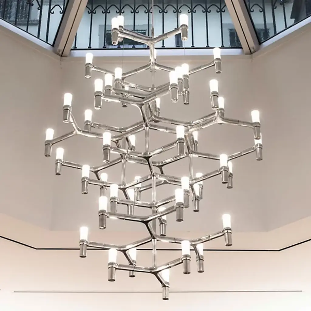 An eccentric, modern twist on classic chandelier design. The Nemo Crown Summa Chandelier features a stunning, die-cast aluminum body that consists of many tripodic lines and illusory hexagonal patterns that shift depending on your point of view. Dotting the end of each line is one of 48 sandblasted, opal-white glass diffusers that, in concert, elicit a widespread, yet warm lighting effect. Includes field-cuttable transparent cables for discreet suspension.