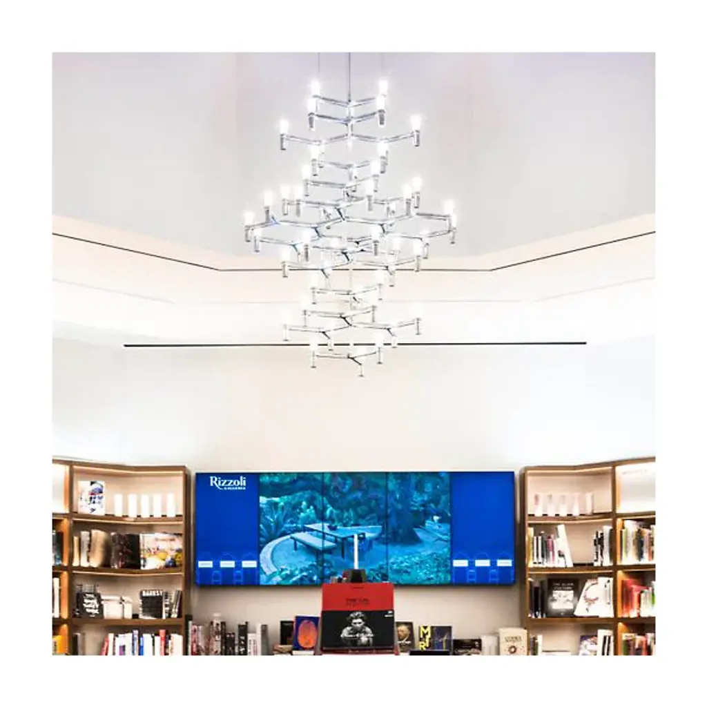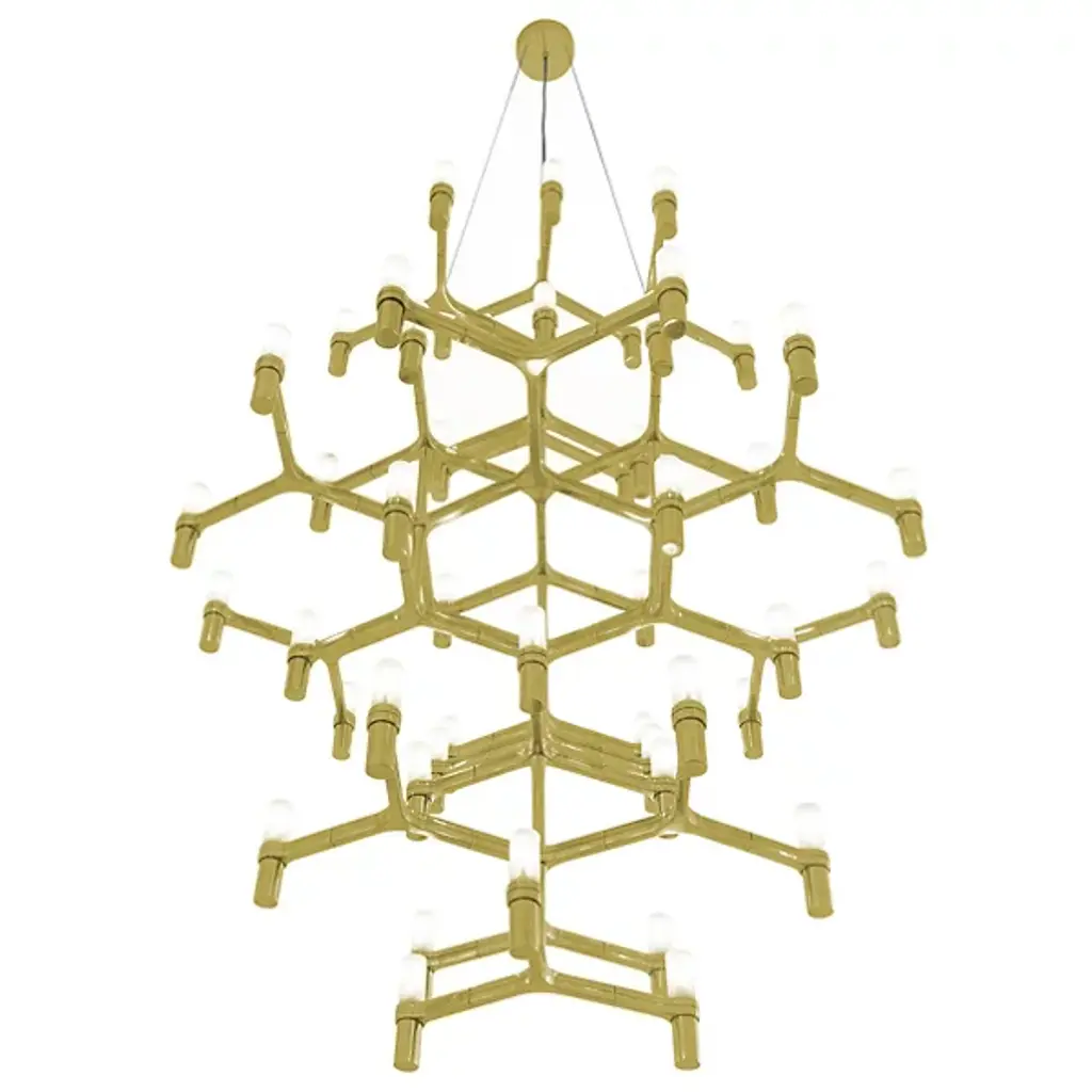 An eccentric, modern twist on classic chandelier design. The Nemo Crown Summa Chandelier features a stunning, die-cast aluminum body that consists of many tripodic lines and illusory hexagonal patterns that shift depending on your point of view. Dotting the end of each line is one of 48 sandblasted, opal-white glass diffusers that, in concert, elicit a widespread, yet warm lighting effect. Includes field-cuttable transparent cables for discreet suspension.