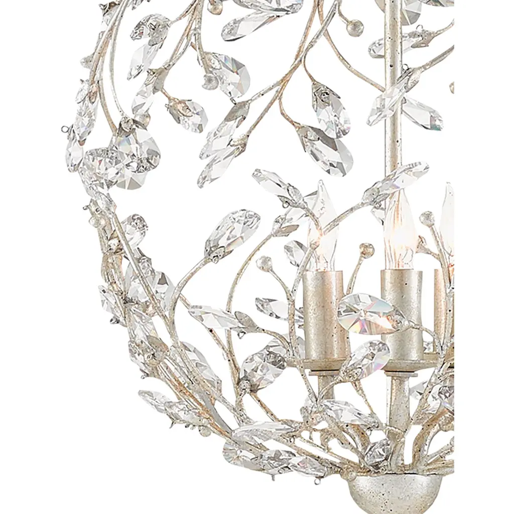 The pleasing attributes of nature merge with the conventions of finely crafted traditional design in the silver version of our romantic Crystal Bud Sphere Chandelier. Delicate faceted crystals unfurl from the silver Granello-finished vines that make up the globe-like body of this idyllic piece. The three-light chandelier is in the Crystal Bud family of fixtures that includes free-form chandeliers in varying sizes and finishes, and a wall sconce.