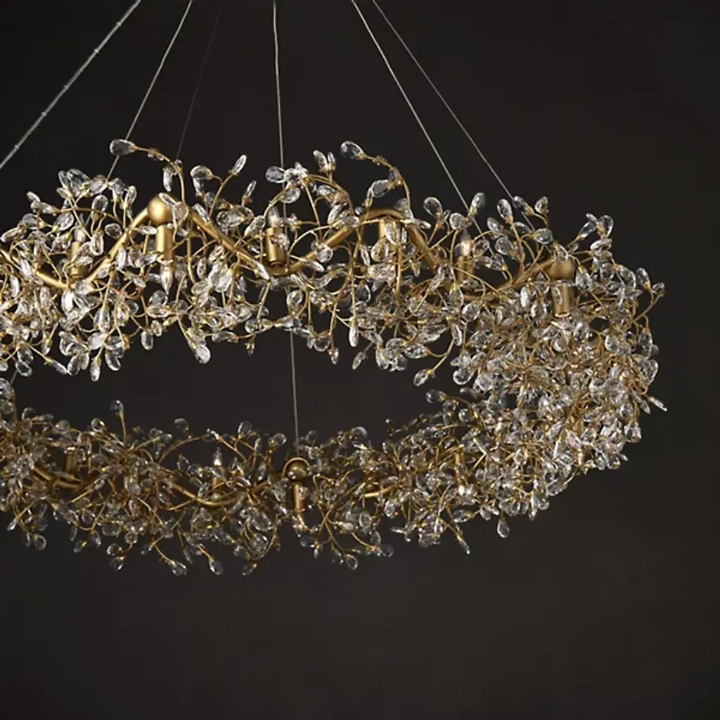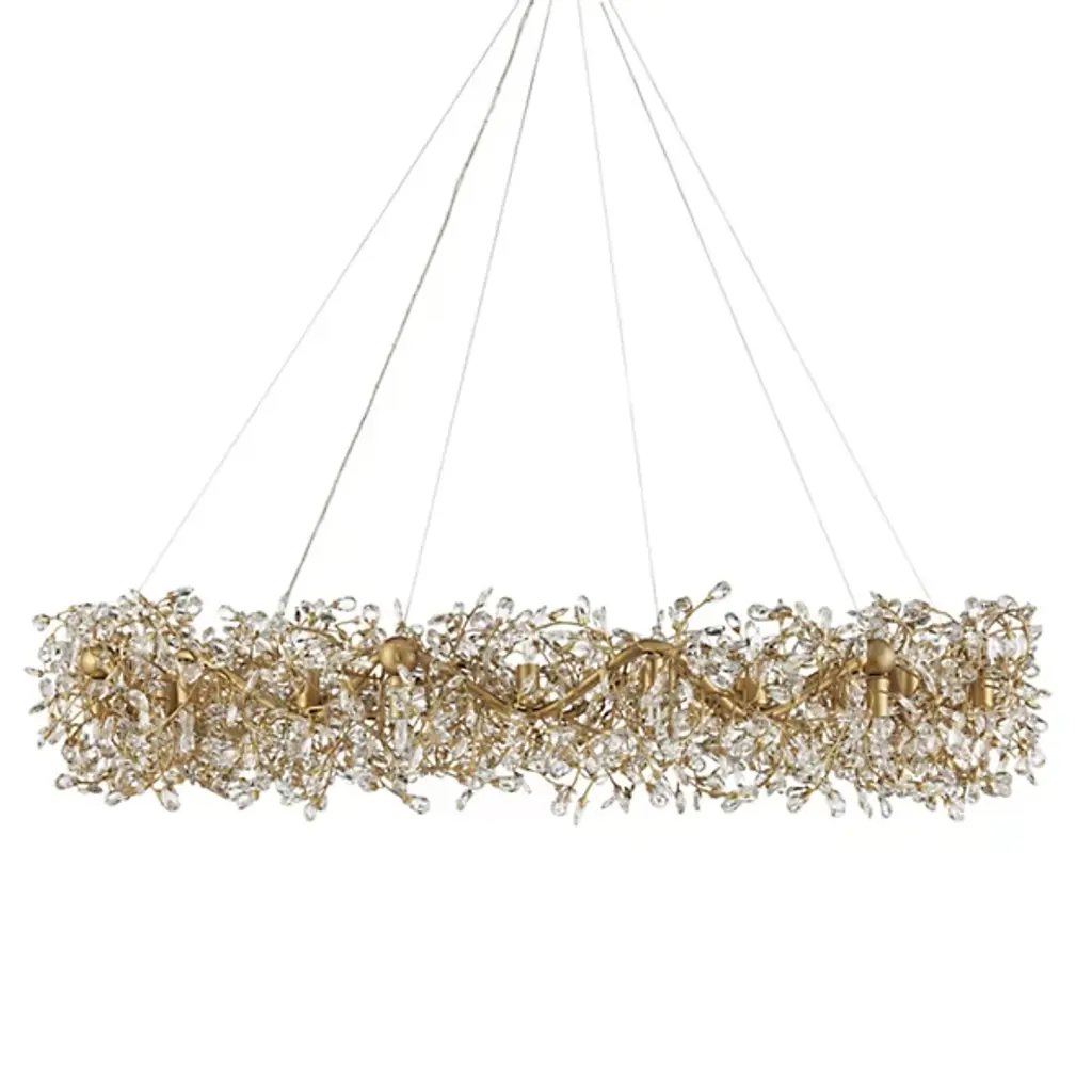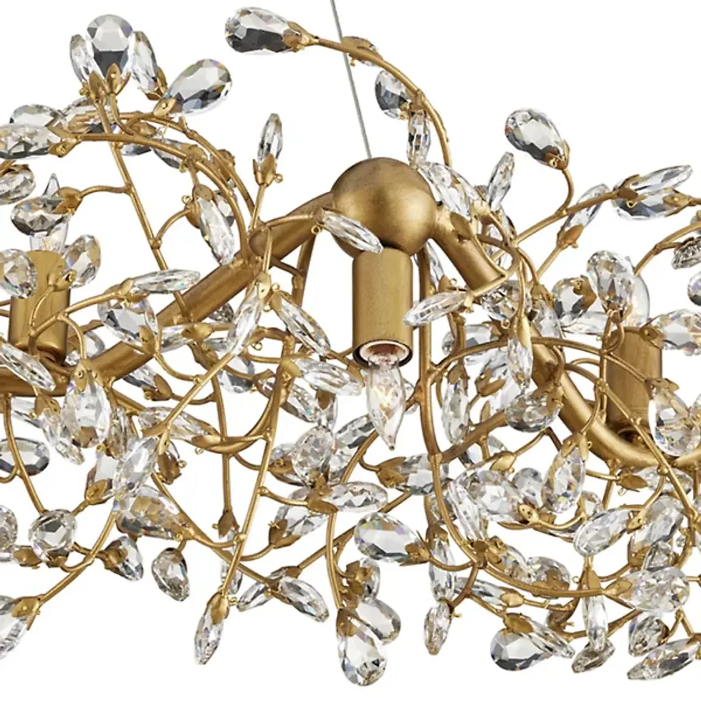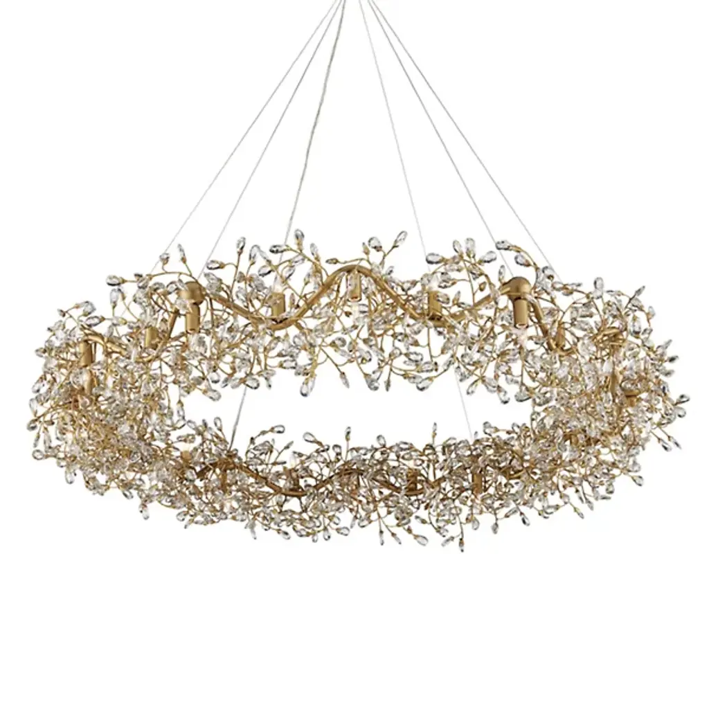 The Crystal Bud Chandelier from Currey & Company is where delicate faceted crystals gracefully unfurl from vines, creating a mesmerizing flow. The gleaming metal, finished in brass, provides a warm contrast to the luminous crystals, resulting in a complex and captivating profile. With a diameter of nearly 50 inches, this stunning crystal chandelier features lights that alternate between pointing up and down, enhancing the sparkle and creating a luxurious ambiance that transforms any room into a radiant haven.