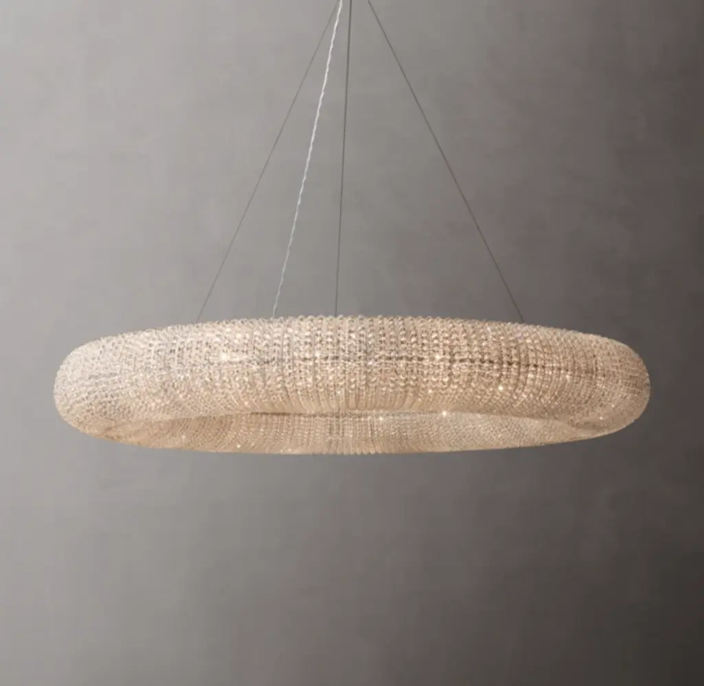Our stunning chandelier was inspired by an antique French design from the 1930s. Thousands of faceted, hand-wrapped crystal glass beads wrap the steel frame to form a floating orb, suspended via a steel cable. The beadwork, reflecting and refracting the interior light, casts a warm glow.SHOP THE ENTIRE COLLECTION